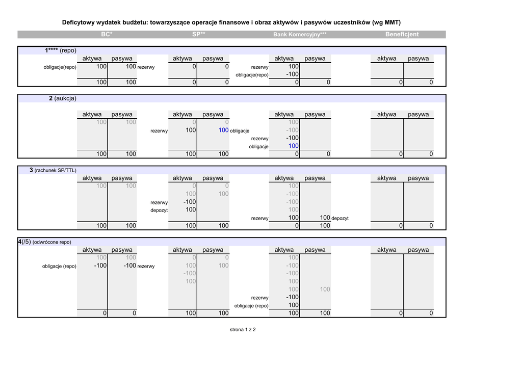 Deficytowy wydatek budżetu: towarzyszące operacje finansowe i obraz aktywów i pasywów uczestników (wg MMT) BC* SP** Bank Komercyjny*** Beneficjent 1**** (repo) obligacje(repo) aktywa pasywa 100 100 rezerwy aktywa pasywa 0 0 rezerwy obligacje(repo) 100 100 0 0 aktywa pasywa 100 -100 0 0 aktywa aktywa pasywa 100 -100 -100 100 0 0 aktywa aktywa pasywa 100 -100 -100 100 100 100 depozyt 0 100 aktywa aktywa pasywa 100 -100 -100 100 100 100 -100 100 100 100 aktywa pasywa 0 0 2 (aukcja) aktywa pasywa 100 100 aktywa rezerwy 0 100 pasywa 0 100 obligacje rezerwy obligacje 100 100 100 100 pasywa 0 0 3 (rachunek SP/TTL) aktywa pasywa 100 100 aktywa rezerwy depozyt pasywa 0 100 -100 100 0 100 100 100 rezerwy 100 100 pasywa 0 0 4(/5) (odwrócone repo) obligacje (repo) aktywa pasywa 100 100 -100 -100 rezerwy aktywa 0 100 -100 100 pasywa 0 100 rezerwy obligacje (repo) 0 0 100 100 strona 1 z 2 pasywa 0 0 5.(/4) (z TTL do BC) aktywa pasywa 100 100 -100 -100 (-100) rezerwy SP (100) rezerwy BK depozyt rezerwy aktywa pasywa 0 100 -100 100 -100 100 0 100 100 100 rezerwy 0 0 aktywa pasywa 100 -100 -100 100 100 100 -100 -100 depozyt 100 -100 0 0 aktywa aktywa pasywa 100 -100 -100 100 100 100 -100 -100 100 -100 100 100 100 100 aktywa pasywa 0 0 6. wydatek aktywa pasywa 100 100 -100 -100 (-100) (100) aktywa rezerwy pasywa 0 100 -100 100 -100 100 -100 0 100 rezerwy EFEKT: 0 0 0 100 <=depozyt=> pasywa 100 100 * Bank Centralny ** Skarb Państwa (US Treasury) ***dla uproszczenia: rachunek zarówno SP, jak i beneficjenta prowadzi ten sam bank, który uczestniczył w aukcji **** Skrócony opis operacji (więcej : mmtpl.wordpress.com/2015/04/28/operacje-finansowe-suwerena/) 1. BC (FED) zawiera umowy repo (odwracalnego skupu papierów dłużnych) celem zasilenia stanu rezerw w systemie przed aukcją. 2. Uprawnione jednostki reprezentujące banki dokonują zakupu nowej emisji rządowych papierów dłużnych 3. Rachunek rozliczeniowy SP (Treasury) – TTL account – zostaje zasilony kwotą uzyskaną z aukcji 4. BC realizuje 2 część umowy repo (odsprzedaje zakupione wcześniej papiery) 5. SP zasila swoje konto w BC (FED) z rachunku rozliczeniowego TTL 6. SP zleca wykonanie wydatku – BC uznaje r-k rezerw BK, a ten z kolei tworzy depozyt dla beneficjenta. mmtpl.wordpress.com strona 2 z 2 0