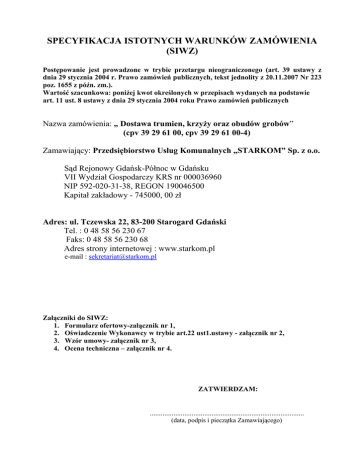 SPECYFIKACJA ISTOTNYCH WARUNKÓW ZAMÓWIENIA (SIWZ) Postępowanie jest prowadzone w trybie przetargu nieograniczonego (art. 39 ustawy z dnia 29 stycznia 2004 r. Prawo zamówień publicznych, tekst jednolity z 20.11.2007 Nr 223 poz. 1655 z późn. zm.). Wartość szacunkowa: poniŜej kwot określonych w przepisach wydanych na podstawie art. 11 ust. 8 ustawy z dnia 29 stycznia 2004 roku Prawo zamówień publicznych Nazwa zamówienia: „ Dostawa trumien, krzyŜy oraz obudów grobów” (cpv 39 29 61 00, cpv 39 29 61 00-4) Zamawiający: Przedsiębiorstwo Usług Komunalnych „STARKOM” Sp. z o.o. Sąd Rejonowy Gdańsk-Północ w Gdańsku VII Wydział Gospodarczy KRS nr 000036960 NIP 592-020-31-38, REGON 190046500 Kapitał zakładowy - 745000, 00 zł Adres: ul. Tczewska 22, 83-200 Starogard Gdański Tel. : 0 48 58 56 230 67 Faks: 0 48 58 56 230 68 Adres strony internetowej : www.starkom.pl e-mail : [email protected] Załączniki do SIWZ: 1. Formularz ofertowy-załącznik nr 1, 2. Oświadczenie Wykonawcy w trybie art.22 ust1.ustawy - załącznik nr 2, 3. Wzór umowy- załącznik nr 3, 4. Ocena techniczna – załącznik nr 4. ZATWIERDZAM: ..................................................................................... (data, podpis i pieczątka Zamawiającego) CZĘŚĆ OPISOWA 1. Określenie przedmiotu zamówienia Postępowanie prowadzone jest w trybie przetargu nieograniczonego na podstawie art. 10 ust oraz 39 - 46 ustawy z dnia 29 stycznia 2004r. Prawo zamówień publicznych (Tekst jednolity z dnia 8 czerwca 2010, Dz. U. Nr 113, poz.759 z późn. zm. zwanej dalej Pzp) poniŜej równowartości kwoty określonej w przepisach wykonawczych wydanych na podstawie art. 11 ust. 8 ustawy. Przedmiotem zamówienia jest „Dostawa trumien, krzyŜy oraz obudów grobów” Nomenklatura: (CPV 39296100-4, 39296100.) Dla Zamawiającego: Przedsiębiorstwo Usług Komunalnych „STARKOM” Sp. z o.o. ul. Tczewska 22, 83-200 Starogard Gdański Tel. : 0 48 58 56 230 67 Faks : 0 48 58 56 230 68 Strona internetowa, na której zamieszczona będzie SIWZ: www.starkom.pl 2. Szczegółowy opis przedmiotu zamówienia: Przedmiotem zamówienia jest dostawa (w rozumieniu art. 2 pkt. 2 ustawy Prawo zamówień publicznych): trumien, krzyŜy i obudów grobów. A. Opis przedmiotu zamówienia I. Trumny: - wieko, boki wykonane z drewna litego liściastego twardego i miękkiego lub iglastego, sezonowanego suchego, klasy I o gr. min. 22mm poddanego pełnej obróbce stolarskiej , krawędzie elementów zaokrąglone, - trumna musi posiadać pełne wyposaŜenie: poduszkę wnętrze wybite materiałem atłasowym, koronki, okucia i uchwyty metalowe, wizerunek metalizowany, - dno i poduszka z warstwą materiału chłonnego, - dno i ścianki boczne nieprzepuszczalne, szczelnie przylegające wieko, - powierzchnie zewnętrzne malowane minimum dwa razy lakierem, metodą natryskową, - nie dopuszcza się jakichkolwiek uchybień w wykonaniu powłoki lakierniczej - śladów szlifowania, przebarwień, zacieków, pęknięć, pęcherzy, odprysków i nierówności, - łączenia poszczególnych elementów drewnianych muszą być dobrze spasowane bez widocznych pęknięć, szczelin, 2 - dno wykonane z poprzecznych desek zabezpieczonych listwą przed ich wypadaniem, nie moŜe posiadać Ŝadnych szczelin, - waga trumny dębowej dla osoby dorosłej powinna wynosić od 59 do 61 kg. - waga trumny z drewna liściastego dla osoby dorosłej 45kg, - trumna kremacyjna wykonana z drzewa miękkiego liściastego nie moŜe posiadać elementów metalowych ani lakierowania. II. KrzyŜe, obudowy grobów, słupek nagrobny - Wykonane z drewna iglastego, suszonego, sezonowanego, klasy, co najmniej II, - Malowane minimum 2 razy, - Elementy dobrze spasowane bez widocznych pęknięć, szczelin. III. Wykaz przedmiotu zamówienia i jego indywidualna charakterystyka Podane wymiary co do długości , szerokości i wysokości mogą się róŜnić w ofercie o ± 10 cm, 1. KrzyŜ zwykły - orientacyjna ilość w ciągu roku 110 szt., - ramię dłuŜsze 180 cm, - ramię krótsze 55 cm, - szerokość ramion 7 cm, Malowany w kolorach zbliŜonych do dostarczonych kolorów trumien 2. KrzyŜ mały – orientacyjna ilość w ciągu roku 10 szt., - ramię dłuŜsze – 150 cm, - ramię krótsze – 45 cm, - szerokość ramion – 5 cm, Malowany na biało. 3. Słupek nagrobny - orientacyjna ilość w ciągu roku 5 szt., - wymiary- długość 180 cm, - szerokość 6 cm, Malowany w kolorach zbliŜonych do dostarczonych kolorów trumien 4. Obudowa grobu duŜa – orientacyjna ilość w ciągu roku 60 szt., - wymiar dolny / przy podstawie/ - długość - 185cm, - szerokość – 65 cm, - wysokość – 30 cm, 3 - wymiar górny – długość – 170 cm, - szerokość - 60cm 5. Obudowa grobu mała – orientacyjna ilość w ciągu roku 30 szt., - Wymiary obudowy będą określane indywidualnie przy kaŜdym zamówieniu. 6. Trumna mała na płód, dla noworodka, dla dziecka, młodzieŜowa – orientacyjna ilość w ciągu roku 10 szt., w zaleŜności od potrzeb, Wykonana z drzewa liściastego. Dokładny wymiar i kolor będzie określony przy kaŜdym zamówieniu. Trumna i wieko wybite atłasem i koronką dekoracyjną. 7. Trumna duŜa - orientacyjna ilość w ciągu roku 110 szt., - drewno – iglaste lub liściaste, miękkie lub twarde, - długość – 210 cm, - szerokość – 70 cm, - wysokość – 55 cm, Wieko przykręcane min. 4 wkrętkami dekoracyjnymi, dno, boki i wieko wybite atłasem z koronką. 8. Trumna nietypowa 2 wzory - orientacyjna ilość w ciągu roku 10 szt., Wymiary wzór 1: - długość 220 cm, - szerokość 75 cm, - wysokość 55 cm, Wymiary wzór 2: - długość 205 cm, - szerokość 85 cm, - wysokość 55 cm, Drewno iglaste lub liściaste wg zamówienia, polakierowana lakierem, spód trumny wykonany z desek struganych. Wymiary trumny będą określane indywidualnie przy kaŜdym zamówieniu. Wieko przykręcane min. 4 wkrętkami dekoracyjnymi, dno, boki i wieko wybite a