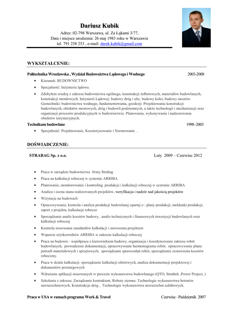 Dariusz Kubik Adres: 02-798 Warszawa, ul. Za Łąkami 3/77, Data i miejsce urodzenia: 26 maj 1983 roku w Warszawie tel. 791 258 253 , e-mail: [email protected] WYKSZTAŁCENIE: Politechnika Wrocławska , Wydział Budownictwa Lądowego i Wodnego 2003-2008 Kierunek: BUDOWNICTWO Specjalność: Inżynieria lądowa. Zdobyłem wiedzę z zakresu budownictwa ogólnego, konstrukcji żelbetowych, materiałów budowlanych, konstrukcji metalowych. Inżynierii Lądowej: budowy dróg i ulic, budowy kolei, budowy mostów. Geotechniki: budownictwa wodnego, fundamentowania, geodezji. Projektowania konstrukcji budowlanych, obiektów mostowych, dróg i budowli podziemnych, a także technologii i mechanizacji oraz organizacji procesów produkcyjnych w budownictwie. Planowania, wykonywania i nadzorowania obiektów inżynieryjnych. Technikum budowlane 1998–2003 Specjalność: Projektowanie, Kosztorysowanie i Normowanie . DOŚWIADCZENIE: STRABAG Sp. z o.o. Luty 2009 – Czerwiec 2012 Praca w zarządzie budownictwa firmy Strabag Praca na kalkulacji roboczej w systemie ARRIBA Planowanie, monitorowanie i kontroling produkcji i kalkulacji roboczej w systemie ARRIBA Analiza i ocena stanu realizowanych projektów, weryfikacja i nadzór nad jakością projektów Wizytacje na budowach Opracowywanie, kontrola i analiza produkcji budowlanej opartej o : plany produkcji, meldunki produkcji, raport z projektu, kalkulacje robocze Sporządzanie analiz kosztów budowy, analiz technicznych i finansowych inwestycji budowlanych oraz kalkulacji roboczej Kontrola stosowania standardów kalkulacji i sterowania projektem Wsparcie użytkowników ARRIBA w zakresie kalkulacji roboczej Praca na budowie : współpraca z kierownikiem budowy, organizacja i koordynowanie zakresu robót budowlanych, prowadzenie dokumentacji, opracowywanie harmonogramu robót, opracowywanie planu potrzeb materiałowych i sprzętowych, sporządzanie sprawozdań robót, sporządzanie zestawienia kosztów robocizny. Praca w dziale kalkulacji: sporządzanie kalkulacji ofertowych, analiza dokumentacji projektowej i dokumentów przetargowych Wdrażanie aplikacji stosowanych w procesie wykonawstwa budowlanego (QTO, Strathek ,Power Project, ) Szkolenia z zakresu: Zarządzanie kontraktem, Roboty ziemne, Technologie wykonawstwa betonów nawierzchniowych, Konstrukcje dróg , Technologie wykonawstwa nawierzchni asfaltowych. Praca w USA w ramach programu Work & Travel Czerwiec –Październik 2007 „INTAKUS S.A.’’ WROCŁAW Inżynier Budowlany Praca w biurze: wykonywałem rysunki, obliczenia, kosztorysy domków jednorodzinnych; 2006 (wrzesień-listopad) „INTAKUS S.A.’’ WROCŁAW Inżynier Budowlany Prowadziłem nadzór nad pracownikami, Koordynowałem realizację procesu budowy osiedla domków jednorodzinnych, Byłem odpowiedzialny za sprawy formalne na budowie i dokumentacji, Przygotowanie kosztów, szacowanie materiałów i harmonogramowanie. Zamawiałem i fakturowałem, Zastępowałem kierownika podczas jego nieobecności, Kontrolowałem stany magazynowe i daty ważności materiałów. Praca przy przebudowie ZS nr 2 w Ostrowcu Św. 2006 (maj-wrzesień) Czerwiec- Lipiec 2003 OSTROWIECKI KOMBINAT BUDOWLANY S.A. w Ostrowcu Świętokrzyskim Praktyka wykonawcza i biurowa w technikum budowlanym Praktyka w biurze: zapoznawanie się z pracą architekta i konstruktora budowlanego oraz funkcjonowaniem biura projektowego Praktyka na budowie : praca przy wznoszeniu hali sportowej w Sandomierzu. 2001/2003 DODATKOWE KWALIFIKACJE: Kompetencje i Umiejętności: Precyzja, wyobraźnia przestrzenna, ścisłość myślenia i działania, Dobra znajomość prawa budowlanego, branży elektroenergetycznej, grzewczo-wentylacyjnej i sanitarnej, Umiejętność czytania i tworzenia rysunków technicznych i projektów, Komunikatywność, umiejętność pracy w zespole, Zdolność do pracy pod presją czasu i bez nadzoru przełożonego, Dobra znajomość (MS Office, AutoCad, QTO, ARRIBA, Strathek, MathCad , CosmosM, RobotM, Norma Pro ) Wielozadaniowość i umiejętności organizacyjne w dynamicznym środowisku pracy, Niezawodny i elastyczny w stanie dostosować się do różnych ról, Prawo jazdy kat. B Znajomość języków obcych: Angielski – średnio – zaawansowany Niemiecki – podstawowy (nauka zakończona w technikum). ZAINTERESOWANIA: Budownictwo, architektura, psychologia, rysowanie, malarstwo, gospodarka, odnawialne źródła energii, darmowa energia, alternatywne rozwiązania techniczne, giełda papierów wartościowych, ekonomia, biznes, sport, muzyka, podróże, sztuka, motoryzacja. „Oświadczam, że wyrażam zgodę na przetwarzanie moich danych osobowych zawartych w ofercie pracy dla potrzeb rekrutacji, zgodnie z ustawą z dnia 29.08.1997 r. o ochronie danych osobowych (DZ.U. 2002 r. Nr 101, poz. 926 ze zm.)”