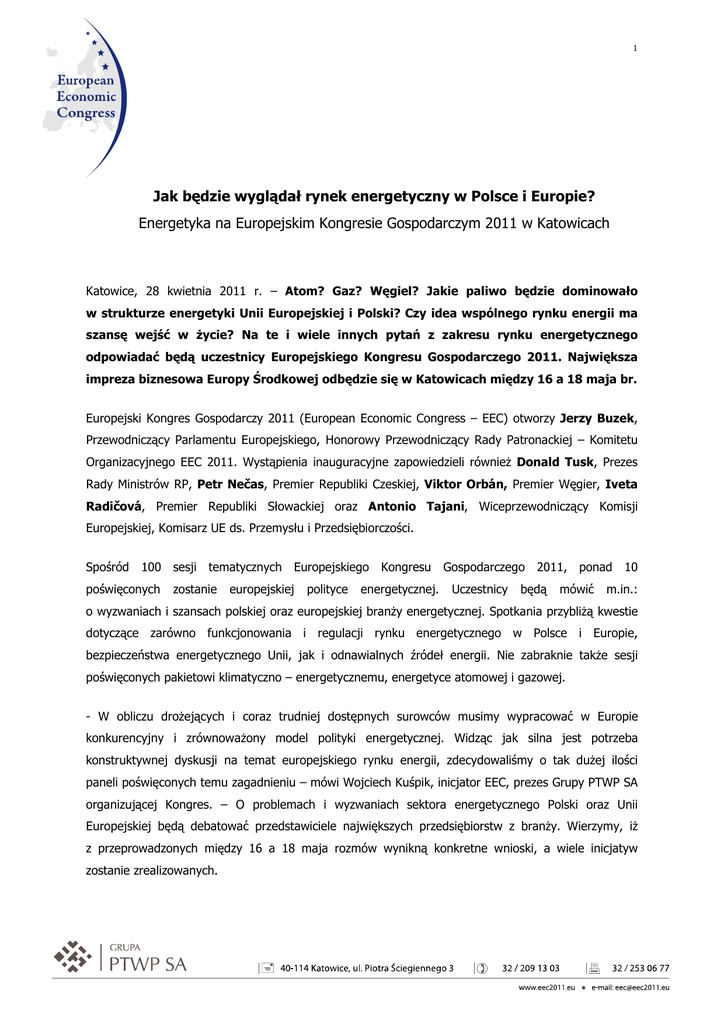 1 Jak będzie wyglądał rynek energetyczny w Polsce i Europie? Energetyka na Europejskim Kongresie Gospodarczym 2011 w Katowicach Katowice, 28 kwietnia 2011 r. – Atom? Gaz? Węgiel? Jakie paliwo będzie dominowało w strukturze energetyki Unii Europejskiej i Polski? Czy idea wspólnego rynku energii ma szansę wejść w Ŝycie? Na te i wiele innych pytań z zakresu rynku energetycznego odpowiadać będą uczestnicy Europejskiego Kongresu Gospodarczego 2011. Największa impreza biznesowa Europy Środkowej odbędzie się w Katowicach między 16 a 18 maja br. Europejski Kongres Gospodarczy 2011 (European Economic Congress – EEC) otworzy Jerzy Buzek, Przewodniczący Parlamentu Europejskiego, Honorowy Przewodniczący Rady Patronackiej – Komitetu Organizacyjnego EEC 2011. Wystąpienia inauguracyjne zapowiedzieli równieŜ Donald Tusk, Prezes Rady Ministrów RP, Petr Nečas, Premier Republiki Czeskiej, Viktor Orbán, Premier Węgier, Iveta Radičová, Premier Republiki Słowackiej oraz Antonio Tajani, Wiceprzewodniczący Komisji Europejskiej, Komisarz UE ds. Przemysłu i Przedsiębiorczości. Spośród 100 sesji tematycznych Europejskiego poświęconych zostanie europejskiej polityce Kongresu Gospodarczego 2011, ponad energetycznej. Uczestnicy będą mówić 10 m.in.: o wyzwaniach i szansach polskiej oraz europejskiej branŜy energetycznej. Spotkania przybliŜą kwestie dotyczące zarówno funkcjonowania i regulacji rynku energetycznego w Polsce i Europie, bezpieczeństwa energetycznego Unii, jak i odnawialnych źródeł energii. Nie zabraknie takŜe sesji poświęconych pakietowi klimatyczno – energetycznemu, energetyce atomowej i gazowej. - W obliczu droŜejących i coraz trudniej dostępnych surowców musimy wypracować w Europie konkurencyjny i zrównowaŜony model polityki energetycznej. Widząc jak silna jest potrzeba konstruktywnej dyskusji na temat europejskiego rynku energii, zdecydowaliśmy o tak duŜej ilości paneli poświęconych temu zagadnieniu – mówi Wojciech Kuśpik, inicjator EEC, prezes Grupy PTWP SA organizującej Kongres. – O problemach i wyzwaniach sektora energetycznego Polski oraz Unii Europejskiej będą debatować przedstawiciele największych przedsiębiorstw z branŜy. Wierzymy, iŜ z przeprowadzonych między 16 a 18 maja rozmów wynikną konkretne wnioski, a wiele inicjatyw zostanie zrealizowanych. 2 W dyskusjach dedykowanych energetyce udział wezmą m.in.: Bernard Błaszczyk, Podsekretarz Stanu, Ministerstwo Gospodarki; Mikołaj Budzanowski, Podsekretarz Stanu, Ministerstwo Skarbu Państwa; Aleksander Grad, Minister Skarbu Państwa; Andrzej Kraszewski, Minister Środowiska; Waldemar Pawlak, Wicepremier, Minister Gospodarki RP; Krystian Takac, Sekretarz Stanu, Ministerstwo Gospodarki Słowacji i Günter Verheugen- Komisarz UE Komisarz ds. Przedsiębiorstw i Przemysłu w latach 2004-2010, Komisarz UE ds. Rozszerzenia w latach 1999-2004. Ponadto w kongresowych obradach zabiorą głos prezesi zarządów największych przedsiębiorstw z sektora energetyki, takich jak m.in.: Philippe Castanet, Prezes EDF Polska; Grzegorz Górski, Prezes Zarządu, GDF SUEZ Energia Polska; Marco Graziano, Senior Vice President, Business, Development, International&Marketing, AREVA; Petr Ivanek, Prezes Zarządu, CEZ Polska; Dariusz Lubera, Prezes Zarządu, Dyrektor Generalny Tauron Polska Energia SA; Paweł Olechnowicz, Prezes Zarządu, Dyrektor Generalny Grupa Lotos SA; Grzegorz Onichimowski, Prezes Zarządu, Towarowa Giełda Energii; Maciej Owczarek, Prezes Zarządu ENEA SA; Graeme Sweeney, Przewodniczący Rady Doradczej Europejskiej Platformy Zeroemisyjnej (ETP-ZEP), Wiceprezes Wykonawczy ds. CO2, Shell International Petroleum Company Ltd; Filip Thon, Prezes, RWE Polska, Członek Zarządu, RWE East i Tomasz Zadroga, Prezes Zarządu PGE Polska Grupa Energetyczna. Europejski Kongres Gospodarczy 2011 w Katowicach to największa impreza biznesowa w Europie Środkowej. W 100 sesjach tematycznych, debatach i wydarzeniach towarzyszących weźmie udział około 4500 gości z Polski i z zagranicy. *** Organizatorem Europejskiego Kongresu Gospodarczego jest Grupa PTWP SA wydawca m.in. miesięcznika Nowy Przemysł oraz portalu WNP.pl. Współorganizatorami EEC są: Województwo Śląskie, Górnośląski Związek Metropolitalny oraz Miasto Katowice. Więcej informacji o Europejskim Kongresie Gospodarczym 2011 - www.eec2011.eu Zapraszamy równieŜ: Facebook: http://www.facebook.com/EECKatowice Twitter: https://twitter.com/EECKatowice Blip: http://eeckatowice.blip.pl/ Wirtualne biuro prasowe: http://media.eec2011.eu/ 3 ### Akredytację dziennikarską moŜna uzyskać tylko do 9 maja br. poprzez rejestrację na stronie http://www.eec2011.eu/akredytacja/ Dodatkowe informacje: Marta Stach, Imago PR Rzecznik Prasowy EEC 2011 Tel. 609 808 119 [email protected]