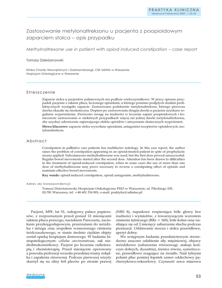 PRAKTYKA KLINICZNA Medycyna Paliatywna 2009; 1: 53–56 Zastosowanie metylonaltreksonu u pacjenta z poopioidowym zaparciem stolca – opis przypadku Methylnaltrexone use in patient with opiod induced constipation – case report Tomasz Dzierżanowski Klinika Chorób Wewnętrznych i Gastroenterologii, CSK MSWiA w Warszawie Hospicjum Onkologiczne w Warszawie Streszczenie Zaparcie stolca u pacjentów paliatywnych ma podłoże wieloczynnikowe. W pracy opisano przypadek pacjenta z rakiem płuca, leczonego opioidami, u którego pomimo podjętych działań profilaktycznych wystąpiło zaparcie. Zastosowano podskórnie metylonaltrekson, którego pierwsza dawka okazała się nieskuteczna. Dopiero po zastosowaniu drugiej dawki u pacjenta uzyskano regularne wypróżnienia. Zwrócono uwagę na trudności w leczeniu zaparć poopioidowych i konieczność zastosowania w niektórych przypadkach więcej niż jednej dawki metylonaltreksonu, aby uzyskać odwrócenie zapierającego efektu opioidów i utrzymanie skutecznych wypróżnień. Słowa kluczowe: zaparcie stolca wywołane opioidami, antagoniści receptorów opioidowych, metylonaltrekson. Abstract Constipation in palliative care patients has multifactor aetiology. In this case report, the author raises the problem of constipation appearing in an opioid-treated patient in spite of prophylactic means applied. Subcutaneous methylnaltrexone was used, but the first dose proved unsuccessful. Regular bowel movements started after the second dose. Attention has been drawn to difficulties in the treatment of opioid-induced constipation, when in some cases the use of more than one dose of methylnaltrexone may prove necessary to reverse a constipating effect of opioids and maintain effective bowel movements. Key words: opioid-induced constipation, opioid antagonists, methylnaltrexone. Adres do korespondencji: Tomasz Dzierżanowski, Hospicjum Onkologiczne FHO w Warszawie, ul. Pileckiego 105, 02-781 Warszawa, tel. +48 601 334 001; e-mail: [email protected] Pacjent, MW, lat 51, nałogowy palacz papierosów, z rozpoznanym przed ponad 12 miesiącami rakiem płuca prawego, naciekiem Pancoasta, naciekiem przykręgosłupowym, przerzutami do móżdżku i mózgu oraz zespołem wzmożonego ciśnienia śródczaszkowego, w stanie średnio ciężkim objęty został opieką hospicjum domowego. W badaniu histopatologicznym: cellulae carcinomatosae, rak niedrobnokomórkowy. Pacjent po leczeniu radioterapią i chemioterapią. Przed miesiącem operowany z powodu perforacji wrzodu przedniej ściany żołądka i zapalenia otrzewnej. Podczas pierwszej wizyty skarżył się na silny ból pleców po stronie prawej (NRS 8), napadowe rozpierające bóle głowy bez nudności i wymiotów, z towarzyszącym wzrostem ciśnienia tętniczego (RRs > 160), bóle kolan oraz nasilające się od 2 miesięcy zaburzenia słuchu podczas pionizacji. Oddawanie moczu i stolca prawidłowe, apetyt dobry. We wstępnym badaniu przedmiotowym stwierdzono znaczne osłabienie siły mięśniowej, objawy móżdżkowe (zaburzenia równowagi, ataksja kończyn dolnych, dyzartria), źrenice równe, symetryczne, prawidłowo reagujące na światło. Nad tylnymi polami płuc poniżej łopatek szmer oddechowy pęcherzykowo-oskrzelowy. Czynność serca miarowa 53 Tomasz Dzierżanowski 80/min, tony średnio głośne, RR 116/78. Brzuch miękki, niebolesny, bez objawów otrzewnowych, ze słyszalną perystaltyką; blizna pooperacyjna w linii pośrodkowej ciała. Brak obrzęków obwodowych. W badaniu laboratoryjnym krwi poza umiarkowaną leukocytozą (12,1 G/l) nie zaobserwowano odchyleń w morfologii krwi i badaniach biochemicznych (Hb 14,5 g/dl, E 4,48 T/l, Na 142, K 4,0, glikemia 146 mg%). W badaniu TK sprzed 4 miesięcy widoczne cechy obrzęku mózgu lewej półkuli i przemieszczenie układu komorowego na stronę prawą. W chwili objęcia opieką pacjent przyjmował paracetamol z kodeiną (Efferalgan Codeine) 6–8 tabl./ /dobę, deksametazon 2–2–1 mg p.o., omeprazol 10–10–0 mg, ranitydynę 300 mg wieczorem oraz estazolam 2 mg/noc. Z powodu nieskutecznej terapii bólu odstawiono paracetamol z kodeiną i włączono morfinę o kontrolowanym czasie uwalniania (MST Continus), rozpoczynając od 2 × 10 mg do 2 × 40 mg, uzyskując dobry efekt analgetyczny. Wraz z włączeniem morfiny zastosowano profilaktycznie laktulozę 2 × 15 ml oraz metoklopramid 3 × 10 mg p.o. Rodzinie udzielono porady dietetycznej dotyczącej profilaktyki przeciwzaparciowej. Z uwagi na powtarzające się epizody zespołu wzmożonego ciśnienia śródczaszkowego dostosowywano deksametazon w zakresie 4–12 mg/dobę oraz dawki interwencyjne 16 mg i.v. Włączono początkowo torasemid p.o., a następnie furosemid i.v. Zwiększono dawkę omeprazolu do 2 × 20 mg. Po 4 tyg. wystąpiły napady sztywności, z bezwiednym oddaniem moczu i utratą przytomności. Po kilku dniach, po włączeniu kwasu walproinowego (Depakine Chrono 2 × 250 mg) oraz podwyższeniu dawki deksametazonu napady ustąpiły. Od początku obserwacji pacjentowi towarzyszyły: obniżony nastrój, zaburzenia koncentracji, utrata zainteresowań, trudności w zasypianiu, częste wybudzanie się z wędrowaniem po domu, pomimo stosowania estazolamu, oraz napady agresji. Włączono mianserynę i pramolan. Pacjenta i rodzinę objęto opieką psychoterapeuty. Z uwagi na występowanie czynników ryzyka choroby zakrzepowo-zatorowej (choroba nowotworowa mózgu, unieruchomienie) przez cały czas opieki stosowano profilaktykę przeciwzakrzepową (dalteparyna). Pacjent poddany został również rehabilitacji ruchowej. Od pierwszej wizyty monitorowano masę ciała. W wywiadzie zanotowano, że pacjent ważył 68 kg (spadek z ok. 95 kg), w rzeczywistości jednak podczas pierwszej wizyty masa ciała wynosiła 65 kg. Włączono leczenie żywieniowe (Protifar, odżywki bogatobłonnikowe) oraz megestrol, uzyskując podczas opieki stabilną masę ciała 65,9 kg. 54 Po ok. 14 dniach od włączenia morfiny w