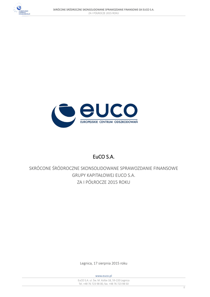 SKRÓCONE SRÓDROCZNE SKONSOLIDOWANE SPRAWOZDANIE FINANSOWE GK EUCO S.A. ZA I PÓŁROCZE 2015 ROKU EuCO S.A. SKRÓCONE ŚRÓDROCZNE SKONSOLIDOWANE SPRAWOZDANIE FINANSOWE GRUPY KAPITAŁOWEJ EUCO S.A. ZA I PÓŁROCZE 2015 ROKU Legnica, 17 sierpnia 2015 roku www.euco.pl EuCO S.A. ul. Św. M. Kolbe 18, 59-220 Legnica Tel. +48 76 723 98 00, fax. +48 76 723 98 50 0 SKRÓCONE SRÓDROCZNE SKONSOLIDOWANE SPRAWOZDANIE FINANSOWE GK EUCO S.A. ZA I PÓŁROCZE 2015 ROKU Spis treści 1. Podstawa sporządzenia .............................................................................................................................................................. 4 2. Podstawowe dane o Grupie ....................................................................................................................................................... 7 3. Zmiany w strukturze jednostki gospodarczej .......................................................................................................................... 12 4. Wybrane dane finansowe zawierające podstawowe pozycje skróconego śródrocznego skonsolidowanego sprawozdania finansowego ............................................................................................................................................................................. 13 5. Polityka rachunkowości ............................................................................................................................................................ 14 6. Skrócone śródroczne skonsolidowane sprawozdanie finansowe za I półrocze 2015 roku ................................................... 25 7. 6.1. Skrócone śródroczne skonsolidowane sprawozdanie z całkowitych dochodów ...................................................... 25 6.2. Skrócone śródroczne skonsolidowane sprawozdanie z sytuacji finansowej ............................................................ 26 6.3. Skrócony śródroczny skonsolidowany rachunek zysków i strat................................................................................. 27 6.4. Skrócone śródroczne skonsolidowane sprawozdanie z przepływów pieniężnych ................................................... 27 6.5. Skrócone śródroczne skonsolidowane sprawozdanie ze zmian w kapitale własnym .............................................. 28 Wybrane istotne noty objaśniające do skróconego śródrocznego skonsolidowanego sprawozdania finansowego .......... 29 7.1. Skrócone śródroczne skonsolidowane koszty rodzajowe .......................................................................................... 29 7.2. Skrócone śródroczne skonsolidowane pozostałe przychody i koszty operacyjne .................................................... 29 7.3. Skrócone śródroczne skonsolidowane przychody i koszty finansowe ...................................................................... 30 7.4. Skonsolidowany zysk na akcję..................................................................................................................................... 30 7.5. Skrócone śródroczne skonsolidowane rzeczowe aktywa trwałe .............................................................................. 31 7.6. Skrócone śródroczne skonsolidowane aktywa z tytułu odroczonego podatku dochodowego ............................... 34 7.7. Skrócone śródroczne skonsolidowane należności z tytułu dostaw i usług oraz pozostałe należności ................... 34 7.7.1 skrócone śródroczne skonsolidowane długoterminowe należności ........................................................................ 34 7.7.2 skrócone śródroczne skonsolidowane krótkoterminowe należności ....................................................................... 35 7.8. Skrócone śródroczne skonsolidowane zapasy ........................................................................................................... 36 7.9. Skrócone śródroczne skonsolidowane rezerwy z tytułu odroczonego podatku dochodowego ............................. 36 7.10. Skrócone śródroczne skonsolidowane zobowiązania z tytułu świadczeń pracowniczych oraz rezerwy na pozostałe zobowiązania i inne obciążenia .................................................................................................................................. 37 7.11. Skrócone śródroczne skonsolidowane zobowiązania długoterminowe z tytułu dostaw i usług oraz pozostałe .... 37 7.12. Skrócone śródroczne skonsolidowane zobowiązania krótkoterminowe z tytułu dostaw i usług oraz pozostałe ... 37 7.13. Inne korekty w skróconym śródrocznym skonsolidowanym sprawozdaniu z przepływów pieniężnych ................. 38 7.14. Transakcje z podmiotami powiązanymi...................................................................................................................... 38 7.14.1. Należności długoterminowe z podmiotami powiązanymi w tym pożyczki .............................................. 38 7.14.2. Należności krótkoterminowe z podmiotami powiązanymi ....................................................................... 39 7.14.3. Pożyczki długoterminowe z podmiotami powiązanymi ............................................................................ 39 7.14.4. Pożyczki krótkoterminowe z podmiotami powiązanymi ........................................................................... 40 7.14.5. Zobowiązania długoterminowe z podmiotami powiązanymi ................................................................... 40 7.14.6. Zobowiązania krótkoterminowe z podmiotami powiązanymi w tym pożyczki krótkoterminowe .......... 41 7.14.7. Przychody ze sprzedaży .............................................................................................................................. 41 7.14.8. Pozostałe przychody i koszty operacyjne ..............................................................................