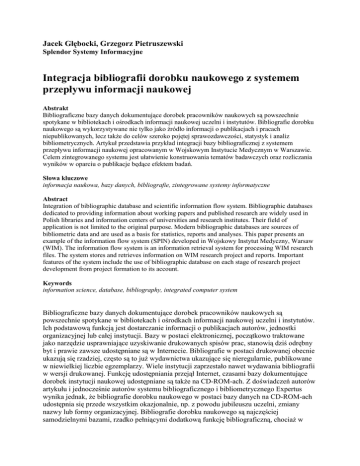 Jacek Głębocki, Grzegorz Pietruszewski Splendor Systemy Informacyjne Integracja bibliografii dorobku naukowego z systemem przepływu informacji naukowej Abstrakt Bibliograficzne bazy danych dokumentujące dorobek pracowników naukowych są powszechnie spotykane w bibliotekach i ośrodkach informacji naukowej uczelni i instytutów. Bibliografie dorobku naukowego są wykorzystywane nie tylko jako źródło informacji o publikacjach i pracach niepublikowanych, lecz takŜe do celów szeroko pojętej sprawozdawczości, statystyk i analiz bibliometrycznych. Artykuł przedstawia przykład integracji bazy bibliograficznej z systemem przepływu informacji naukowej opracowanym w Wojskowym Instytucie Medycznym w Warszawie. Celem zintegrowanego systemu jest ułatwienie konstruowania tematów badawczych oraz rozliczania wyników w oparciu o publikacje będące efektem badań. Słowa kluczowe informacja naukowa, bazy danych, bibliografie, zintegrowane systemy informatyczne Abstract Integration of bibliographic database and scientific information flow system. Bibliographic databases dedicated to providing information about working papers and published research are widely used in Polish libraries and information centers of universities and research institutes. Their field of application is not limited to the original purpose. Modern bibliographic databases are sources of bibliometric data and are used as a basis for statistics, reports and analyses. This paper presents an example of the information flow system (SPIN) developed in Wojskowy Instytut Medyczny, Warsaw (WIM). The information flow system is an information retrieval system for processing WIM research files. The system stores and retrieves information on WIM research project and reports. Important features of the system include the use of bibliographic database on each stage of research project development from project formation to its account. Keywords information science, database, bibliography, integrated computer system Bibliograficzne bazy danych dokumentujące dorobek pracowników naukowych są powszechnie spotykane w bibliotekach i ośrodkach informacji naukowej uczelni i instytutów. Ich podstawową funkcją jest dostarczanie informacji o publikacjach autorów, jednostki organizacyjnej lub całej instytucji. Bazy w postaci elektronicznej, początkowo traktowane jako narzędzie usprawniające uzyskiwanie drukowanych spisów prac, stanowią dziś odrębny byt i prawie zawsze udostępniane są w Internecie. Bibliografie w postaci drukowanej obecnie ukazują się rzadziej, często są to juŜ wydawnictwa ukazujące się nieregularnie, publikowane w niewielkiej liczbie egzemplarzy. Wiele instytucji zaprzestało nawet wydawania bibliografii w wersji drukowanej. Funkcję udostępniania przejął Internet, czasami bazy dokumentujące dorobek instytucji naukowej udostępniane są takŜe na CD-ROM-ach. Z doświadczeń autorów artykułu i jednocześnie autorów systemu bibliograficznego i bibliometrycznego Expertus wynika jednak, Ŝe bibliografie dorobku naukowego w postaci bazy danych na CD-ROM-ach udostępnia się przede wszystkim okazjonalnie, np. z powodu jubileuszu uczelni, zmiany nazwy lub formy organizacyjnej. Bibliografie dorobku naukowego są najczęściej samodzielnymi bazami, rzadko pełniącymi dodatkową funkcję bibliograficzną, chociaŜ w uczelniach i instytutach specjalistycznych moŜna spotkać bibliografie zawartości czasopism i innych wydawnictw, w których opisy autorstwa własnych pracowników są wyróŜnione, tworząc podbazę. System informatyczny obsługujący bazę bibliograficzną, oprócz wyszukiwania według kaŜdego znaczącego elementu opisu bibliograficznego, zapewnia takŜe często wyszukiwanie pod kątem dowolnego słowa opisu, a takŜe słów abstraktu lub pełnego tekstu. Linki do pełnych tekstów stosuje większość znanych autorom artykułu baz (przykładowo Biblioteka Collegium Medicum Uniwersytetu Jagiellońskiego podłącza linki kierujące z rekordów bibliograficznych do repozytorium cyfrowego). Pełne teksty są takŜe załączane bezpośrednio w systemie bibliograficznym (np. baza doktoratów i habilitacji i baza prac magisterskich i licencjackich Akademii Medycznej w Gdańsku). Specyfika przeszukiwania bibliografii zawartości czasopism i innych wydawnictw oraz bibliografii dorobku naukowego jest jednak istotnie inna. W bibliografiach zawartości czasopism i innych wydawnictw duŜe znaczenie ma wyszukiwanie poprzez słowa kluczowe, hasła przedmiotowe lub nawet deskryptory tezaurusa, a więc elementy wyszukiwawcze wprowadzone przez osoby indeksujące na podstawie analizy treści dokonanej przez specjalistów. DuŜą zaletą systemu wyszukiwawczego jest moŜliwość wyszukiwania rozszerzonego wykorzystującego strukturę hierarchiczną tezaurusa. UŜyteczne jest takie zaprojektowanie bazy danych, aby był moŜliwy podział haseł klasyfikacyjnych na hasła główne (pierwszoplanowe) i pomocnicze (drugoplanowe), co jest dodatkowym atutem ułatwiającym precyzyjne wyszukiwanie. Głębokie indeksowanie opisów bibliograficznych jest niezastąpione wtedy, gdy chcemy dotrzeć do pracy na podstawie jej zawartości treściowej. Dobrym przykładem jest baza „Polska Bibliografia Lekarska” w połączeniu z bazą „Polskiego Tezaurusa Medycznego Głównej Biblioteki Lekarskiej”. W bibliografiach osobowych wyszukiwanie według słów tytułu, całego opisu czy teŜ według haseł klasyfikacyjnych ma mniejsze znaczenie, chociaŜ bywa stosowane np. przez studentów zamierzających wybrać temat i promotora pracy magisterskiej oraz w sytuacjach, w których baza bibliograficzna stanowi element systemu o ogólniejszym przeznaczeniu. Bardzo często jednak pola słuŜące do klasyfikacji treściowej w bibliografiach osobowych nie są wykorzystywane i wcale nie świadczy to źle o jakości takich baz danych. Autorzy artykułu w pełni podzielają pogląd doświadczonych bibliotekarzy specjalizujących się w 