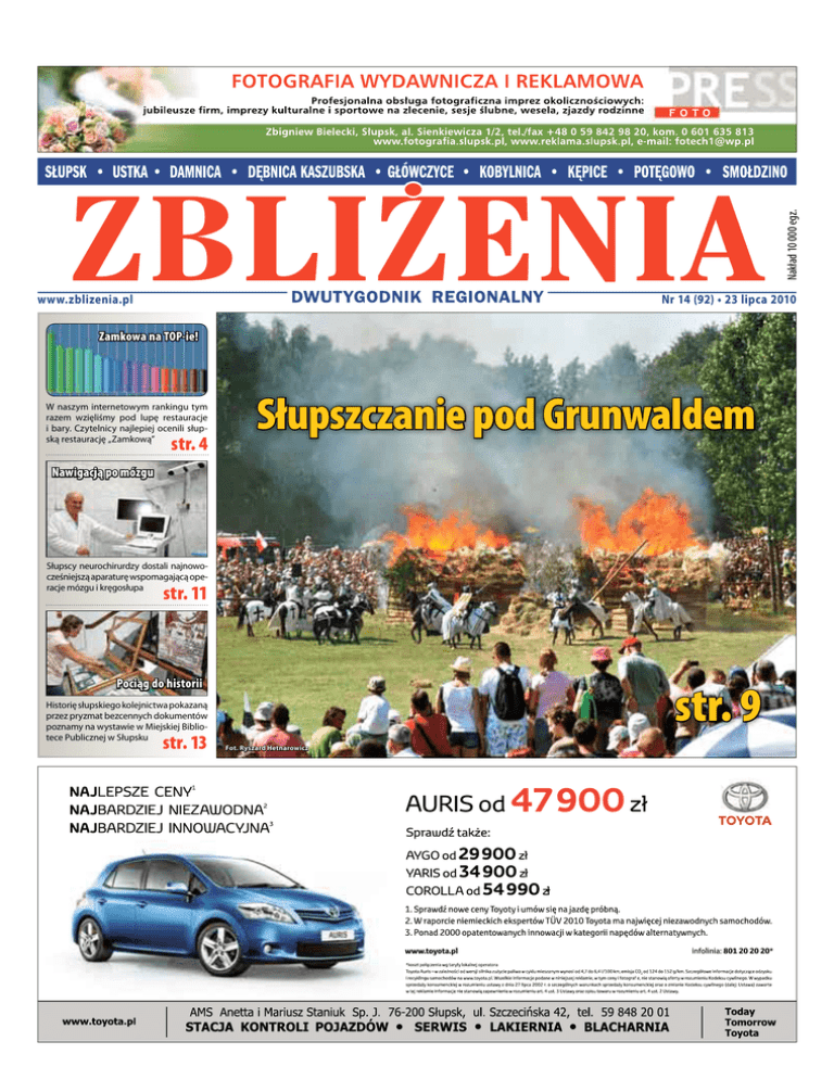 Nakład 10 000 egz. www.zblizenia.pl Nr 14 (92) • 23 lipca 2010 Zamkowa na TOP-ie! W naszym internetowym rankingu tym razem wzięliśmy pod lupę restauracje i bary. Czytelnicy najlepiej ocenili słupską restaurację „Zamkową” str. 4 Słupszczanie pod Grunwaldem Nawigacją po mózgu Słupscy neurochirurdzy dostali najnowocześniejszą aparaturę wspomagającą operacje mózgu i kręgosłupa str. 11 str. 9 Pociąg do historii Historię słupskiego kolejnictwa pokazaną przez pryzmat bezcennych dokumentów poznamy na wystawie w Miejskiej Bibliotece Publicznej w Słupsku str. 13 Fot. Ryszard Hetnarowicz REKLAMA 23 lipca 2010 AKTUALNOŚCI 23 lipca 2010 Milion na ekologię Komentarz Żerowanie na pasji Przedsiębiorstwo Gospodarki Komunalnej w Słupsku pozyskało z Eko Funduszu ponad milion złotych na projekt pn. „Automatyzacja procesu sortowania odpadów poprzez zainstalowanie sortera w Zakładzie Unieszkodliwiania Odpadów w Bierkowie”. Za te pieniądze kupiony zostanie nowoczesny sorter optoelektryczny, dzięki czemu wydajność sortowania tworzyw sztucznych wzrośnie o około jedną czwartą. Celem projektu jest zwiększenie efektywności odzysku surowców wtórnych oraz poprawa ich jakości. Dzięki zakupowi sortera usprawnione zostaną procesy rozdzielania i doczyszczania odpadów, dotychczas sortowanych ręcznie. Zmniejszy się także ilość odpadów kierowanych na skła- dowisko pozostałości (balastu). W skład systemu sortera wchodzą m.in.: czujnik podczerwieni, listwa oświetleniowa, przenośnik przyspieszający, przedział wychwytujący odseparowany materiał oraz zbiornik powietrza. Urządzenia zostaną zamontowane w hali sortowni znajdującej się w Za- kładzie Unieszkodliwiania Odpadów w Bierkowie. Jedną z największych korzyści z zainstalowania sortera będzie częściowe zlikwidowanie żmudnego i pracochłonnego procesu sortowania tworzyw sztucznych, dzięki czemu wzrośnie bezpieczeństwo i higiena pracy. W trakcie procesu Rozbili wazę Chłodząca kurtyna wodna W związku z ostatnimi upałami w centrum Słupska uruchomiono kurtynę wodna. Urządzenie pracuje na placu Zwycięstwa i na Starym Rynku. To efekt wspólnych działań prezydenta Słupska, komendanta Państwowej Straży Pożarnej w Słupsku oraz prezesa Wodociągów Słupsk. Uruchomienie kurtyny wodnej ma ulżyć mieszkańcom miasta i przyjezdnym w znoszeniu wysokich temperatur. Urządzenie służy bowiem możliwe będzie także wyeliminowanie niektórych rodzajów tworzyw, trudnych do odseparowania podczas ręcznego sortowania. Całkowity koszt inwestycji wyniesie 1 mln 385 tys. złotych, z czego dofinansowanie z Eko Funduszu stanowi 72,5%. (l) Wandale rozbili jedną z waz kwiatowych zdobiących skwer przy al. Sienkiewicza. O zdarzeniu powiadomiona została Policja. Terenem opiekuje się Zarząd Terenów Zieleni Miejskiej i Cmentarzy Komunalnych w Słupsku. do wytwarzania zasłon wodnych mających na celu zmniejszenie siły promieniowania cieplnego, a jednocześnie tworzy przyjemny mikroklimat, chłodzi i ułatwia oddychanie. Kurtyna jest włączana w upalne dni co półtorej godziny na 10 minut od godziny 11 do 16 na zmianę na placu Zwycięstwa i Starym Rynku, czyli w najbardziej uczęszczanych miejscach miasta. (rp) Fot. Zbigniew Bielecki – Uszkodzenia wazy są znaczne, całkowitemu rozbiciu uległa górna część – donica – informuje Mariusz Smoliński, rzecznik prasowy słupskiego ratusza. – Z uwagi na fakt, że postument jest zachowany w całości, spółka cywilna „Ogrody”, utrzymująca skwer w ramach umowy z Zarządem, zabrała uszkodzony fragment ozdoby do swojej siedziby aby spróbować ją naprawić, czyli skleić. Jednocześnie kierownik Zarządu Terenów Zieleni Miejskiej i Cmentarzy Komunalnych w Słupsku podjął rozmowy z producentem waz na temat możliwości dokupienia jedynie donicy. Cała nowa waza kosztuje 4 tysiące złotych. (l) Zaproszenia czekają! Nasi Czytelnicy mają wyjątkową okazję uczestniczenia w inauguracji letniej edycji Komeda Jazz Festival w Dolinie Charlotty, o czym piszemy szerzej na str. 13. Koncert będzie promocją najnowszego projektu kompozytorskiego Leszka Kułakowskiego, którego efektem jest płyta „Code Numbers”. W naszej redakcji czeka dziesięć dwuosobowych zaproszeń. Pierwsze dziesięć osób, które dzisiaj, 23 lipca, przyjdą do naszej redakcji, będzie mogła już jutro (24 bm.) o godz. 20 zasiąść wraz z osobą towarzyszącą w sali „Magnolia” w Dolinie Charlotty i wsłuchać się w tę fascynującą muzykę. Po koncercie odbędzie się tradycyjne jam session. (red) DWUTYGODNIK Nakład: 10000 egz. ISSN 138-0745 REGIONALNY Wydawca: AUH FOTECH 76-200 Słupsk al. Sienkiewicza 1/2 Redaktor naczelna Leokadia Lubiniecka Sekretarz redakcji Ryszard Hetnarowicz Dyrektor wydawnictwa Zbigniew Bielecki Skład i grafika Bednarek Media - Studio Grafiki Reklamowej, Druk: Polskapresse, Gdańsk Ilona Gostyńska-Rymkiewicz Redakcja i Biuro Reklamy: al. Sienkiewicza 1/2, 76-200 Słupsk tel./fax 059 842 98 20 tel. kom 601 635 813, 697 855 000 e-mail: [email protected] www.zblizenia.pl Coraz trudniej o ludzi z pasją! A jeszcze trudniej o grupy takich ludzi! Doświadczają tego wszystkie ruchy społecznikowskie. Nie brakuje natomiast tych, którzy potrafią ich znaleźć, zarazić kolejną ideą i znakomicie na nich zarobić. Przy okazji stawiając warunki, które tylko wzmagają chęć sprostania im przez pasjonatów, a pasożytom dają poczucie... działania! Nie jest to zjawisko ani nowe, ani też nie zniknie tak szybko. Śmiem nawet twierdzić, że będzie się rozszerzało. A już na pewno będzie rosła liczba pasożytów żerujących na pasjonatach. Naocznym tego przykładem była wyprawa członków słupskiego Bractwa Rycerskiego Bogusława V na pola Grunwaldu. Organizatorzy inscenizacji bitwy założyli... wyssanie z pasjonatów ostatniej kropli krwi! Jak najmniej dać od siebie, jak najwięcej żądać – oto dewiza prawdziwi