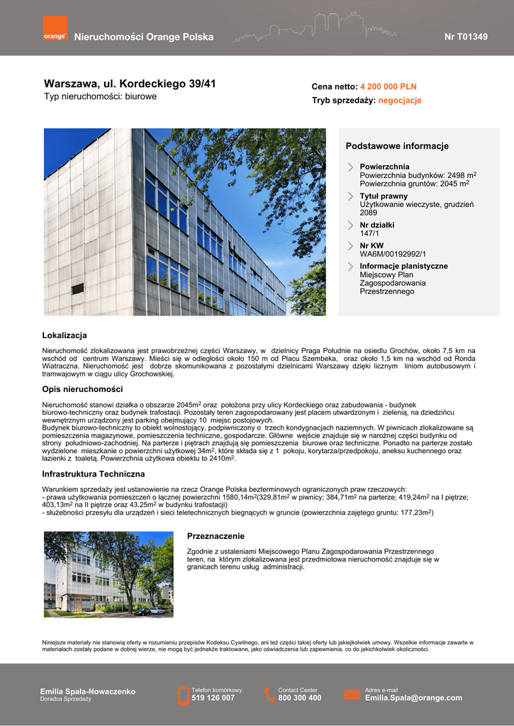 Nr T01349 Warszawa, ul. Kordeckiego 39/41 Typ nieruchomości: biurowe Cena netto: 4 200 000 PLN Tryb sprzedaży: negocjacje Podstawowe informacje Powierzchnia Powierzchnia budynków: 2498 m2 Powierzchnia gruntów: 2045 m2 Tytuł prawny Użytkowanie wieczyste, grudzień 2089 Nr działki 147/1 Nr KW WA6M/00192992/1 Informacje planistyczne Miejscowy Plan Zagospodarowania Przestrzennego Lokalizacja Nieruchomość zlokalizowana jest prawobrzeżnej części Warszawy, w dzielnicy Praga Południe na osiedlu Grochów, około 7,5 km na wschód od centrum Warszawy. Mieści się w odległości około 150 m od Placu Szembeka, oraz około 1,5 km na wschód od Ronda Wiatraczna. Nieruchomość jest dobrze skomunikowana z pozostałymi dzielnicami Warszawy dzięki licznym liniom autobusowym i tramwajowym w ciągu ulicy Grochowskiej. Opis nieruchomości Nieruchomość stanowi działka o obszarze 2045m2 oraz położona przy ulicy Kordeckiego oraz zabudowania - budynek biurowo-techniczny oraz budynek trafostacji. Pozostały teren zagospodarowany jest placem utwardzonym i zielenią, na dziedzińcu wewnętrznym urządzony jest parking obejmujący 10 miejsc postojowych. Budynek biurowo-techniczny to obiekt wolnostojący, podpiwniczony o trzech kondygnacjach naziemnych. W piwnicach zlokalizowane są pomieszczenia magazynowe, pomieszczenia techniczne, gospodarcze. Główne wejście znajduje się w narożnej części budynku od strony południowo-zachodniej. Na parterze i piętrach znajdują się pomieszczenia biurowe oraz techniczne. Ponadto na parterze zostało wydzielone mieszkanie o powierzchni użytkowej 34m2, które składa się z 1 pokoju, korytarza/przedpokoju, aneksu kuchennego oraz łazienki z toaletą. Powierzchnia użytkowa obiektu to 2410m2. Infrastruktura Techniczna Warunkiem sprzedaży jest ustanowienie na rzecz Orange Polska bezterminowych ograniczonych praw rzeczowych: - prawa użytkowania pomieszczeń o łącznej powierzchni 1580,14m2(329,81m2 w piwnicy; 384,71m2 na parterze; 419,24m2 na I piętrze; 403,13m2 na II piętrze oraz 43,25m2 w budynku trafostacji) - służebności przesyłu dla urządzeń i sieci teletechnicznych biegnących w gruncie (powierzchnia zajętego gruntu: 177,23m2) Przeznaczenie Zgodnie z ustaleniami Miejscowego Planu Zagospodarowania Przestrzennego teren, na którym zlokalizowana jest przedmiotowa nieruchomość znajduje się w granicach terenu usług administracji. Niniejsze materiały nie stanowią oferty w rozumieniu przepisów Kodeksu Cywilnego, ani też części takiej oferty lub jakiejkolwiek umowy. Wszelkie informacje zawarte w materiałach zostały podane w dobrej wierze, nie mogą być jednakże traktowane, jako oświadczenia lub zapewnienia, co do jakichkolwiek okoliczności. Emilia Spała-Nowaczenko Doradca Sprzedaży Telefon komórkowy 519 126 007 Contact Center 800 300 400 Adres e-mail [email protected]