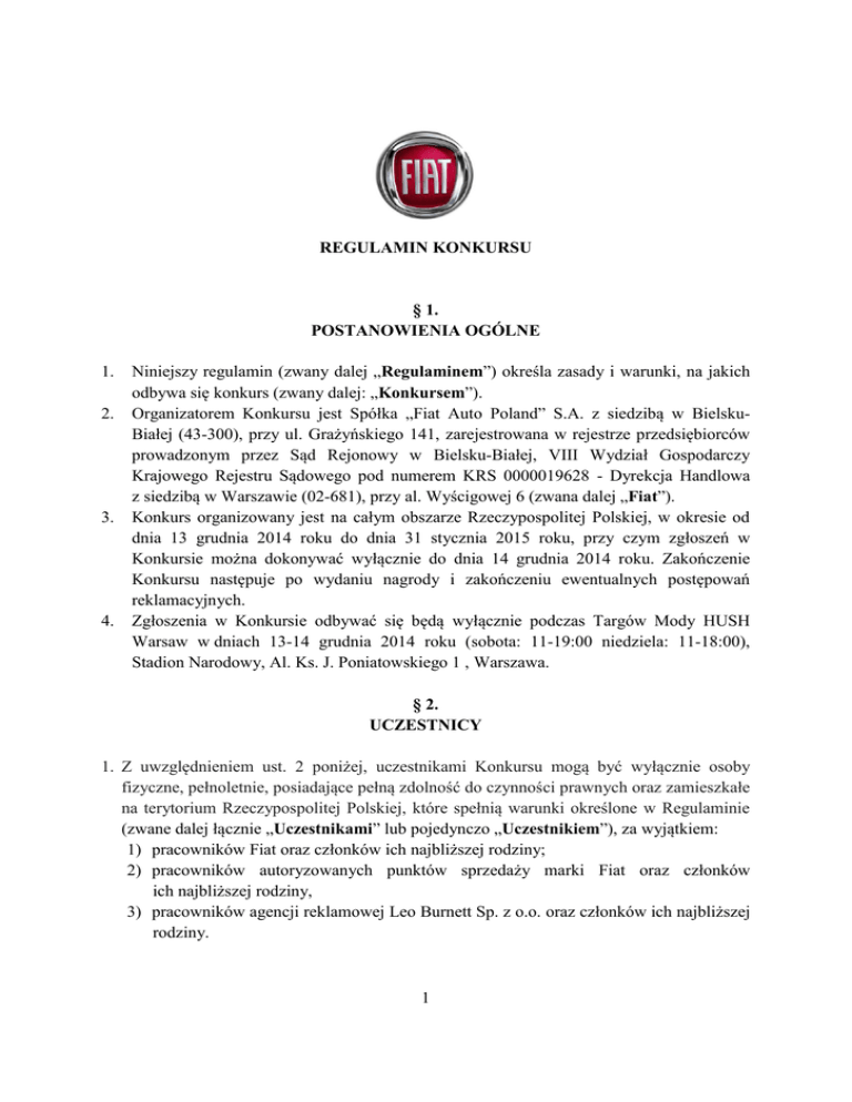 REGULAMIN KONKURSU § 1. POSTANOWIENIA OGÓLNE 1. 2. 3. 4. Niniejszy regulamin (zwany dalej „Regulaminem”) określa zasady i warunki, na jakich odbywa się konkurs (zwany dalej: „Konkursem”). Organizatorem Konkursu jest Spółka „Fiat Auto Poland” S.A. z siedzibą w BielskuBiałej (43-300), przy ul. Grażyńskiego 141, zarejestrowana w rejestrze przedsiębiorców prowadzonym przez Sąd Rejonowy w Bielsku-Białej, VIII Wydział Gospodarczy Krajowego Rejestru Sądowego pod numerem KRS 0000019628 - Dyrekcja Handlowa z siedzibą w Warszawie (02-681), przy al. Wyścigowej 6 (zwana dalej „Fiat”). Konkurs organizowany jest na całym obszarze Rzeczypospolitej Polskiej, w okresie od dnia 13 grudnia 2014 roku do dnia 31 stycznia 2015 roku, przy czym zgłoszeń w Konkursie można dokonywać wyłącznie do dnia 14 grudnia 2014 roku. Zakończenie Konkursu następuje po wydaniu nagrody i zakończeniu ewentualnych postępowań reklamacyjnych. Zgłoszenia w Konkursie odbywać się będą wyłącznie podczas Targów Mody HUSH Warsaw w dniach 13-14 grudnia 2014 roku (sobota: 11-19:00 niedziela: 11-18:00), Stadion Narodowy, Al. Ks. J. Poniatowskiego 1 , Warszawa. § 2. UCZESTNICY 1. Z uwzględnieniem ust. 2 poniżej, uczestnikami Konkursu mogą być wyłącznie osoby fizyczne, pełnoletnie, posiadające pełną zdolność do czynności prawnych oraz zamieszkałe na terytorium Rzeczypospolitej Polskiej, które spełnią warunki określone w Regulaminie (zwane dalej łącznie „Uczestnikami” lub pojedynczo „Uczestnikiem”), za wyjątkiem: 1) pracowników Fiat oraz członków ich najbliższej rodziny; 2) pracowników autoryzowanych punktów sprzedaży marki Fiat oraz członków ich najbliższej rodziny, 3) pracowników agencji reklamowej Leo Burnett Sp. z o.o. oraz członków ich najbliższej rodziny. 1 2. Przez członków najbliższej rodziny rozumie się wstępnych, zstępnych, rodzeństwo, małżonków, małżonków rodzeństwa, rodziców małżonków i osoby pozostające w stosunku przysposobienia. 3. Realizacja nagrody wskazanej w § 5 ust. 2 pkt 2) Regulaminu wymaga posiadania przez Uczestnika stosownych uprawnień do prowadzenia samochodu osobowego według obowiązujących w Polsce przepisów. Ich brak uniemożliwiać będzie wydanie Uczestnikowi nagrody wskazanych w § 5 ust. 2 pkt 2) Regulaminu. 4. Przez przystąpienie do Konkursu Uczestnik potwierdza, że zapoznał się z Regulaminem, akceptuje jego treść w całości i zobowiązuje się do przestrzegania określonych w Regulaminie zasad i warunków. § 3. WARUNKI UCZESTNICTWA W KONKURSIE 1. W celu wzięcia udziału w Konkursie, Uczestnik musi łącznie spełnić następujące warunki: 1) odwiedzenie stoiska Fiata podczas Targów Mody HUSH Warsaw w dniach 13-14 grudnia 2014 roku oraz czytelne wypełnienie zgłoszenia konkursowego poprzez podanie następujących danych: imię i nazwisko Uczestnika, adres e-mail Uczestnika, numer telefonu kontaktowego Uczestnika oraz akceptację zasad i warunków regulaminu Konkursu, w tym udzielenie zgody na przetwarzanie danych osobowych; 2) dokonanie zgłoszenia w Konkursie – poprzez przekazanie należycie wypełnionego zgłoszenia konkursowego osobom obsługującym stoisko Fiata, o którym mowa w pkt. 1; 3) udzielenie odpowiedzi do dnia 11 stycznia 2015 roku na zadane pytanie dot. Fiata (zwane dalej „Odpowiedzią na pytanie”), poprzez udzielenie odpowiedzi na pytanie konkursowe w formularzu internetowym, do którego dostęp zostanie przekazany Uczestnikowi poprzez wysłaną przez Fiata wiadomość e-mail na podany przez Uczestnika adres e-mail w zgłoszeniu konkursowym. Wiadomość e-mail z pytaniem zostanie wysłana do dnia 31 grudnia 2014 roku. 2. Każdy Uczestnik może dokonać wyłącznie jednego zgłoszenia w Konkursie i udzielić tylko jednej Odpowiedzi na pytanie. W przypadku dokonania więcej niż jednego zgłoszenia w Konkursie lub udzielenie więcej niż jednej Odpowiedzi na pytanie, będzie brane pod uwagę wyłącznie zgłoszenie w Konkursie lub Odpowiedź na pytanie najwcześniej złożone przez Uczestnika. 3. Każdy Uczestnik może otrzymać tylko jedną nagrodę w Konkursie. 4. Organizator zastrzega sobie prawo do wykluczenia z udziału w Konkursie Uczestników, których Odpowiedź konkursowa zawiera treści naruszające powszechnie akceptowane normy obyczajowe, niesie treści propagujące przemoc, wzywa do antagonizmów na tle rasowym, wyznaniowym lub etnicznym, zawiera treści uznane powszechnie za obelżywe lub powodującą naruszenie prawa polskiego albo międzynarodowego, lub gdy zawiera oznaczenia, nazwy innych marek, w szczególności konkurencyjnych wobec Organizatora lub zawiera treści naruszające dobra osobiste Organizatora lub stawiające 2 go w niekorzystnym świetle. Organizator zastrzega sobie prawo wykluczenia Uczestnika z udziału w Konkursie w razie powzięcia podejrzenia naruszenia postanowień, zasad lub warunków niniejszego Regulaminu, w szczególności w razie próby nieuczciwego wpływania na wynik Konkursu. 5. Organizator zastrzega sobie prawo wykluczenia z udziału w Konkursie zgłoszeń nieczytelnych lub niepełnych. 6. Uczestnik Konkursu oświadcza i gwarantuje, że przysługują mu pełne prawa (w tym prawa własności intelektualnej) do Odpowiedzi konkursowej. § 4. ROZSTRZYGNIĘCIE KONKURSU 1. Organizator powoła komisję konkursową (zwaną dalej jako „Komisja”), składającą się z 3 osób, która dokonywać będzie wyboru najlepszych Odpowiedzi konkursowych. 2. Z zastrzeżeniem dalszych postanowień Regulaminu, Komisja dokona wyboru 17 najlepszych Odpowiedzi na pytanie, w terminie do dnia 25 stycznia 2015 roku. 3. Wyłonienie zwycięzców Konkursu (zwani dalej jako „Zwycięzcy” lub pojedynczo „Zwycięzca”) nastąpi w następujący sposób: Komisja dokona wyboru według własnego uznania, mając na uwadze pomysłowość, oryginalność i ogólne wrażenie artystyczne Odpowiedzi na pytanie, 17 najlepszych Odpowiedzi na pytani