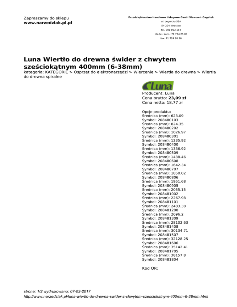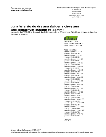 Zapraszamy do sklepu www.narzedziak.pl.pl Przedsiębiorstwo Handlowo Usługowe Gaabi Sławomir Gagatek ul. Legnicka 52A 54-204 Wrocław tel. 801 003 154 dla tel. kom.: 71 724 25 00 fax: 71 724 20 96 Luna Wiertło do drewna świder z chwytem sześciokątnym 400mm (6-38mm) kategoria: KATEGORIE > Osprzęt do elektronarzędzi > Wiercenie > Wiertła do drewna > Wiertła do drewna spiralne Producent: Luna Cena brutto: 23,09 zł Cena netto: 18,77 zł Opcje produktu: Średnica (mm): 623.09 Symbol: 208480103 Średnica (mm): 824.35 Symbol: 208480202 Średnica (mm): 1026.97 Symbol: 208480301 Średnica (mm): 1235.92 Symbol: 208480400 Średnica (mm): 1336.92 Symbol: 208480509 Średnica (mm): 1438.46 Symbol: 208480608 Średnica (mm): 1642.34 Symbol: 208480707 Średnica (mm): 1850.02 Symbol: 208480806 Średnica (mm): 1951.68 Symbol: 208480905 Średnica (mm): 2055.15 Symbol: 208481002 Średnica (mm): 2267.98 Symbol: 208481101 Średnica (mm): 2483.38 Symbol: 208481200 Średnica (mm): 2696.2 Symbol: 208481309 Średnica (mm): 28102.63 Symbol: 208481408 Średnica (mm): 30134.71 Symbol: 208481507 Średnica (mm): 32128.25 Symbol: 208481606 Średnica (mm): 35142.41 Symbol: 208481705 Średnica (mm): 38157.8 Symbol: 208481804 Kod QR: strona: 1/2 wydrukowano: 07-03-2017 http://www.narzedziak.pl/luna-wiertlo-do-drewna-swider-z-chwytem-szesciokatnym-400mm-6-38mm.html Zapewnia precyzję w trakcie wykonywania prac wiertniczych w różnowarstwowych materiałach, belkach i dźwigarach. Gwintowana końcówka wiertła zapewnia łatwość pomiaru i dokładność wiercenia. Kręty kształt części roboczej zapewnia glądką powierchnię otworu, a także bardzo dobre prowadzenie. Do wykonywania przepustów, np. pod instalacje elektryczne i hydrauliczne. Wiertło z chwytem sześciokątnym 1/4" dla wierteł w średnicach 6-19mm i 3/8" dla wierteł w średnicach 20-38mm Długość całkowita wiertła 400mm Długość części roboczej wiertła 300mm Do wierteł pasuje przedłużnik luna, odpowiednio 1/4" i 3/8" marki Luna Do wyboru wiertła w rozmiarach 6-38mm strona: 2/2 wydrukowano: 07-03-2017 http://www.narzedziak.pl/luna-wiertlo-do-drewna-swider-z-chwytem-szesciokatnym-400mm-6-38mm.html