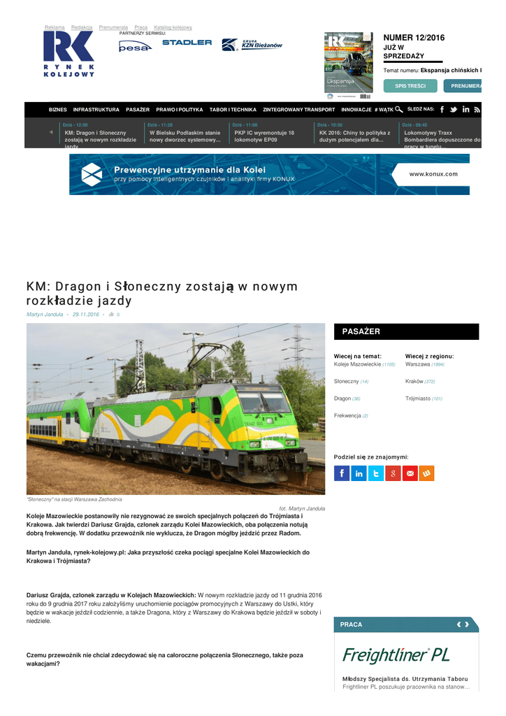 Reklama Redakcja Prenumerata Praca Katalog kolejowy PARTNERZY SERWISU: NUMER 12/2016 JUŻ W SPRZEDAŻY Temat numeru: Ekspansja chińskich kolei SPIS TREŚCI BIZNES INFRASTRUKTURA PASAŻER Dziś - 12:00 PRAWO I POLITYKA TABOR I TECHNIKA Dziś - 11:28 KM: Dragon i Słoneczny zostają w nowym rozkładzie jazdy W Bielsku Podlaskim stanie nowy dworzec systemowy... ZINTEGROWANY TRANSPORT Dziś - 11:00 INNOWACJE # WĄTKI Dziś - 10:30 PKP IC wyremontuje 18 lokomotyw EP09 PRENUMERATA ŚLEDŹ NAS: Dziś - 09:45 KK 2016: Chiny to polityka z dużym potencjałem dla... Lokomotywy Traxx Bombardiera dopuszczone do pracy w tunelu... K M : D rag o n i S ło n e c z n y z o st aj ą w n o w ym ro z k ład z ie jaz d y Martyn Janduła ⚫ 29.11.2016 ⚫ 0 PASAŻER Wiecej na t ema t : Wiecej z regionu: Koleje Mazowieckie (1105) Warszawa (1994) Słoneczny (14) Kraków (372) Dragon (36) Trójmiasto (101) Frekwencja (2) Podziel si ę ze zna jomy mi: "Słoneczny" na stacji Warszawa Zachodnia fot. Martyn Janduła Koleje Mazowieckie postanowiły nie rezygnować ze swoich specjalnych połączeń do Trójmiasta i Krakowa. Jak twierdzi Dariusz Grajda, członek zarządu Kolei Mazowieckich, oba połączenia notują dobrą frekwencję. W dodatku przewoźnik nie wyklucza, że Dragon mógłby jeździć przez Radom. Martyn Janduła, rynek-kolejowy.pl: Jaka przyszłość czeka pociągi specjalne Kolei Mazowieckich do Krakowa i Trójmiasta? Dariusz Grajda, członek zarządu w Kolejach Mazowieckich: W nowym rozkładzie jazdy od 11 grudnia 2016 roku do 9 grudnia 2017 roku założyliśmy uruchomienie pociągów promocyjnych z Warszawy do Ustki, który będzie w wakacje jeździł codziennie, a także Dragona, który z Warszawy do Krakowa będzie jeździł w soboty i niedziele. PRACA Czemu przewoźnik nie chciał zdecydować się na całoroczne połączenia Słonecznego, także poza wakacjami? M łodszy Specja list a ds. Ut rzy ma nia Ta boru Frightliner PL poszukuje pracownika na stanow… Więcej ogłoszeń Dlatego, że przez trzy miesiące badaliśmy, jak wyglądało zainteresowanie ludzi tym pociągiem w soboty i niedziele. Wyniki wskazywały zaledwie na 30-35% poziom zainteresowania. Nie mogliśmy zatem dalej kontynuować tego w takiej formie. Poza tym występowały tam utrudnienia spowodowane modernizacjami, które prowadziły do tego, że pociąg po prostu jechał do Trójmiasta ponad półtorej godziny dłużej. Po prostu nie mieściliśmy się już na linii. Jak już wszystko będzie dobrze poukładane, to może wrócimy w przyszłości do połączenia między Warszawą a Trójmiastem w soboty i niedziele w całym roku, a w wakacje codziennie. Jak wygląda sprawa godzin odjazdów tych pociągów? Godziny odjazdów są porównywalne z tymi, które mieliśmy w tym roku. Dragon między 7 a 8 wyjeżdżać będzie z Warszawy. Koło godz. 11 przyjedzie do Krakowa. Powrót planowany jest ok. godz. 16. To jest związane z 12-godzinnym czasem pracy maszynistów i kierowników pociągów. Tak samo jest ze Słonecznym, który koło godziny 8 będzie wyjeżdżał z Warszawy i wracał koło godziny 22 do Warszawy. Gdzie będzie kończył Słoneczny? W Ustce. Ma być tam przebudowywana stacja kolejowa, a także modernizowana będzie linia kolejowa pomiędzy Trójmiastem a Słupskiem. Prace są już bardzo mocno zakrojone, natomiast protestują ludzie, bo chcą mieć dwa tory, a nie wszędzie PKP PLK chcą zrobić dwa tory, tylko pobudować mijanki. KATALOG KOLEJOWY Ile wynosiła frekwencja na odcinku Ustka – Gdynia? Byłem zaskoczony, bo frekwencja była bardzo dobra. Wynosiła ona od 40 do 50%. Oczywiście ten pociąg na odcinku Trójmiasto - Malbork czy Działdowo był poważnie napełniony. Czasami brakowało miejsc. Ludzie, którzy funkcjonują na co dzień, korzystali z niego do codziennych podróży. + Dodaj firmę Zobacz katalog Czy są plany stworzenia innych podobnych połączeń? KOMENTARZE Nie ma żadnych planów uruchamiania kolejnych połączeń. WSZYSTKIE Dominik Lebda - redaktor portalu Rynek Kolejowy Czy Dragon po zakończeniu remontu linii radomskiej może pojechać też przez Radom? Czy jest rozważany taki pomysł? Tak, jest rozważana taka opcja. Byłoby to dla nas nawet dużo lepsze rozwiązanie, żeby Dragon jechał po linii radomskiej, bo wtedy koszty dostępu do infrastruktury będą niższe. Tylko że linia do Radomia i dalej do Krakowa musi być wyremontowana. Czy pociągiem można podróżować tylko dla krajobrazów? Tomasz Poręba - europoseł... > Poręba: Narzucenie limitów hałasu ograniczy konkurencyjność kolei > Michał Litwin - sekretarz Związk... Rozwój transportu rzecznego to dublowanie możliwości kolei > Wiesz na ten temat więcej? Napisz do nas. PODZIEL SIĘ TYM Z INNYMI: Wojciech Suchorzewski - Prof. zwycz., kierowni... Suchorzewski: Miasta wiedzą, jak walczyć z zanieczyszczeniem powietrza WYDARZENIA> Wi ęcej na t ema t : Wi ęcej z regionu: Koleje Mazowieckie (1105) Warszawa (1994) Słoneczny (14) Kraków (372) Dragon (36) Trójmiasto (101) Katowice, 30.11.2016 - Jak nowe zmiany w zamówieniach publicznych wpłyną n... > Więcej wydarzeń BĄDŹ NA BIEŻĄCO: Frekwencja (2) Śled ź nasze wiado mo ści: Zapisz si ę do newslettera: P o d a n ie a d r e s u e -m a il o r a z w c i śn i ęc ie ‘ OK ’ je s t r ó w n o zn a c zn e z w yr a że n ie m zg o d y n a : Autobusy zamiast pociągów na Hel. Pojadą obok zmodernizowanej linii kolejowej Nevelo Newagu wrócił do Krakowa Masz dzieci, lubisz imprezować, lubisz gotować? Ta PKP IC wyremontuje 18 plamoodporna farba Sponsorowane lokomotyw EP09 jest dla Ciebie! ZOBACZ TEŻ: G r a jd a : N ie w y o b r a ża m . . . 4 M a sz y n ist a - z a w ó d z p a sj ą 197 K M : N o w y r o z k ła d ja z d . . . 51 M y jn ia K o le i M a z o w ie ck i . . . 174 p r ze s y ła n ie p r ze z Ze s p ó ł D o r a d c ó w G o s p o d a r c zyc h TOR s p . z o . o . z s ie d zib ą w W a r s za w ie , a d r e s : P l. B a n k o w y 2 , 0 