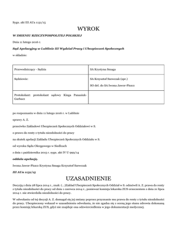 Sygn. akt III AUa 1131/15 WYROK W IMIENIU RZECZYPOSPOLITEJ POLSKIEJ Dnia 11 lutego 2016 r. Sąd Apelacyjny w Lublinie III Wydział Pracy i Ubezpieczeń Społecznych w składzie: Przewodniczący - Sędzia SA Krystyna Smaga Sędziowie: SA Krzysztof Szewczak (spr.) SO del. do SA Iwona Jawor-Piszcz Protokolant: protokolant sądowy Kinga PanasiukGarbacz po rozpoznaniu w dniu 11 lutego 2016 r. w Lublinie sprawy A. Z. przeciwko Zakładowi Ubezpieczeń Społecznych Oddziałowi w S. o prawo do renty z tytułu niezdolności do pracy na skutek apelacji Zakładu Ubezpieczeń Społecznych Oddziału w S. od wyroku Sądu Okręgowego w Siedlcach z dnia 1 października 2015 r. sygn. akt IV U 999/14 oddala apelację. Iwona Jawor-Piszcz Krystyna Smaga Krzysztof Szewczak III AUa 1131/15 UZASADNIENIE Decyzją z dnia 28 lipca 2014 r., znak: (...)Zakład Ubezpieczeń Społecznych Oddział w S. odmówił A. Z. prawa do renty z tytułu niezdolności do pracy od dnia 1 czerwca 2014 r., ponieważ komisja lekarska ZUS orzeczeniem z dnia 21 lipca 2014 r. nie stwierdziła niezdolności do pracy. W odwołaniu od tej decyzji A. Z. domagał się jej zmiany poprzez przyznanie mu prawa do renty z tytułu niezdolności do pracy. Ubezpieczony wskazał w uzasadnieniu odwołania, że nie zgadza się z oceną jego stanu zdrowia dokonaną przez komisję lekarską ZUS, gdyż nie znajduje ona odzwierciedlenia w jego dokumentacji medycznej. W odpowiedzi na odwołanie organ rentowy wnosił o jego oddalenie, wskazując przy tym, że zaskarżona decyzja wydana została na podstawie orzeczenia komisji lekarskiej ZUS z dnia 21 lipca 2014 r. stwierdzającego, że wnioskodawca nie jest niezdolny do pracy. W odwołaniu ubezpieczony, zdaniem ZUS, nie wskazał żadnych nowych dowodów, które uzasadniałyby zmianę zaskarżonej decyzji. Wyrokiem z dnia 1 października 2015 r. Sąd Okręgowy zmienił zaskarżoną decyzję w ten sposób, że przyznał ubezpieczonemu A. Z. prawo do okresowej renty z tytułu częściowej niezdolności do pracy od dnia 1 czerwca 2014 r. do dnia 9 czerwca 2018 r. W uzasadnieniu tego wyroku Sąd I instancji ustalił, że A. Z. był uprawniony do renty z tytułu częściowej niezdolności do pracy do dnia 31 maja 2014 r. na podstawie decyzji ZUS z dnia 10 grudnia 2013 r. W dniu 15 maja 2014 r. ubezpieczony złożył wniosek o ponowne ustalenie prawa do renty z tytułu niezdolności do pracy. Rozpoznając ten wniosek organ rentowy skierował wnioskodawcę na badanie przez lekarza orzecznika ZUS, który w orzeczeniu z dnia 29 maja 2014 r. ustalił, że ubezpieczony nie jest niezdolny do pracy. A. Z. wniósł sprzeciw od tego orzeczenia lekarza orzecznika ZUS. Komisja lekarska ZUS, po rozpatrzeniu sprzeciwu wnioskodawcy, orzeczeniem z dnia 21 lipca 2014 r. stwierdziła, że A. Z. nie jest niezdolny do pracy. Na podstawie tego orzeczenia, zaskarżoną decyzją z dnia 28 lipca 2014 r. Zakład Ubezpieczeń Społecznych Oddział w S. odmówił wnioskodawcy prawa do renty z tytułu niezdolności do pracy od dnia 1 czerwca 2014 r. Sąd I instancji oceniając prawidłowość w/w decyzji organu rentowego dopuścił dowód z opinii biegłych lekarzy specjalistów z zakresu: ortopedii i neurologii oraz onkologii. W wydanej opinii biegli lekarze ortopeda i neurolog rozpoznali u A. Z. dolegliwości bólowe lewego stawu kolanowego w przebiegu chondromalacji IIIo powierzchni stawowej rzepki, nawracające dolegliwości bólowe odcinka lędźwiowego kręgosłupa w przebiegu choroby zwyrodnieniowej i dyskopatii (...) i (...), bez objawów korzeniowych i ubytkowych, stan po przebytym chłoniaku H. po chemioterapii i radioterapii, dnę moczanową z napadowymi dolegliwościami bólowymi palucha stopy prawej. Biegli lekarze po przeanalizowaniu obecnego stanu klinicznego ubezpieczonego oraz po zapoznaniu się z dokumentacją medyczną nie stwierdzili z przyczyn ortopedycznych i neurologicznych niezdolności do pracy zarobkowej, w tym niezbyt ciężkiej pracy fizycznej. Z kolei biegły lekarz onkolog w swojej opinii rozpoznał u ubezpieczonego ziarnicę złośliwą – chłoniaka H. typ NS1 CS II EA, stan po 5 cyklach chemioterapii w 1992 r., stan po radioterapii na obszar: szyja-gardło górne oraz układ chłonny powyżej przepony, wykonanej w latach 1992-1993 (łączna dawka 44Gy), uszkodzenie wątroby po chemioterapii, zespół (...) po radioterapii (popromienne porażenie/uszkodzenie rdzenia kręgowego), niedoczynność tarczycy, zaburzenia depresyjne, upośledzenie odporności, nadciśnienie tętnicze, chipercholesterolemia, zmiany zwyrodnieniowe i dyskopatyczne kręgosłupa L-S z zespołem bólowym. Ubezpieczony w 1992 r. zachorował na ziarnicę złośliwą i został zakwalifikowany, a następnie poddany leczeniu skojarzonemu: chemioterapii i RTGterapii. W okresie od lipca do listopada 1992 r. otrzymał 5 kursów chemioterapii. Uzyskano remisję choroby, ale wystąpiły objawy toksycznego (po chemioterapii) uszkodzenia wątroby. Zastosowano wówczas intensywne leczenie zachowawcze i kontynuowano leczenie choroby zasadnicze w postaci RTG-terapii. Od grudnia 1992 r. do lutego 1993 r. przeprowadzono napromieniowanie układu chłonnego powyżej przepony oraz nosowej części gardła. Uzyskano remisję choroby nowotworowej. Ubezpieczony wymagał i pozostawał pod stałą kontrolą onkologiczną w Centrum Onkologii w W.. Po zastosowanej RTG-terapii pojawiły się objawy zespołu (...) w postaci zaburzeń neurologicznych uszkodzonego promieniami rdzenia kręgowego. Wśród objawów popromiennego uszkodzenia rdzenia kręgowego dominowały parestezje kończyn. Najprawdopodobniej skutkiem RTG-terapii okolicy szyjnej wystąpiła niedoczynność tarczycy wymagająca stałej substytucji hormonalnej. Skutkiem leczenia choroby zasadniczej jest również upośledzenie odporności, tj. częste infekcje górnych dróg oddechowych, uszkodzenie śluzówek górnych dróg oddechowych – wysychanie śluzówek, chrypka. Ubezpieczony jest osłabiony, częs