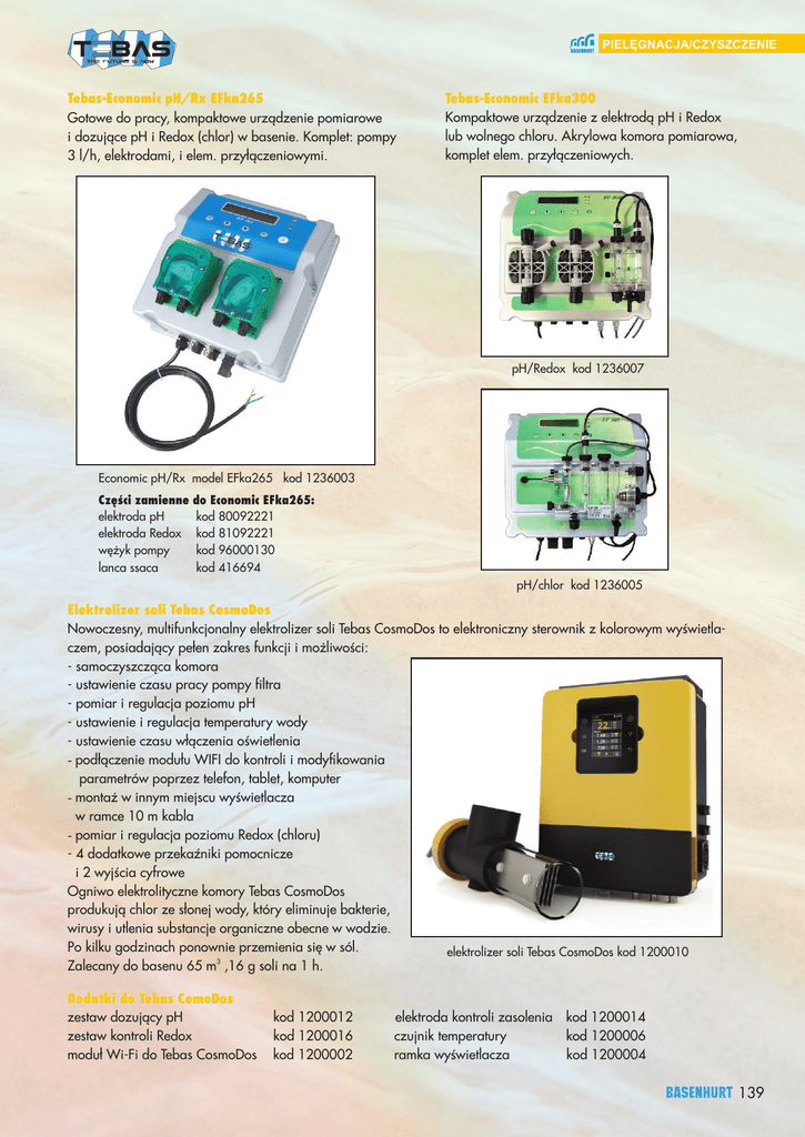 PIELĘGNACJA/CZYSZCZENIE Tebas-Economic pH/Rx EFka265 Gotowe do pracy, kompaktowe urządzenie pomiarowe i dozujące pH i Redox (chlor) w basenie. Komplet: pompy 3 l/h, elektrodami, i elem. przyłączeniowymi. Tebas-Economic EFka300 Kompaktowe urządzenie z elektrodą pH i Redox lub wolnego chloru. Akrylowa komora pomiarowa, komplet elem. przyłączeniowych. pH/Redox kod 1236007 Economic pH/Rx model EFka265 kod 1236003 Części zamienne elektroda pH elektroda Redox wężyk pompy lanca ssaca do Economic EFka265: kod 80092221 kod 81092221 kod 96000130 kod 416694 pH/chlor kod 1236005 Elektrolizer soli Tebas CosmoDos Nowoczesny, multifunkcjonalny elektrolizer soli Tebas CosmoDos to elektroniczny sterownik z kolorowym wyświetlaczem, posiadający pełen zakres funkcji i możliwości: - samoczyszcząca komora - ustawienie czasu pracy pompy filtra - pomiar i regulacja poziomu pH - ustawienie i regulacja temperatury wody - ustawienie czasu włączenia oświetlenia - podłączenie modułu WIFI do kontroli i modyfikowania parametrów poprzez telefon, tablet, komputer - montaż w innym miejscu wyświetlacza w ramce 10 m kabla - pomiar i regulacja poziomu Redox (chloru) - 4 dodatkowe przekaźniki pomocnicze i 2 wyjścia cyfrowe Ogniwo elektrolityczne komory Tebas CosmoDos produkują chlor ze słonej wody, który eliminuje bakterie, wirusy i utlenia substancje organiczne obecne w wodzie. Po kilku godzinach ponownie przemienia się w sól. elektrolizer soli Tebas CosmoDos kod 1200010 Zalecany do basenu 65 m3 ,16 g soli na 1 h. Dodatki do Tebas ComoDos . zestaw dozujący pH kod 1200012 zestaw kontroli Redox kod 1200016 moduł Wi-Fi do Tebas CosmoDos kod 1200002 elektroda kontroli zasolenia kod 1200014 czujnik temperatury kod 1200006 ramka wyświetlacza kod 1200004 139