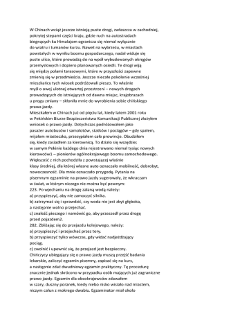 W Chinach wciąż jeszcze istnieją puste drogi, zwłaszcza w zachodniej, pokrytej stepami części kraju, gdzie ruch na autostradach biegnących ku Himalajom ogranicza się niemal wyłącznie do wiatru i tumanów kurzu. Nawet na wybrzeżu, w miastach powstałych w wyniku boomu gospodarczego, nadal widuje się puste ulice, które prowadzą do na wpół wybudowanych okręgów przemysłowych i dopiero planowanych osiedli. Te drogi wiją się między polami tarasowymi, które w przyszłości zapewne zmienią się w przedmieścia. Jeszcze niecałe pokolenie wcześniej mieszkańcy tych wiosek podróżowali pieszo. To właśnie myśl o owej ulotnej otwartej przestrzeni – nowych drogach prowadzących do istniejących od dawna miejsc, krajobrazach u progu zmiany – skłoniła mnie do wyrobienia sobie chińskiego prawa jazdy. Mieszkałem w Chinach już od pięciu lat, kiedy latem 2001 roku w Pekińskim Biurze Bezpieczeństwa Komunikacji Publicznej złożyłem wniosek o prawo jazdy. Dotychczas podróżowałem jako pasażer autobusów i samolotów, statków i pociągów – gdy spałem, mijałem miasteczka, przesypiałem całe prowincje. Obudziłem się, kiedy zasiadłem za kierownicą. To działo się wszędzie; w samym Pekinie każdego dnia rejestrowano niemal tysiąc nowych kierowców1 – pionierów ogólnokrajowego boomu samochodowego. Większość z nich pochodziła z powstającej właśnie klasy średniej, dla której własne auto oznaczało mobilność, dobrobyt, nowoczesność. Dla mnie oznaczało przygodę. Pytania na pisemnym egzaminie na prawo jazdy sugerowały, że wkraczam w świat, w którym niczego nie można być pewnym: 223. Po wjechaniu na drogę zalaną wodą należy: a) przyspieszyć, aby nie zamoczyć silnika. b) zatrzymać się i sprawdzić, czy woda nie jest zbyt głęboka, a następnie wolno przejechać. c) znaleźć pieszego i namówić go, aby przeszedł przez drogę przed pojazdem2. 282. Zbliżając się do przejazdu kolejowego, należy: a) przyspieszyć i przejechać przez tory. b) przyspieszyć tylko wówczas, gdy widać nadjeżdżający pociąg. c) zwolnić i upewnić się, że przejazd jest bezpieczny. Chińczycy ubiegający się o prawo jazdy muszą przejść badania lekarskie, zaliczyć egzamin pisemny, zapisać się na kurs, a następnie zdać dwudniowy egzamin praktyczny. Tę procedurę znacznie jednak skrócono w przypadku osób mających już zagraniczne prawo jazdy. Egzamin dla obcokrajowców zdawałem w szary, duszny poranek, kiedy niebo nisko wisiało nad miastem, niczym całun z mokrego dwabiu. Egzaminator miał około czterdziestki i nosił rękawiczki samochodowe z białej bawełny, a na materiale widniały plamy z tytoniu papierosów o nazwie Góra Czerwonej Pagody. Zapalił jednego, jak tylko wsiadłem do auta. Był to volkswagen santana, najpopularniejszy samochód osobowy w Chinach. Kiedy dotknąłem kierownicy, poczułem, że moje dłonie robią się wilgotne od potu. – Proszę włączyć silnik – polecił egzaminator. Przekręciłem kluczyk w stacyjce. – Proszę jechać prosto – dodał. Najbliższe ulice wyłączono z ruchu, specjalnie na potrzeby egzaminowania przyszłych kierowców. Czułem się tak, jakby dzielnica oczekiwała na powrót do życia – nie było tu innych samochodów, rowerów ani przechodniów, a na chodniku nie stały żadne stoiska ani prowizoryczne stragany. Nie spotkałem wózków wyładowanych towarami ani napędzanych dwusuwowym silnikiem klekoczących samochodów z platformą, ani też taksówek rzucających się niczym ryba wyłowiona z wody. Nikt nie skręcał bez włączonego migacza, nikt nie wchodził na jezdnię bez patrzenia. Nigdy wcześniej nie widziałem w Pekinie równie spokojnej ulicy i w późniejszych latach czasem żałowałem, że nie miałem dostatecznie dużo czasu, aby móc się delektować tą sytuacją. Gdy przejechałem około pięćdziesięciu metrów, egzaminator znów się odezwał: – Proszę się zatrzymać na poboczu. Może pan wyłączyć silnik – dodał. Wypełniał formularze, szybko pisząc długopisem. W czasie jazdy zdążył wypalić zaledwie ćwierć papierosa Góra Czerwonej Pagody. Na pożegnanie oznajmił: – Jest pan doskonałym kierowcą. Prawo jazdy zarejestrowano pod moim chińskim nazwiskiem – Ho Wei. Dokument był ważny przez sześć lat; przed fałszerstwem zabezpieczał go hologram przedstawiający starożytny powóz ciągnięty przez konie. Postać ubrana w powłóczystą szatę, na podobieństwo portretów taoistycznego mędrca Lao-Tsy, uniesioną ręką wskazywała oddalony punkt. Nieco później, jeszcze tego samego roku, wyruszyłem w podróż przez Chiny. Kiedy planowałem swoją wyprawę, pewien mieszkaniec Pekinu polecił mi Atlas chińskiego kierowcy3 – opublikowany przez wydawnictwo Sinomaps – w którym podzielono kraj na sto pięćdziesiąt osiem oddzielnych planów. W książce znalazła się nawet mapa drogowa Tajwanu – z powodów politycznych musiał być uwzględniony w każdym wydanym w Chinach atlasie – mimo że żaden kierowca używający tych map nie pojedzie do Tajpej. Jeszcze mniej prawdopodobne jest to, że jakiś Chińczyk znajdzie się na jednej z wysp Spratly, tworzących archipelag na Morzu Południowochińskim, terytorium, do którego pretensje zgłasza obecnie pięć państw. Te wyspy w ogóle nie są zamieszkałe przez cywilów, ale Chińczycy obstają przy swych żądaniach, więc Atlas chińskiego kierowcy zawiera stronę poświęconą temu archipelagowi. Jest to jedyna mapa, na której nie zaznaczono żadnej drogi. Po dokładnym przejrzeniu atlasu nabrałem ochoty, aby wyruszyć na zachód. Części kraju wschodnia i południowa wydawały mi się zbyt tętniące życiem – niezliczone miasta, niekończące się splątane drogi. Od 1978 roku, czyli od momentu rozpoczęcia przez Deng Xiaopinga epoki reform gospodarczych i otwarcia na Zachód, najintensywniej rozwijały się regiony nadbrzeżne. Wkrótce całe Chiny przy