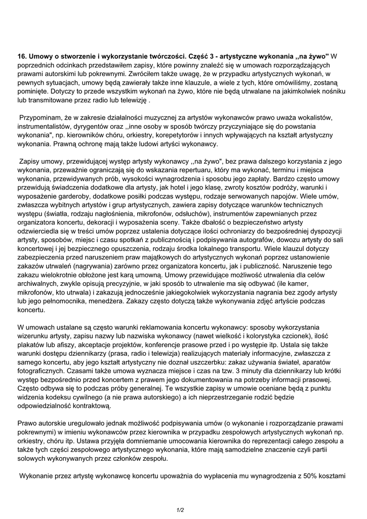 16. Umowy o stworzenie i wykorzystanie twórczości. Część 3 - artystyczne wykonania ,,na żywo'' W poprzednich odcinkach przedstawiłem zapisy, które powinny znaleźć się w umowach rozporządzających prawami autorskimi lub pokrewnymi. Zwróciłem także uwagę, że w przypadku artystycznych wykonań, w pewnych sytuacjach, umowy będą zawierały także inne klauzule, a wiele z tych, które omówiliśmy, zostaną pominięte. Dotyczy to przede wszystkim wykonań na żywo, które nie będą utrwalane na jakimkolwiek nośniku lub transmitowane przez radio lub telewizję . Przypominam, że w zakresie działalności muzycznej za artystów wykonawców prawo uważa wokalistów, instrumentalistów, dyrygentów oraz ,,inne osoby w sposób twórczy przyczyniające się do powstania wykonania", np. kierowników chóru, orkiestry, korepetytorów i innych wpływających na kształt artystyczny wykonania. Prawną ochronę mają także ludowi artyści wykonawcy. Zapisy umowy, przewidującej występ artysty wykonawcy ,,na żywo", bez prawa dalszego korzystania z jego wykonania, przeważnie ograniczają się do wskazania repertuaru, który ma wykonać, terminu i miejsca wykonania, przewidywanych prób, wysokości wynagrodzenia i sposobu jego zapłaty. Bardzo często umowy przewidują świadczenia dodatkowe dla artysty, jak hotel i jego klasę, zwroty kosztów podróży, warunki i wyposażenie garderoby, dodatkowe posiłki podczas występu, rodzaje serwowanych napojów. Wiele umów, zwłaszcza wybitnych artystów i grup artystycznych, zawiera zapisy dotyczące warunków technicznych występu (światła, rodzaju nagłośnienia, mikrofonów, odsłuchów), instrumentów zapewnianych przez organizatora koncertu, dekoracji i wyposażenia sceny. Także dbałość o bezpieczeństwo artysty odzwierciedla się w treści umów poprzez ustalenia dotyczące ilości ochroniarzy do bezpośredniej dyspozycji artysty, sposobów, miejsc i czasu spotkań z publicznością i podpisywania autografów, dowozu artysty do sali koncertowej i jej bezpiecznego opuszczenia, rodzaju środka lokalnego transportu. Wiele klauzul dotyczy zabezpieczenia przed naruszeniem praw majątkowych do artystycznych wykonań poprzez ustanowienie zakazów utrwaleń (nagrywania) zarówno przez organizatora koncertu, jak i publiczność. Naruszenie tego zakazu wielokrotnie obłożone jest karą umowną. Umowy przewidujące możliwość utrwalenia dla celów archiwalnych, zwykle opisują precyzyjnie, w jaki sposób to utrwalenie ma się odbywać (ile kamer, mikrofonów, kto utrwala) i zakazują jednocześnie jakiegokolwiek wykorzystania nagrania bez zgody artysty lub jego pełnomocnika, menedżera. Zakazy często dotyczą także wykonywania zdjęć artyście podczas koncertu. W umowach ustalane są często warunki reklamowania koncertu wykonawcy: sposoby wykorzystania wizerunku artysty, zapisu nazwy lub nazwiska wykonawcy (nawet wielkość i kolorystyka czcionek), ilość plakatów lub afiszy, akceptacje projektów, konferencje prasowe przed i po występie itp. Ustala się także warunki dostępu dziennikarzy (prasa, radio i telewizja) realizujących materiały informacyjne, zwłaszcza z samego koncertu, aby jego kształt artystyczny nie doznał uszczerbku: zakaz używania świateł, aparatów fotograficznych. Czasami także umowa wyznacza miejsce i czas na tzw. 3 minuty dla dziennikarzy lub krótki występ bezpośrednio przed koncertem z prawem jego dokumentowania na potrzeby informacji prasowej. Często odbywa się to podczas próby generalnej. Te wszystkie zapisy w umowie oceniane będą z punktu widzenia kodeksu cywilnego (a nie prawa autorskiego) a ich nieprzestrzeganie rodzić będzie odpowiedzialność kontraktową. Prawo autorskie uregulowało jednak możliwość podpisywania umów (o wykonanie i rozporządzanie prawami pokrewnymi) w imieniu wykonawców przez kierownika w przypadku zespołowych artystycznych wykonań np. orkiestry, chóru itp. Ustawa przyjęła domniemanie umocowania kierownika do reprezentacji całego zespołu a także tych części zespołowego artystycznego wykonania, które mają samodzielne znaczenie czyli partii solowych wykonywanych przez członków zespołu. Wykonanie przez artystę wykonawcę koncertu upoważnia do wypłacenia mu wynagrodzenia z 50% kosztami 1/2 uzyskania przychodu, jako że prawa do artystycznych wykonań należą do praw pokrewnych, a ustawa o podatku dochodowym od osób fizycznych przewiduje przy korzystaniu z praw pokrewnych przez twórców takie właśnie koszty uzyskania. Aby móc naliczyć podatek z 50% kosztami uzyskania, artysta wykonawca nie musi legitymować się dyplomem ukończenia uczelni czy szkoły artystycznej, nie musi należeć do związków twórczych lub posiadać uprawnień nadanych przez ministra czy jakąś organizację. Zgodnie z ustawą przedmiotem ochrony jest każde artystyczne wykonanie utworu lub dzieła sztuki ludowej i nie ma znaczenia jego wartość (artystyczna czy ekonomiczna), przeznaczenie i sposób wyrażenia. Za artystę wykonawcę uważa się zarówno zawodowców, jak i amatorów, dorosłych i dzieci, byleby interpretowali utwór. Prawo nie traktuje jak artystów wykonawców, z przysługującymi im prawami pokrewnymi, artystów cyrkowych, nauczycieli muzyki, jurorów oceniających konkursy muzyczne, realizatorów dźwięku, prezenterów dyskotekowych, konferansjerów zapowiadających li tylko kolejne występy. Dla dalszej eksploatacji konkretnego artystycznego wykonania na żywo decydujące znaczenie ma jego utrwalenie lub nadanie radiowe i telewizyjne (także Internetowe), umożliwiające jego wtórne utrwalenie przez odbiorcę programu. Moment utrwalenia przesądza o możliwości korzystania z wykonania bez fizycznego udziału artysty, za pośrednictwem nośnika, na którym wykonanie zapisano, poprzez wytwarzanie egzemplarzy, wprowadzanie ich do obrotu, odtwarzanie, nadawanie i reemitowanie, wprowadzanie do sieci komputerowych itd. Gdyby koncert na żywo