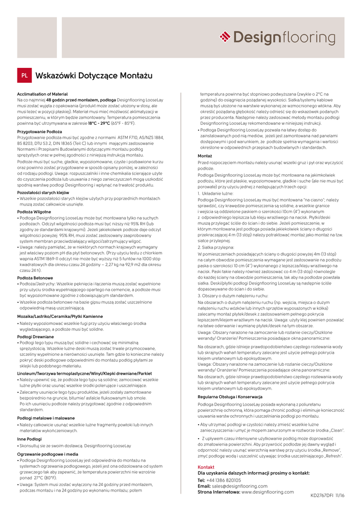 PL Wskazówki Dotyczące Montażu Acclimatisation of Material Na co najmniej 48 godzin przed montażem, podłoga Designflooring LooseLay musi zostać wyjęta z opakowania (produkt może zostać ułożony w stosy, ale musi leżeć w pozycji płaskiej). Materiał musi mieć możliwość aklimatyzacji w pomieszczeniu, w którym będzie zamontowany. Temperatura pomieszczenia powinna być utrzymywana w zakresie 18°C - 29°C (65°F - 85°F). temperatura powinna być stopniowo podwyższana (zwykle o 2°C na godzinę) do osiągnięcia pożądanej wysokości. Siatka/systemy kablowe muszą byś ułożone na warstwie wykonanej ze wzmocnionego włókna. Aby określić pożądaną głębokość należy odnieść się do wskazówek podanych przez producenta. Następnie należy zastosować metody montażu podłogi Designflooring LooseLay rekomendowane w niniejszej instrukcji. Przygotowanie Podłoża Przygotowanie podłoża musi być zgodne z normami ASTM F710, AS/NZS 1884, BS 8203, DTU 53.2, DIN 18365 (Teil C) lub innymi mającymi zastosowanie Normami i Przepisami Budowlanymi dotyczącymi montażu podłóg sprężystych oraz w pełnej zgodności z niniejszą instrukcją montażu. • Podłoga Designflooring LooseLay pozwala na łatwy dostęp do zainstalowanych pod nią mediów, jeżeli jest zamontowana nad panelami dostępowymi i pod warunkiem, że podłoże spełnia wymagania i wartości określone w odpowiednich przepisach budowlanych i standardach. Podłoże musi być suche, gładkie, wypoziomowane, czyste i pozbawione kurzu oraz powinno zostać przygotowane w sposób opisany poniżej, w zależności od rodzaju podłogi. Uwaga: rozpuszczalniki i inne chemikalia ścierające użyte do czyszczenia podłoża lub usuwania z niego zanieczyszczeń mogą uszkodzić spodnią warstwę podłogi Designflooring i wpłynąć na trwałość produktu. Przed rozpoczęciem montażu należy usunąć wszelki gruz i pył oraz wyczyścić podłoże. Pozostałości starych klejów • Wszelkie pozostałości starych klejów użytych przy poprzednich montażach muszą zostać całkowicie usunięte. 1. Układanie luźne: Podłoża Wilgotne • Podłoga Designflooring LooseLay może być montowana tylko na suchych podłożach. Odczyt wilgotności podłoża musi być niższy niż 95% RH (lub zgodny ze standardami krajowymi). Jeżeli jakiekolwiek podłoże daje odczyt wilgotności powyżej 95% RH, musi zostać zastosowany zaaprobowany system membran przeciwdziałający wilgoci/zatrzymujący wilgoć. • Uwaga: należy pamiętać, że w niektórych normach krajowych wymagany jest właściwy poziom pH dla płyt betonowych. (Przy użyciu testu z chlorkiem wapnia ASTM 1869-11 odczyt nie może być wyższy niż 5 funtów na 1000 stóp kwadratowych dla okresu czasu 24 godziny – 2,27 kg na 92,9 m2 dla okresu czasu 24 h). Podłoża Betonowe • Podłoża/Jastrychy: Wszelkie pęknięcia i łączenia muszą zostać wypełnione przy użyciu środka wypełniającego opartego na cemencie, a podłoże musi być wypoziomowane zgodnie z obowiązującym standardem. • Wszelkie podłoża betonowe na bazie gipsu muszą zostać uszczelnione odpowiednią masą uszczelniającą. Mozaika/Lastriko/Ceramika/Płytki Kamienne • Należy wypoziomować wszelkie fugi przy użyciu właściwego środka wygładzającego, a podłoże musi być solidne. Podłogi Drewniane • Podłogi tego typu muszą być solidne i cechować się minimalną sprężystością. Wszelkie luźne deski muszą zostać trwale przymocowane, szczeliny wypełnione a nierówności usunięte. Tam gdzie to konieczne należy pokryć deski podłogowe odpowiednimi do montażu podłóg płytami ze sklejki lub podobnego materiału. Linoleum/Tworzywa termoplastyczne/Winyl/Klepki drewniane/Parkiet • Należy upewnić się, że podłoża tego typu są solidne; zamocować wszelkie luźne płytki oraz usunąć wszelkie środki polerujące i uszczelniające. • Zalecamy usunięcie tego typu produktów, jeżeli zostały zamontowane bezpośrednio na gruncie, bitumie/ asfalcie fluksowanym lub smole. Po ich usunięciu podłoże należy przygotować zgodnie z odpowiednim standardem. Podłogi metalowe i malowane Montaż Podłoga Designflooring LooseLay może być montowana na jakimkolwiek podłożu, które jest płaskie, wypoziomowane, gładkie i suche (ale nie musi być porowate) przy użyciu jednej z następujących trzech opcji: Podłoga Designflooring LooseLay musi być montowana “na ciasno”; należy sprawdzić, czy krawędzie pomieszczenia są solidne, a wszelkie granice i wejścia są oddzielone paskiem o szerokości 10cm (4”) wykonanym z odpowiedniego lepiszcza lub kleju wrażliwego na nacisk. Płytki/deski muszą przylegać ściśle do ścian i do siebie. Jeżeli pomieszczenie, w którym montowana jest podłoga posiada jakiekolwiek ściany o długości przekraczającej 4 m (13 stóp) należy potraktować montaż jako montaż na tzw. siatce przylepnej. 2.Siatka przylepna: W pomieszczeniach posiadających ściany o długości powyżej 4m (13 stóp) na całym obwodzie pomieszczenia wymagane jest zastosowanie na podłożu paska o szerokości 10 cm (4’’) wykonanego z lepiszcza/kleju wrażliwego na nacisk. Paski takie należy również zastosować co 4 m (13 stóp) równolegle do każdej ściany na obwodzie pomieszczenia, tak aby na podłodze powstała siatka. Deski/płytki podłogi Designflooring LooseLay są następnie ściśle dopasowywane do ścian i do siebie. 3.Obszary o dużym natężeniu ruchu: Na obszarach o dużym natężeniu ruchu (np. wejścia, miejsca o dużym natężeniu ruchu wózków lub innych sprzętów wyposażonych w kółka) zalecamy montaż płytek/desek z zastosowaniem pełnego pokrycia lepiszczem/klejem wrażliwym na nacisk. Uwaga: użyty klej powinien pozwalać na łatwe oderwanie i wymianę płytek/desek na tym obszarze. Uwaga: Obszary narażone na zamoczenie lub rozlanie cieczy/Oszklone werandy/ Oranżerie/ Pomieszczenia posiadające okna panoramiczne: Na obsz