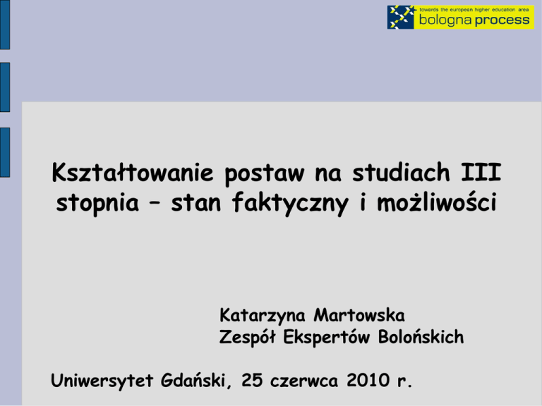 Kształtowanie postaw na studiach III stopnia – stan faktyczny i możliwości Katarzyna Martowska Zespół Ekspertów Bolońskich Uniwersytet Gdański, 25 czerwca 2010 r. Plan referatu Postawy w kontekście Procesu Bolońskiego i kształcenia akademickiego Standardy kształcenia na studiach doktoranckich a kształtowanie postaw Dobre praktyki Sposoby kształtowania postaw na studiach III stopnia Badanie postaw – przykład AM w Gdańsku Cele Procesu Bolońskiego a cele akademickie (w kontekście postaw) Przygotowanie absolwentów do bycia aktywnym obywatelem w demokratycznym społeczeństwie Rozwój poznawczy i osobowy uczących się Kształtowanie postaw przyszłych elit społecznych i profesjonalnych Zaniedbywane? KRK a POSTAWY Efekty uczenia się: 1) Wiedza – przekazać ją stosunkowo łatwo 2) Umiejętności – trenować je znacznie trudniej 3) Postawy – kształtować jest bardzo trudno „wzbudzają emocje” trudno je „badać” bezpośrednio ukształtowane zazwyczaj procentują z dużym odroczeniem, w konkretnych, życiowych sytuacjach, w rzeczywistym działaniu Standardy kształcenia na studiach III stopnia – 21.03.2008 r. CK – Centralna Komisja do Spraw Stopni i Tytułów KRASP – Konferencja Rektorów Akademickich Szkół Polskich KRD – Krajowa Reprezentacja Doktorantów PAN – Polska Akademia Nauk PSRP – Parlament Studentów Rzeczypospolitej Polskiej RGSW – Rada Główna Szkolnictwa Wyższego RG JBR – Rada Główna Jednostek Badawczo-Rozwojowych ZPB – Zespół Promotorów Bolońskich Standardy kształcenia na studiach III stopnia – 11.12.2008 r. Uchwała RG Kształcenie na studiach doktoranckich powinno obejmować: kształtowanie postaw etycznych i prospołecznych w kontekście działalności badawczej i społecznej roli uczonego zostały określone ogólne efekty uczenia się szczegółowe efekty określa uczelnia biorąc pod uwagę swoją misję, koncepcję kształcenia na studiach doktoranckich oraz uwarunkowania zewnętrzne i oczekiwania otoczenia Standardy kształcenia na studiach III stopnia Efekty uczenia się w zakresie postaw: przyczynia się do podtrzymania i doskonalenia etosu wspólnoty naukowej i/lub zawodowej wykazuje samokrytycyzm w pracy twórczej, działa na rzecz jej usprawnienia i wzrostu efektywności ponosi odpowiedzialność za pracę własną i współpracowników wykazuje inicjatywę w określaniu nowych obszarów badań i/lub tworzenia nowych miejsc pracy w społeczeństwie opartym na wiedzy jest świadomy swojej roli społecznej i znaczenia prowadzonej działalności dla rozwoju społecznego i kształtowania społeczeństwa obywatelskiego Przykład: Studia Doktoranckie na Wydziale Filologicznym UŁ Bazą programu: Standardy kształcenia na studiach III stopnia Określone kompetencje szczegółowe w zakresie postaw: szczególny nacisk położony na kształtowanie postaw prospołecznych: aktywności społecznej, kreatywności, odpowiedzialności i krytycyzmu Przykłady zajęć: Pracownia kreatywności Pracownia działań prospołecznych (zorganizowanie wydarzenia społecznościowo-kulturalnego) Praktyki w wybranych społecznościach pozauniwersyteckich (uznawanie osiągnięć z kształcenia pozaformalnego) Przykłady zajęć kształtujących postawy etyczne Głównie wykłady Etyka nauki i biznesu Etyka badań naukowych Ochrona własności intelektualnej Filozofia nauki Jak je prowadzić? Cel procesu kształcenia – postawy Pytania, które powracają… 1. Jakie postawy kształtować? 2. W jaki sposób kształtować postawy? 3. Jak sprawdzić czy pożądane postawy zostały ukształtowane? Kształtowanie postaw na studiach III stopnia w relacji Mistrz-Uczeń Poprzez: Wzorce Przekaz ustny, dyskusja Adekwatne wymagania Obserwację, aktywne słuchanie i udzielanie informacji zwrotnych (konstruktywna krytyka) Motywowanie Kształtowanie postaw na studiach III stopnia Reagowanie na odstępstwa od etosu akademickiego, na łamanie zasad etycznych i dobrych obyczajów w nauce Przekazywanie wzorców w trakcie wspólnie prowadzonych projektów badawczych Inspirowanie do podejmowania zaangażowania w działania społecznie użyteczne Kształtowanie postaw - ewaluacja Badanie postaw Badanie postaw - przykład „Ocena postaw etycznych nauczycieli akademickich oraz studentów Akademii Medycznej w Gdańsku” Artykuł z badań autorstwa: Marty Michowskiej, Jacka Kaczmarka, Krystyny Basińskiej i Marka Olejniczaka Badanie postaw - przykład Cel: Określenie postaw i wartości jakie powinny cechować nauczycieli akademickich i studentów Poznanie opinii studentów i nauczycieli na temat przejawianych w zachowaniu wartości i postaw u obu grup Badanie postaw - przykład Osoby badane: -Studenci II, III i VI roku (N=694) -Nauczyciele (N=702) Miejsce: Akademia Medyczna w Gdańsku Czas badań: 2006-2008 Badanie postaw - przykład Sposób realizacji: I etap – określenie pożądanych postaw etycznych i wartości u obu badanych grup II etap – oszacowanie stopnia obecności tychże postaw u studentów i nauczycieli akademickich Badanie postaw – wyniki etapu I Najbardziej pożądane postawy/cechy u nauczycieli: Sprawiedliwość Sprawiedliwe ocenianie Rzetelne przygotowywanie zajęć Szanowanie godności osobistej Życzliwość Wysoka kultura bycia Badanie postaw – wyniki etapu I Najbardziej pożądane postawy/cechy u studentów: Odpowiedzialność Sumienność Badanie postaw – wyniki etapu II Ocena stopnia obecności postaw/cech u nauczycieli: w ocenie studentów VI roku (punkty od 1 do 5): Szanowanie czasu i harmonogramu zajęć: 1,99 Sprawiedliwość w ocenianiu wiedzy: 2,34 Kultura bycia, dobre wychowanie: 2,44 Życzliwość, cierpliwość: 2,48 Szacunek dla godności osobistej i praw studenta: 2,53 Badanie postaw – wyniki etapu II Brak dyskryminacji w ocenianiu i dostępie do wiedzy: 2,53 Dawanie dobrego przykładu właściwych postaw: 2,70 Dbałość o wizerunek zawodu i uczelni: 2,88 Przeciwstawianie się oszustwom i plagiatorstwu: 