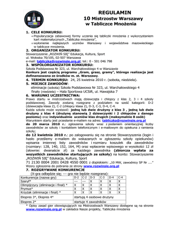 REGULAMIN 10 Mistrzostw Warszawy w Tabliczce MnoŜenia 1. CELE KONKURSU: • Popularyzacja zabawowej formy uczenia się tabliczki mnoŜenia z wykorzystaniem kart matematycznych „Tabliczka mnoŜenia”, • wyłonienie najlepszych uczniów Warszawy i województwa mazowieckiego w tabliczce mnoŜenia. 2. ORGANIZATOR KONKURSU: Stowarzyszenie „ROZWIŃ SIĘ” Edukacja, Kultura, Sport ul. Wołoska 70/105, 02-507 Warszawa e-mail: [email protected]; tel.: 0 - 501 046 798 3. WSPÓŁORGANIZATOR KONKURSU: Szkoła Podstawowa Nr 323, ul. Warchałowskiego 4 w Warszawie Konkurs jest częścią programu „Gram, grasz, gramy”, którego realizacja jest dofinansowana ze środków m. st. Warszawy. 4. TERMIN KONKURSU: 24, 25 kwietnia 2010 r. (sobota, niedziela). 5. MIEJSCE ZAWODÓW: eliminacje (sobota) Szkoła Podstawowa Nr 323, ul. Warchałowskiego 4 finały (niedziela) – Hala Sportowa UCSiR, ul. Hawajska 7 6. WARUNKI UCZESTNICTWA: Prawo startu w mistrzostwach mają dziewczęta i chłopcy z klas 2, 3 i 4 szkoły podstawowej. Zawody zostaną rozegrane z podziałem na sześć kategorii: D-2 (dziewczęta klasa 2), C-2 (chłopcy klasa 2), D-3, C-3, D-4, C-4. KaŜda szkoła moŜe wystawić: jedną lub dwie druŜyny z klas 3 , jedną lub dwie druŜyny z klas 4 (druŜynę stanowią 2 dziewczynki i 2 chłopców z danego poziomu) oraz indywidualnie uczniów klas drugich (maksymalnie 8 osób) Warunkiem startu jest przesłanie e-mailem na adres: [email protected] do 20 marca 2010 r.: zgłoszenia szkoły wraz z podaniem orientacyjnej liczby zawodników ze szkoły i kontaktem telefonicznym i e-mailowym do opiekuna z ramienia szkoły; do 12 kwietnia 2010 r.: po zalogowaniu się na stronie Stowarzyszenia (login i hasło prześlemy e-mailem do wskazanych w zgłoszeniu szkoły opiekunów) wpisania imiennej listy zawodników i rozmiaru koszulek dla zawodników (rozmiary: 128, 140, 152, 164, M) oraz wpłacenie wpisowego w wysokości 12 zł (słownie: dwanaście zł) za kaŜdego zawodnika (zbiorcza wpłata za wszystkich zawodników startujących ze szkoły) na konto: Stowarzyszenie „ROZWIŃ SIĘ” Edukacja, Kultura, Sport 71 2130 0004 2001 0428 4550 0001 z dopiskiem: „10 MW, zawodnicy SP Nr ....” Wzory zgłoszenia do pobrania ze strony www.rozwinsie.org.pl 7. ROZGRYWANE KONKURENCJE (X-gra odbędzie się; --- gra nie będzie rozegrana): Konkurencja (nazwa gry) Szeryf* Olimpijczycy (eliminacje i finał) * Prymus* KrzyŜak (eliminacje i finał) * D-2 C-2 D-3 C-3 D-4 C-4 --X X X --X X X X X X X X X X X X X X X X X X X Ekspres 3*, Ekspres 4* startują 4 osobowe druŜyny Ekspres 2* startuje 4 zawodników * Opisy zasad gier obowiązujących na Mistrzostwach Warszawy dostępne są na stronie www.rozwinsie.org.pl w zakładce Nasze projekty, Tabliczka mnoŜenia 8. PROGRAM ZAWODÓW: 1 dzień (sobota, 24 kwietnia 2010 r.): 9.00 – 16.00 – „Olimpijczycy” (eliminacje), „KrzyŜak” (eliminacje), „Prymus” i „Szeryf”. Przyjazd reprezentacji szkół według szczegółowego programu minutowego, który prześlemy do szkół po 20.04.2010 r. Czas rozegrania konkurencji przez reprezentację szkoły około 2,5 godziny. 2 dzień (niedziela, 25 kwietnia 2010r.): 10.00 Uroczyste otwarcie zawodów. 10.15-12.30 „Olimpijczycy” (finały), „KrzyŜak” (finały), „Ekspres 2”, „Ekspres 3”, „Ekspres 4” (serie na czas), „KrzyŜak” dla opiekunów reprezentacji i rodziców. 12.30-14.00 Czas wolny. Zapraszamy na poczęstunek i zabawy grami Granny. 14.00-15.00 Uroczyste zakończenie zawodów. Dekoracja zwycięzców. 9. ZASADY PUNKTACJI Zasady punktacji zostaną szczegółowo ustalone i przesłane do szkół, gdy organizatorzy poznają orientacyjną liczbę zawodników mistrzostw. 10. NAGRODY NAGRODY INDYWIDUALNIE: - za zajęcie miejsc 1-3 w klasyfikacji końcowej w kaŜdej kategorii wręczone będą dyplomy, medale i nagrody; za zajęcie miejsc 4-5 w klasyfikacji końcowej w kaŜdej kategorii wręczone będą dyplomy i nagrody; za zajęcie miejsc 1-5 w grze „KrzyŜak” w kaŜdej kategorii wręczone będą dyplomy i nagrody; za zajęcie miejsc 1-5 w grze „Olimpijczycy” w kaŜdej kategorii wręczone będą dyplomy i nagrody; KLASYFIKACJA DRYśYNOWA (dotyczy druŜyn z klas 3 i 4): - za zajęcie miejsc 1-5 w klasyfikacji druŜynowej klas 3 wręczone będą puchary i dyplomy; za zajęcie miejsc 1-5 w klasyfikacji druŜynowej klas 4 wręczone będą puchary i dyplomy; KLASYFIKACJA DRYśYNOWA „DEBIUT” (dotyczy druŜyn z klas 3 i 4) - - Za druŜynę debiutującą oprócz szkół, które wystartują po raz pierwszy w zawodach będą teŜ uznawane szkoły, które nie startowały w mistrzostwach w latach 2007-2009. za najlepszy debiut w konkursie w klasyfikacji druŜynowej klas 3 wręczone będą puchary i dyplomy dla 3 debiutujących szkół; za najlepszy debiut w konkursie w klasyfikacji druŜynowej klas 4 wręczone będą puchary i dyplomy dla 3 debiutujących szkół; GRA „EKSPRES” za zajęcie miejsc 1-5 w klasyfikacji gry „Ekspres 2”, „Ekspres 3” i „Ekspres 4” wręczone będą „ekspresy” i dyplomy. KLASYFIKACJA GENERALNA: - za zajęcie miejsc 1-5 w klasyfikacji generalnej szkół (łączne punkty lepszej druŜyny klas 3 i lepszej druŜyny klas 4 z danej szkoły) wręczone będą puchary i dyplomy; KAśDY ZAWODNIK OTRZYMA: - pamiątkową koszulkę; pamiątkowy znaczek 11. POSTANOWIENIA KOŃCOWE • • • Organizator zapewnia opiekę lekarską podczas zawodów, uczestnicy zobowiązani są do startu w obuwiu sportowym, interpretacja regulaminu naleŜy do Organizatora. Organizator 10 MWwTM Małgorzata Zambrowska