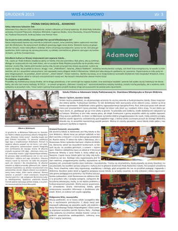 GRUDZIEŃ 2013 WIEŚ ADAMOWO str. 3 POZNAJ SWOJĄ OKOLICĘ… ADAMOWO Sołtys Adamowa Sylwester Żok: Adamowo liczy obecnie 1011 mieszkańców. Jestem sołtysem już trzecią kadencję. W skład Rady Sołeckiej wchodzą: Krzysztof Piątyszek, Arkadiusz Michalski, Eugeniusz Buśko, Irena Olszewska, Krzysztof Rostkowski, Fryderyk Kaczmarek, Andrzej Duber oraz Roman Itner. Czy to jest ta sama wioska, którą pamięta Pan sprzed kilkudziesięciu lat? Nasza miejscowość bardzo się zmieniła w ostatnich czasach, teraz jesteśmy takim zapleczem mieszkalnym dla Wolsztyna. Na wytyczonych działkach powstają ciągle nowe domy. Niewiele mamy już gospodarstw rolnych, może naliczyłbym z dziesięć, które utrzymują się wyłącznie z pracy na roli. Jest parę gospodarstw, które zajmują się uprawą pieczarek, są zakłady rzemieślnicze, głównie zajmujące się budownictwem, są firmy transportowe… Ośrodkiem kultury w Waszej miejscowości jest zapewne Szkoła… Tak, często ja i Rada Sołecka współpracujemy ze Szkołą. Ona jest potrzebna. Były plany, aby ją zamknąć, dlatego że uczęszczało do niej mało dzieci, ale na szczęście Rada Miejska przychyliła się do prośby mieszkańców i mamy filię. Szkoła pełni bardzo ważną rolę, bo jest przynajmniej okazja się poznać. Ludzie się często nie znają. Na przykład ta strona z drugą – tzw. „Piekiełkiem”, dawniej „Małym Niałkiem”. Jesteśmy wioską bardzo rozległą. Jak kładli linię energetyczną, to wyszło 11 kilometrów, ale to z wszystkimi zakamarkami, tak naprawdę mamy długość około 6 kilometrów. Szkoła jest taką okazją do spotkania się i poznania. Organizujemy w roku parę imprez integracyjnych, na przykład „Dzień seniora”, „Dzień kobiet”, Festyn rodzinny. Bardzo się cieszę, że za mojej kadencji wznowiło działalność Koło Gospodyń Wiejskich, które także chętnie bierze udział w różnych uroczystościach naszej wsi. Na naszych mieszkańców zawsze można liczyć. Co zrobiono, co potrzeba... Przydałby się chodnik przy naszej drodze, ale to droga powiatowa, a ten samorząd ma napięty budżet, inne ważniejsze wydatki i pewnie tak szybko się tej inwestycji nie doczekamy, ale cały czas mamy nadzieję. W 2011r. - w ramach programu „Odnowa i rozwój wsi”- wyremontowaliśmy wiejską świetlicę, zostało trochę pieniędzy, ale o wydaniu zadecydujemy w przyszłym roku. Teraz razem z gminą finansujemy projekt budowy drogi od oczyszczalni do posesji pana Jęczmionki. Szkoła Filialna w Adamowie Szkoły Podstawowej im. Stanisława Mikołajczyka w Starym Widzimiu Marcin Tajchert, dyrektor Szkoły Śmiało można powiedzieć, że od pierwszego września nic się nie zmieniło w funkcjonowaniu Szkoły. Dzieci mają bardzo dobrą opiekę. Funkcjonuje świetlica. To taki dodatkowy twór wymuszony przez obecne czasy, rodzice są teraz bardzo zapracowani. Dodatkowe cztery godziny zagospodarowuje specjalna firma. Pani, która jest przez nich zatrudniona jest pracownikiem naszej placówki, dlatego też dzieci cały dzień są z osobami, które znają. To jest dobry pomysł, wiem, że „podłapują” go już inne szkoły w gminie. Ta placówka jest zadbana, środki dydaktyczne nabywane są na bieżąco. Mieliśmy w tym roku awarię pieca, ale dzięki funduszom z gminy wszystko udało się szybko naprawić. Chcę jeszcze podkreślić, że dzieci w Adamowie są bardzo dobrze przygotowywane do nauki. Kiedy ostatnio przeglądaliśmy wyniki egzaminu szóstoklasisty pod względem tego, z której szkoły uczniowie przyszli do Starego Widzimia, okazało się, że wszystkie reprezentują wysoki poziom. Można to zresztą sprawdzić, nasza Szkoła miała jeden z najwyższych wyników w regionie. Album o Wolsztynie 12 grudnia br. w Bibliotece Publicznej im. Stanisława Platera odbyła się promocja albumu fotograficznego „Wolsztyn mniej znany”. Autorką książki jest pani Elżbieta Kaszyńska. To pierwsza publikacja tego typu o współczesnym Wolsztynie. Pomysł na wydanie albumu pojawił się rok temu i jest wynikiem połączenia zainteresowań autorki fotografią oraz zamiłowania do naszego miasta. W albumie znalazło się ponad 120 zdjęć. „Wolsztyn mniej znany” prezentuje miasto i jego najważniejsze obiekty. Za pomocą zdjęć przedstawione jest w nim serce Wolsztyna i oddana jest jego atmosfera. Ukazane miejsca często są nieznane nie tylko dla przyjezdnych, ale również i dla mieszkańców. W albumie zawarte są zdjęcia przyrody, głównych ulic, najważniejszych budynków czy atrakcji turystycznych oraz zakamarków uliczek. Zdjęcia ułożone są w proponowaną trasę miejsc, które warto zobaczyć. Wyrazy uznania za pomysł i zmysł artystyczny otrzymała również pani Ela z rąk zastępczyni Burmistrza Justyny Mikołajewskiej. Spotkanie uświetniła Klaudia Tomiak pięknie śpiewając polskie kolędy, a na pianinie towarzyszyła jej Irmina Marszałek. Grażyna Kramarek, nauczycielka Od września Szkoła w Adamowie jest filią Szkoły w Starym Widzimiu. Mamy teraz po jednym oddziale w każdym roczniku w klasach 1-3 oraz dwie grupy przedszkolne. Razem mamy 77 dzieci nie tylko z Adamowa, ale i z Komorowa. Dzieci są bardzo kochane i chętne do działania. Bierzemy udział we wszystkich konkursach, w których się da, na szczeblu gminnym, a czasem – rejonowym. Ostatnio zdobyliśmy laury za udział w V Gminnym Konkursie Wiedzy o Janie Pawle II, który odbył się w Świętnie. Często nasza Szkoła pełni też taką rolę kulturotwórczą we wsi. Każdego roku organizowany jest festyn rodzinny, przygotowujemy Jasełka, wystawiane na wiejskiej sali, przychodzi bardzo dużo rodziców i mieszkańców. Trochę się zmartwiliśmy, kiedy pojawiły się plany likwidacji naszej placówki, bo wszelkie sprawy związane z kulturą wsi to głównie działalność Rady Rodziców i Szkoły. Na szczęście zostaliśmy filią. Teraz chwalimy sobie taką organizację, współpracę