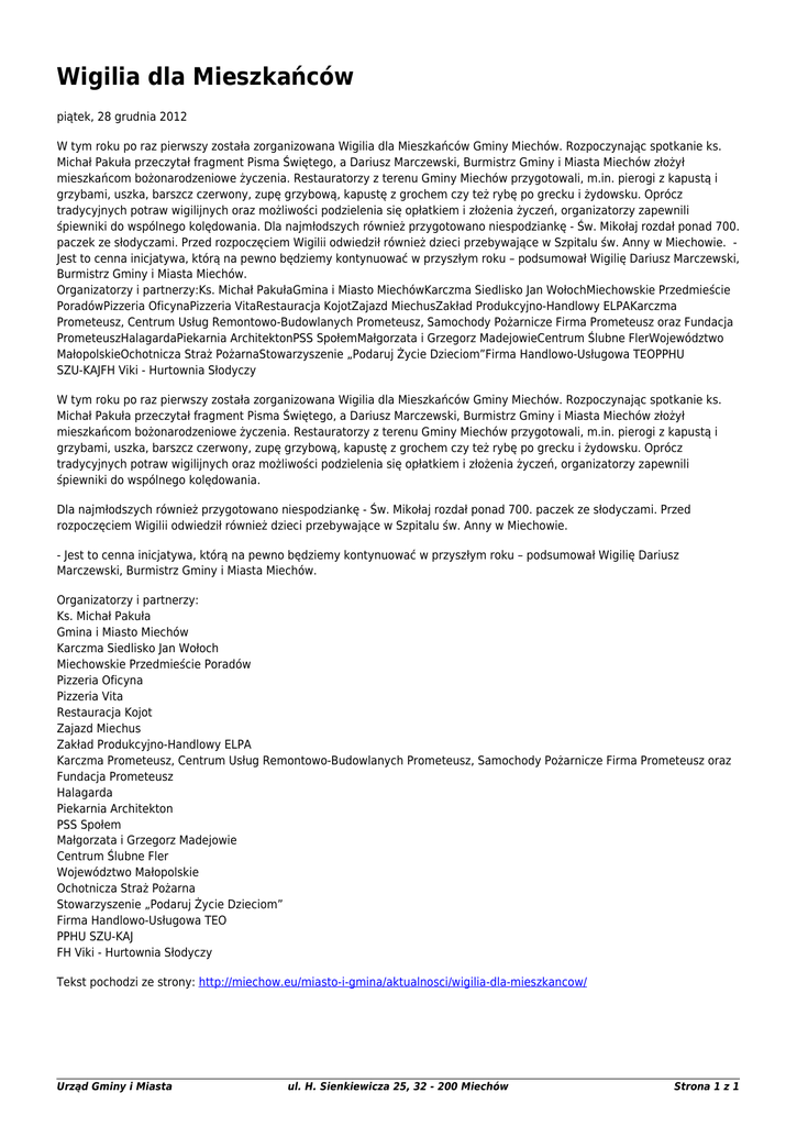 Wigilia dla Mieszkańców piątek, 28 grudnia 2012 W tym roku po raz pierwszy została zorganizowana Wigilia dla Mieszkańców Gminy Miechów. Rozpoczynając spotkanie ks. Michał Pakuła przeczytał fragment Pisma Świętego, a Dariusz Marczewski, Burmistrz Gminy i Miasta Miechów złożył mieszkańcom bożonarodzeniowe życzenia. Restauratorzy z terenu Gminy Miechów przygotowali, m.in. pierogi z kapustą i grzybami, uszka, barszcz czerwony, zupę grzybową, kapustę z grochem czy też rybę po grecku i żydowsku. Oprócz tradycyjnych potraw wigilijnych oraz możliwości podzielenia się opłatkiem i złożenia życzeń, organizatorzy zapewnili śpiewniki do wspólnego kolędowania. Dla najmłodszych również przygotowano niespodziankę - Św. Mikołaj rozdał ponad 700. paczek ze słodyczami. Przed rozpoczęciem Wigilii odwiedził również dzieci przebywające w Szpitalu św. Anny w Miechowie. Jest to cenna inicjatywa, którą na pewno będziemy kontynuować w przyszłym roku – podsumował Wigilię Dariusz Marczewski, Burmistrz Gminy i Miasta Miechów. Organizatorzy i partnerzy:Ks. Michał PakułaGmina i Miasto MiechówKarczma Siedlisko Jan WołochMiechowskie Przedmieście PoradówPizzeria OficynaPizzeria VitaRestauracja KojotZajazd MiechusZakład Produkcyjno-Handlowy ELPAKarczma Prometeusz, Centrum Usług Remontowo-Budowlanych Prometeusz, Samochody Pożarnicze Firma Prometeusz oraz Fundacja PrometeuszHalagardaPiekarnia ArchitektonPSS SpołemMałgorzata i Grzegorz MadejowieCentrum Ślubne FlerWojewództwo MałopolskieOchotnicza Straż PożarnaStowarzyszenie „Podaruj Życie Dzieciom”Firma Handlowo-Usługowa TEOPPHU SZU-KAJFH Viki - Hurtownia Słodyczy W tym roku po raz pierwszy została zorganizowana Wigilia dla Mieszkańców Gminy Miechów. Rozpoczynając spotkanie ks. Michał Pakuła przeczytał fragment Pisma Świętego, a Dariusz Marczewski, Burmistrz Gminy i Miasta Miechów złożył mieszkańcom bożonarodzeniowe życzenia. Restauratorzy z terenu Gminy Miechów przygotowali, m.in. pierogi z kapustą i grzybami, uszka, barszcz czerwony, zupę grzybową, kapustę z grochem czy też rybę po grecku i żydowsku. Oprócz tradycyjnych potraw wigilijnych oraz możliwości podzielenia się opłatkiem i złożenia życzeń, organizatorzy zapewnili śpiewniki do wspólnego kolędowania. Dla najmłodszych również przygotowano niespodziankę - Św. Mikołaj rozdał ponad 700. paczek ze słodyczami. Przed rozpoczęciem Wigilii odwiedził również dzieci przebywające w Szpitalu św. Anny w Miechowie. - Jest to cenna inicjatywa, którą na pewno będziemy kontynuować w przyszłym roku – podsumował Wigilię Dariusz Marczewski, Burmistrz Gminy i Miasta Miechów. Organizatorzy i partnerzy: Ks. Michał Pakuła Gmina i Miasto Miechów Karczma Siedlisko Jan Wołoch Miechowskie Przedmieście Poradów Pizzeria Oficyna Pizzeria Vita Restauracja Kojot Zajazd Miechus Zakład Produkcyjno-Handlowy ELPA Karczma Prometeusz, Centrum Usług Remontowo-Budowlanych Prometeusz, Samochody Pożarnicze Firma Prometeusz oraz Fundacja Prometeusz Halagarda Piekarnia Architekton PSS Społem Małgorzata i Grzegorz Madejowie Centrum Ślubne Fler Województwo Małopolskie Ochotnicza Straż Pożarna Stowarzyszenie „Podaruj Życie Dzieciom” Firma Handlowo-Usługowa TEO PPHU SZU-KAJ FH Viki - Hurtownia Słodyczy Tekst pochodzi ze strony: http://miechow.eu/miasto-i-gmina/aktualnosci/wigilia-dla-mieszkancow/ Urząd Gminy i Miasta ul. H. Sienkiewicza 25, 32 - 200 Miechów Strona 1 z 1