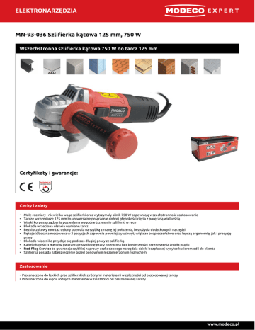 ELEKTRONARZĘDZIA MN-93-036 Szlifierka kątowa 125 mm, 750 W Wszechstronna szlifierka kątowa 750 W do tarcz 125 mm Certyfikaty i gwarancje: Cechy i zalety • • • • • • • • • • Małe rozmiary i niewielka waga szlifierki oraz wytrzymały silnik 750 W zapewniają wszechstronność zastosowania Tarcze w rozmiarze 125 mm to uniwersalne połączenie dobrej głębokości cięcia z poręczną wielkością Wąski korpus urządzenia pozwala na wygodne trzymanie szlifierki w ręce Blokada wrzeciona ułatwia wymianę tarcz Bezkluczykowy montaż osłony pozwala na szybką zmianę jej położenia, bez użycia dodatkowych narzędzi Rękojeść boczna mocowana w 3 pozycjach zapewnia pewniejszy uchwyt, większe bezpieczeństwo oraz lepszą ergonomię, jak i precyzję pracy Blokada włącznika przydaje się podczas długiej pracy ze szlifierką Kabel długości 3 metrów gwarantuje swobodę pracy operatora bez konieczności przenoszenia źródła prądu Red Plug Service to gwarancja szybkiej naprawy uszkodzonego narzędzia dzięki bezpłatnej wysyłce kurierem od i do klienta Szlifierka posiada zabezpieczenie przed ponownym niezamierzonym rozruchem Zastosowanie • Przeznaczona do lekkich prac szlifierskich z różnymi materiałami w zależności od zastosowanej tarczy • Przeznaczona do cięcia różnych materiałów w zależności od zastosowanej tarczy www.modeco.pl ELEKTRONARZĘDZIA Wyposażenie • Klucz widełkowy do wymiany tarcz • Rękojeść boczna Użytkownicy • Ślusarze • Instalatorzy • Glazurnicy • Majsterkowicze • Zbrojarze Produkty powiązane • MN-68-90 Ściernice wypukłe do cięcia stali –MN-68-902 • MN-68-608 Dysk szlifierski do szlifierki kątowej • MN-68-611 Dysk szlifierski elastyczny do szlifierki kątowej • MN-68-90 Ściernice wypukłe do cięcia stali • MN-68-96 Cienkie ściernice płaskie do cięcia stali • MN-68-91 Ściernice do cięcia stali nierdzewnej • MN-68-93 Ściernice płaskie do cięcia aluminium • MN-68-92 Ściernice wypukłe do szlifowania stali • MN-68-94 Ściernice wypukłe do cięcia kamienia • MN-68-95 Ściernice wypukłe do szlifowania kamienia • MN-68-97 Cienkie ściernice płaskie do cięcia stali nierdzewnej • MN-78-13 Ściernice diamentowe segmentowe • MN-78-31 Ściernice diamentowe segmentowe typu Turbo • MN-78-11 Ściernice diamentowe segmentowe Uran • MN-78-10 Ściernice diamentowe segmentowe Saturn • MN-78-30 Ściernice diamentowe typu Turbo Jupiter • MN-78-21 Ściernice diamentowe pełne do szlifierek kątowych • MN-78-20 Ściernice diamentowe pełne Mars • MN-78-411 Ściernica diamentowa do szlifowania • MN-78-412 Ściernica diamentowa do szlifowania • MN-78-413 Ściernica diamentowa do szlifowania • MN-65-75 Piły tarczowe łańcuchowe Dane techniczne Indeks MN-93-036 ** Moc Opakowanie jed nostkowe Opakowanie zbiorcze Waga opakowa nia jednostkowe go Waga opakowa nia zbiorczego [W] [szt] [szt] [kg] [kg] 750 1 1 1.57 1.57 moc 750 W średnica tarczy średnica wrzeciona obroty długość przewodu 115 mm 22,2 mm 12 000 obr/min 3m EAN 5906675345086 ** Nowość w ofercie sprzedażowej. www.modeco.pl ELEKTRONARZĘDZIA Ostrzeżenia • • • • • • Przeczytaj instrukcję obsługi Zawsze używaj ochrony oczu (okulary, gogle lub przyłbice ochronne) Zawsze używaj ochrony rąk (rękawice) Zawsze używaj ochrony dróg oddechowych (maski) Zawsze używaj ochrony słuchu (nauszniki, zatyczki do uszu) INSTRUKCJA OBSŁUGI. Zawsze przestrzegaj wskazówek dotyczących bezpieczeństwa zawartych w instrukcji obsługi i obowiązujących przepisów BHP. Nie przestrzeganie zawartych w niej ostrzeżeń i zaleceń może być przyczyną porażenia prądem, pożaru, a także poważne go uszkodzenia ciała, a nawet śmierci. Należy dokładnie przeczytać i zrozumieć instrukcję obsługi, a także zachować ją do późniejszego wglądu www.modeco.pl