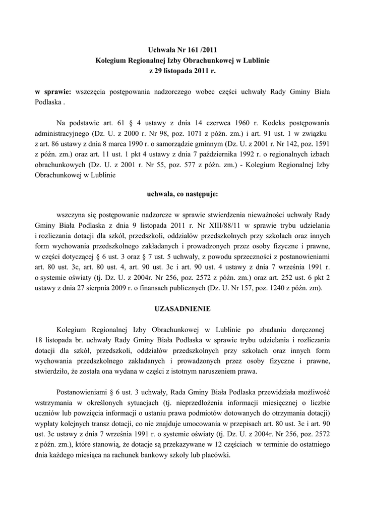 Uchwała Nr 161 /2011 Kolegium Regionalnej Izby Obrachunkowej w Lublinie z 29 listopada 2011 r. w sprawie: wszczęcia postępowania nadzorczego wobec części uchwały Rady Gminy Biała Podlaska . Na podstawie art. 61 § 4 ustawy z dnia 14 czerwca 1960 r. Kodeks postępowania administracyjnego (Dz. U. z 2000 r. Nr 98, poz. 1071 z późn. zm.) i art. 91 ust. 1 w związku z art. 86 ustawy z dnia 8 marca 1990 r. o samorządzie gminnym (Dz. U. z 2001 r. Nr 142, poz. 1591 z późn. zm.) oraz art. 11 ust. 1 pkt 4 ustawy z dnia 7 października 1992 r. o regionalnych izbach obrachunkowych (Dz. U. z 2001 r. Nr 55, poz. 577 z późn. zm.) - Kolegium Regionalnej Izby Obrachunkowej w Lublinie uchwala, co następuje: wszczyna się postępowanie nadzorcze w sprawie stwierdzenia nieważności uchwały Rady Gminy Biała Podlaska z dnia 9 listopada 2011 r. Nr XIII/88/11 w sprawie trybu udzielania i rozliczania dotacji dla szkół, przedszkoli, oddziałów przedszkolnych przy szkołach oraz innych form wychowania przedszkolnego zakładanych i prowadzonych przez osoby fizyczne i prawne, w części dotyczącej § 6 ust. 3 oraz § 7 ust. 5 uchwały, z powodu sprzeczności z postanowieniami art. 80 ust. 3c, art. 80 ust. 4, art. 90 ust. 3c i art. 90 ust. 4 ustawy z dnia 7 września 1991 r. o systemie oświaty (tj. Dz. U. z 2004r. Nr 256, poz. 2572 z późn. zm.) oraz art. 252 ust. 6 pkt 2 ustawy z dnia 27 sierpnia 2009 r. o finansach publicznych (Dz. U. Nr 157, poz. 1240 z późn. zm). UZASADNIENIE Kolegium Regionalnej Izby Obrachunkowej w Lublinie po zbadaniu doręczonej 18 listopada br. uchwały Rady Gminy Biała Podlaska w sprawie trybu udzielania i rozliczania dotacji dla szkół, przedszkoli, oddziałów przedszkolnych przy szkołach oraz innych form wychowania przedszkolnego zakładanych i prowadzonych przez osoby fizyczne i prawne, stwierdziło, że została ona wydana w części z istotnym naruszeniem prawa. Postanowieniami § 6 ust. 3 uchwały, Rada Gminy Biała Podlaska przewidziała możliwość wstrzymania w określonych sytuacjach (tj. nieprzedłożenia informacji miesięcznej o liczbie uczniów lub powzięcia informacji o ustaniu prawa podmiotów dotowanych do otrzymania dotacji) wypłaty kolejnych transz dotacji, co nie znajduje umocowania w przepisach art. 80 ust. 3c i art. 90 ust. 3c ustawy z dnia 7 września 1991 r. o systemie oświaty (tj. Dz. U. z 2004r. Nr 256, poz. 2572 z późn. zm.), które stanowią, że dotacje są przekazywane w 12 częściach w terminie do ostatniego dnia każdego miesiąca na rachunek bankowy szkoły lub placówki. Postanowienie § 7 ust. 5 uchwały regulujące naliczanie odsetek od dotacji wykorzystanych niezgodnie z przeznaczeniem, pobranych nienależnie lub w nadmiernej wysokości, nie mieści się w zakresie kompetencji organu stanowiącego, wynikających z art. 80 ust. 4 i art. 90 ust. 4 ustawy o systemie oświaty. Postanowienia tych przepisów zobowiązują organ stanowiący wyłącznie do ustalenia trybu udzielenia i rozliczenia dotacji oraz trybu i zakresu kontroli prawidłowości ich wykorzystania. Zasady naliczania odsetek od dotacji podlegających zwrotowi do budżetu jst zostały uregulowane w art. 252 ustawy z dnia 27 sierpnia 2009 r. o finansach publicznych (Dz. U. Nr 157, poz. 1240 z późn. zm.). Rada Gminy w § 7 ust. 5 uchwały postanowiła, że „odsetki nalicza się od dnia przekazania dotacji wykorzystanych niezgodnie z przeznaczeniem lub od dnia stwierdzenia nieprawidłowości naliczenia lub nienależnego pobrania dotacji”. Jakkolwiek początkowy zapis § 7 ust. 5 uchwały jest powtórzeniem ustawowym, wynikającym z art. 252 ust. 6 pkt 1 ustawy o finansach publicznych, to postanowienie zawarte w jego dalszej części sprzeczne jest z art. 252 ust. 6 pkt 2 wspomnianej ustawy. Stanowi on bowiem, że odsetki od dotacji podlegających zwrotowi do budżetu jst z powodu pobrania ich nienależnie lub w nadmiernej wysokości, nalicza się począwszy od dnia następującego po upływie terminu zwrotu dotacji, ustalonego – w ciągu 15 dni od dnia stwierdzenia tej okoliczności (art. 252 ust. 1) lub gdy termin wykorzystania dotacji jest krótszy niż rok budżetowy - w terminie 15 dni po upływie terminu wykorzystania dotacji (art. 252 ust. 2). Zatem naliczanie odsetek powinno nastąpić po upływie ustawowego terminu zwrotu dotacji pobranej nienależnie lub w nadmiernej wysokości, a nie od dnia stwierdzenia nieprawidłowości naliczenia lub nienależnego pobrania dotacji. Regulacje Rady Gminy w opisanym wyżej zakresie wykraczają zatem poza ramy delegacji ustawowej zawartej w art. 80 ust. 4 i art. 90 ust. 4 ustawy o systemie oświaty. Dalej należy stwierdzić, że w § 2 pkt 3 lit. e i f uchwały, nieprecyzyjnie określono podstawę obliczenia dotacji dla osób prowadzących inne formy wychowania przedszkolnego, pomijając odrębne postanowienia wynikające z art. 80 ust. 2 b i art. 90 ust. 2 d ustawy o systemie oświaty, odnośnie uczniów niepełnosprawnych. W konsekwencji Rada Gminy nie ustaliła podstawy naliczenia dotacji dla tych uczniów . Ponadto na stronie 5 uchwały oraz w załączniku nr 3 do uchwały występuje sformułowanie „dotacja przedmiotowa”, podczas gdy udzielana dotacja ma charakter podmiotowy (art. 131 ustawy o finansach publicznych). Kolegium RIO w Lublinie informuje, że w toku postępowania nadzorczego Rada Gminy Biała Podlaska – w terminie do 12 grudnia 2011 r. może złożyć na piśmie stosowne wyjaśnienie, bądź dodatkowe informacje, mające istotne znaczenie dla sprawy, a także – uznając przytoczone wyżej racje prawne – może dostosować kwestionowaną część uchwały do obowiązującego prawa. 13 grudnia br., o godz. 10:00 w siedzibie RIO w Lublinie, w sali posiedzeń Kolegium RIO, odbędzie się posiedzenie Kolegium, na którym będzie rozpatrywana sprawa stwierdzenia nieważności uchwały Rady Gminy Biała Podlaska, w części wskazanej w osnowie tej uchwały. Upełnomocniony przedstawiciel Gm