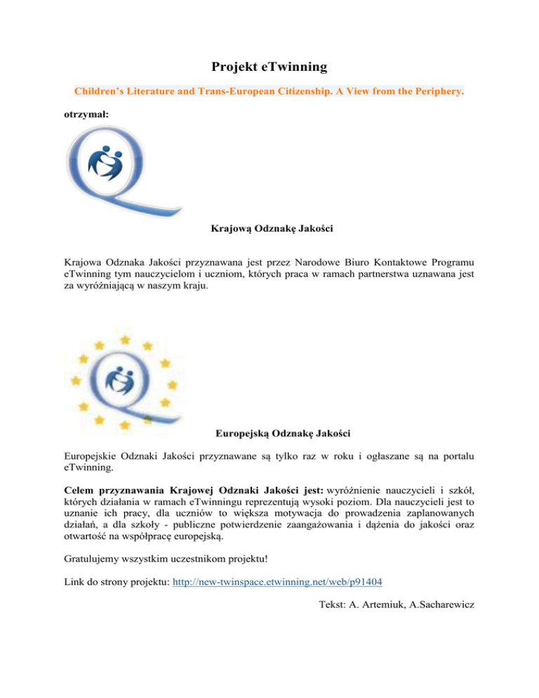 Projekt eTwinning Children’s Literature and Trans-European Citizenship. A View from the Periphery. otrzymał: Krajową Odznakę Jakości Krajowa Odznaka Jakości przyznawana jest przez Narodowe Biuro Kontaktowe Programu eTwinning tym nauczycielom i uczniom, których praca w ramach partnerstwa uznawana jest za wyróżniającą w naszym kraju. Europejską Odznakę Jakości Europejskie Odznaki Jakości przyznawane są tylko raz w roku i ogłaszane są na portalu eTwinning. Celem przyznawania Krajowej Odznaki Jakości jest: wyróżnienie nauczycieli i szkół, których działania w ramach eTwinningu reprezentują wysoki poziom. Dla nauczycieli jest to uznanie ich pracy, dla uczniów to większa motywacja do prowadzenia zaplanowanych działań, a dla szkoły - publiczne potwierdzenie zaangażowania i dążenia do jakości oraz otwartość na współpracę europejską. Gratulujemy wszystkim uczestnikom projektu! Link do strony projektu: http://new-twinspace.etwinning.net/web/p91404 Tekst: A. Artemiuk, A.Sacharewicz