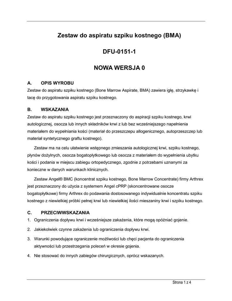 Zestaw do aspiratu szpiku kostnego (BMA) DFU-0151-1 NOWA WERSJA 0 A. OPIS WYROBU Zestaw do aspiratu szpiku kostnego (Bone Marrow Aspirate, BMA) zawiera igłę, strzykawkę i tacę do przygotowania aspiratu szpiku kostnego. B. WSKAZANIA Zestaw do aspiratu szpiku kostnego jest przeznaczony do aspiracji szpiku kostnego, krwi autologicznej, osocza lub innych składników krwi z lub bez wcześniejszego napełnienia materiałem do wypełniania kości (materiał do przeszczepu allogenicznego, autoprzeszczep lub materiał syntetycznego graftu kostnego). Zestaw ma na celu ułatwienie wstępnego zmieszania autologicznej krwi, szpiku kostnego, płynów dożylnych, osocza bogatopłytkowego lub osocza z materiałem do wypełnienia ubytku kości i podania w miejscu zabiegu ortopedycznego, zgodnie z potrzebami uznanymi za konieczne w danych warunkach klinicznych. Zestaw Angel® BMC (koncentrat szpiku kostnego, Bone Marrow Concentrate) firmy Arthrex jest przeznaczony do użycia z systemem Angel cPRP (skoncentrowane osocze bogatopłytkowe) firmy Arthrex do podawania dostosowanego indywidualnie koncentratu szpiku kostnego z niewielkiej próbki pełnej krwi lub niewielkiej ilości mieszaniny krwi i szpiku kostnego. C. PRZECIWWSKAZANIA 1. Ograniczenia dopływu krwi i wcześniejsze zakażenia, które mogą opóźniać gojenie. 2. Jakiekolwiek czynne zakażenia lub ograniczenia dopływu krwi. 3. Warunki powodujące ograniczenie możliwości lub chęci pacjenta do ograniczenia aktywności lub przestrzegania poleceń w okresie gojenia. 4. Nie stosować do innych zabiegów chirurgicznych, oprócz wskazanych. Strona 1 z 4 D. DZIAŁANIA NIEPOŻĄDANE 1. Zakażenia zarówno głębokie, jak i powierzchowne. 2. Reakcje na ciała obce. 3. Krwiak. E. OSTRZEŻENIA 1. Nie sterylizować wyrobu ponownie. 2. Nie używać ponownie tego wyrobu. 3. Nieprzestrzeganie podanych poniżej poleceń dotyczących korzystania z tego wyrobu może spowodować usterkę wyrobu, nienadawanie się wyrobu do zamierzonego użycia lub niepowodzenie zabiegu. 4. Przedoperacyjne i operacyjne procedury, w tym wiedza obejmująca metody chirurgiczne oraz właściwy wybór i umieszczenie wyrobu mają istotne znaczenie dla pomyślnego wykorzystania tego wyrobu. 5. Nigdy nie używać ponownie wyrobu oznaczonego jako wyrób do jednorazowego użytku. Ponowne użycie może stanowić zagrożenie dla zdrowia i (lub) bezpieczeństwa pacjenta, które może obejmować m.in. zakażenie krzyżowe, rozpad na fragmenty niemożliwe do odzyskania, pogorszenie sprawności mechanicznej z powodu zużycia, brak funkcji, brak gwarancji prawidłowego czyszczenia lub sterylizacji wyrobu. 6. Nieprzestrzeganie podanych poniżej poleceń dotyczących korzystania z tego wyrobu może spowodować usterkę wyrobu, nienadawanie się wyrobu do zamierzonego użycia lub niepowodzenie zabiegu. F. OPAKOWANIE I OZNAKOWANIE 1. Wyroby firmy Arthrex powinny być przyjmowane tylko w przypadku, gdy fabryczne opakowanie i etykieta są nienaruszone. 2. Jeśli opakowanie zostało otwarte lub jest naruszone, prosimy o skontaktowanie się z Działem Obsługi Klienta. G. STERYLIZACJA Niniejszy wyrób jest dostarczany w stanie sterylnym. Metodę sterylizacji podano na etykiecie opakowania. Strona 2 z 4 Określone instrumentarium firmy Arthrex, które może być używane podczas tego zabiegu, jest dostarczane w stanie niesterylnym i przed każdym użyciem musi być poddane odpowiedniemu czyszczeniu i sterylizacji. Należy zapoznać się z treścią DFU-0023 i normy ANSI/AAMI ST79, „Przewodnik dotyczący sterylizacji parą wodną i zapewnienia sterylności w zakładach opieki zdrowotnej”. H. SPECYFIKACJA MATERIAŁOWA Skład materiałowy podano na etykiecie opakowania. Igła: Stal chirurgiczna wysokiej jakości. Strzykawka: Polipropylen z poliizoprenową plombą. Taca do przygotowania: Polipropylen. I. WARUNKI PRZECHOWYWANIA Ten wyrób musi być przechowywany w oryginalnym nieotwieranym opakowaniu, z dala od wilgoci i nie należy go używać po upływie terminu ważności. J. INFORMACJE Zaleca się, aby przed rozpoczęciem jakiegokolwiek zabiegu chirurdzy zapoznali się z określoną metodą chirurgiczną wymaganą w przypadku stosowania danego wyrobu. Firma Arthrex zapewnia szczegółowe informacje o metodach chirurgicznych w postaci drukowanej, filmów i w formacie elektronicznym. Ponadto na stronie firmy Arthrex zamieszczono szczegółowe informacje oraz demonstracje metod chirurgicznych. Alternatywnie można skontaktować się z lokalnym przedstawicielem firmy Arthrex w celu przeprowadzenia demonstracji na miejscu. K. WSKAZÓWKI DOTYCZĄCE STOSOWANIA Zachęcamy użytkowników tego wyrobu do skontaktowania się z lokalnymi przedstawicielami firmy Arthrex, jeżeli uważają, że wymagają informacji na temat bardziej wszechstronnej procedury aspiracji. 1. Podstawowa procedura aspiracji a. Zlokalizować i przygotować miejsce wprowadzenia szpiku kostnego. b. Wprowadzić igłę do aspiracji. c. Podłączyć złącze typu męskiego strzykawki do złącza typu żeńskiego uchwytu igły do aspiracji. Strona 3 z 4 d. Zaaspirować. e. Przenieść ze strzykawki według potrzeb. Strona 4 z 4