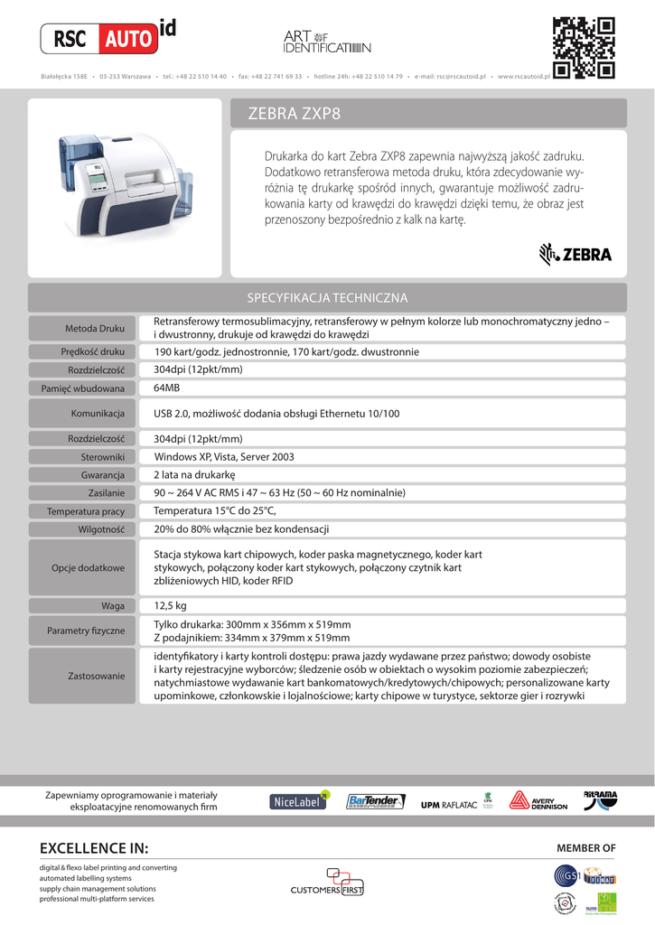 Białołęcka 158E • 03-253 Warszawa • tel.: +48 22 510 14 40 • fax: +48 22 741 69 33 • hotline 24h: +48 22 510 14 79 • e-mail: [email protected] • www.rscautoid.pl ZEBRA ZXP8 Drukarka do kart Zebra ZXP8 zapewnia najwyższą jakość zadruku. Dodatkowo retransferowa metoda druku, która zdecydowanie wyróżnia tę drukarkę spośród innych, gwarantuje możliwość zadrukowania karty od krawędzi do krawędzi dzięki temu, że obraz jest przenoszony bezpośrednio z kalk na kartę. SPECYFIKACJA TECHNICZNA Metoda Druku Prędkość druku Rozdzielczość Pamięć wbudowana Komunikacja Rozdzielczość Retransferowy termosublimacyjny, retransferowy w pełnym kolorze lub monochromatyczny jedno – i dwustronny, drukuje od krawędzi do krawędzi 190 kart/godz. jednostronnie, 170 kart/godz. dwustronnie 304dpi (12pkt/mm) 64MB USB 2.0, możliwość dodania obsługi Ethernetu 10/100 304dpi (12pkt/mm) Sterowniki Windows XP, Vista, Server 2003 Gwarancja 2 lata na drukarkę Zasilanie Temperatura pracy Wilgotność Opcje dodatkowe Waga Parametry fizyczne Zastosowanie 90 ~ 264 V AC RMS i 47 ~ 63 Hz (50 ~ 60 Hz nominalnie) Temperatura 15°C do 25°C, 20% do 80% włącznie bez kondensacji Stacja stykowa kart chipowych, koder paska magnetycznego, koder kart stykowych, połączony koder kart stykowych, połączony czytnik kart zbliżeniowych HID, koder RFID 12,5 kg Tylko drukarka: 300mm x 356mm x 519mm Z podajnikiem: 334mm x 379mm x 519mm identyfikatory i karty kontroli dostępu: prawa jazdy wydawane przez państwo; dowody osobiste i karty rejestracyjne wyborców; śledzenie osób w obiektach o wysokim poziomie zabezpieczeń; natychmiastowe wydawanie kart bankomatowych/kredytowych/chipowych; personalizowane karty upominkowe, członkowskie i lojalnościowe; karty chipowe w turystyce, sektorze gier i rozrywki Zapewniamy oprogramowanie i materiały eksploatacyjne renomowanych firm EXCELLENCE IN: digital & flexo label printing and converting automated labelling systems supply chain management solutions professional multi-platform services MEMBER OF