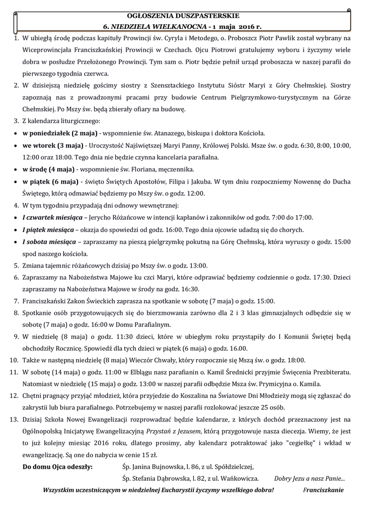 OGŁOSZENIA DUSZPASTERSKIE 6. NIEDZIELA WIELKANOCNA - 1 maja 2016 r. 1. W ubiegłą środę podczas kapituły Prowincji św. Cyryla i Metodego, o. Proboszcz Piotr Pawlik został wybrany na Wiceprowincjała Franciszkańskiej Prowincji w Czechach. Ojcu Piotrowi gratulujemy wyboru i życzymy wiele dobra w posłudze Przełożonego Prowincji. Tym sam o. Piotr będzie pełnił urząd proboszcza w naszej parafii do pierwszego tygodnia czerwca. 2. W dzisiejszą niedzielę gościmy siostry z Szensztackiego Instytutu Sióstr Maryi z Góry Chełmskiej. Siostry zapoznają nas z prowadzonymi pracami przy budowie Centrum Pielgrzymkowo-turystycznym na Górze Chełmskiej. Po Mszy św. będą zbierały ofiary na budowę. 3. Z kalendarza liturgicznego: w poniedziałek (2 maja) - wspomnienie św. Atanazego, biskupa i doktora Kościoła. we wtorek (3 maja) - Uroczystość Najświętszej Maryi Panny, Królowej Polski. Msze św. o godz. 6:30, 8:00, 10:00, 12:00 oraz 18:00. Tego dnia nie będzie czynna kancelaria parafialna. w środę (4 maja) - wspomnienie św. Floriana, męczennika. w piątek (6 maja) - święto Świętych Apostołów, Filipa i Jakuba. W tym dniu rozpoczniemy Nowennę do Ducha Świętego, którą odmawiać będziemy po Mszy św. o godz. 12:00. 4. W tym tygodniu przypadają dni odnowy wewnętrznej: I czwartek miesiąca – Jerycho Różańcowe w intencji kapłanów i zakonników od godz. 7:00 do 17:00. I piątek miesiąca – okazja do spowiedzi od godz. 16:00. Tego dnia ojcowie udadzą się do chorych. I sobota miesiąca – zapraszamy na pieszą pielgrzymkę pokutną na Górę Chełmską, która wyruszy o godz. 15:00 spod naszego kościoła. 5. Zmiana tajemnic różańcowych dzisiaj po Mszy św. o godz. 13:00. 6. Zapraszamy na Nabożeństwa Majowe ku czci Maryi, które odprawiać będziemy codziennie o godz. 17:30. Dzieci zapraszamy na Nabożeństwa Majowe w środy na godz. 16:30. 7. Franciszkański Zakon Świeckich zaprasza na spotkanie w sobotę (7 maja) o godz. 15:00. 8. Spotkanie osób przygotowujących się do bierzmowania zarówno dla 2 i 3 klas gimnazjalnych odbędzie się w sobotę (7 maja) o godz. 16:00 w Domu Parafialnym. 9. W niedzielę (8 maja) o godz. 11:30 dzieci, które w ubiegłym roku przystąpiły do I Komunii Świętej będą obchodziły Rocznicę. Spowiedź dla tych dzieci w piątek (6 maja) o godz. 16.00. 10. Także w następną niedzielę (8 maja) Wieczór Chwały, który rozpocznie się Mszą św. o godz. 18:00. 11. W sobotę (14 maja) o godz. 11:00 w Elblągu nasz parafianin o. Kamil Średnicki przyjmie Święcenia Prezbiteratu. Natomiast w niedzielę (15 maja) o godz. 13:00 w naszej parafii odbędzie Msza św. Prymicyjna o. Kamila. 12. Chętni pragnący przyjąć młodzież, która przyjedzie do Koszalina na Światowe Dni Młodzieży mogą się zgłaszać do zakrystii lub biura parafialnego. Potrzebujemy w naszej parafii rozlokować jeszcze 25 osób. 13. Dzisiaj Szkoła Nowej Ewangelizacji rozprowadzać będzie kalendarze, z których dochód przeznaczony jest na Ogólnopolską Inicjatywę Ewangelizacyjną Przystań z Jezusem, którą przygotowuje nasza diecezja. Wiemy, że jest to już kolejny miesiąc 2016 roku, dlatego prosimy, aby kalendarz potraktować jako "cegiełkę" i wkład w ewangelizację. Są one do nabycia w cenie 15 zł. Do domu Ojca odeszły: Śp. Janina Bujnowska, l. 86, z ul. Spółdzielczej, Śp. Stefania Dąbrowska, l. 82, z ul. Wańkowicza. Wszystkim uczestniczącym w niedzielnej Eucharystii życzymy wszelkiego dobra! Dobry Jezu a nasz Panie... Franciszkanie
