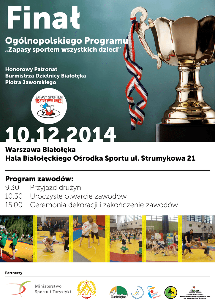 Finał Honorowy Patronat Burmistrza Dzielnicy Białołęka Piotra Jaworskiego 10.12.2014 Warszawa Białołęka Hala Białołęckiego Ośrodka Sportu ul. Strumykowa 21 Program zawodów: 9.30 Przyjazd drużyn 10.30 Uroczyste otwarcie zawodów 15.00 Ceremonia dekoracji i zakończenie zawodów Partnerzy