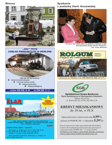 Wiosna Spotkanie z pos³ank¹ Ziemi Kociewskiej Foto Janusz Rokiciñski ADC PPUH ZAK£AD PRODUKCYJNY W DEMLINIE 28 maja w kinie SEWA odby³o siê spotkanie z pos³ank¹ na Sejm Rzeczypospolitej Polskiej Daniel¹ Chrapiewicz. Foto Janusz Rokiciñski oferuje do sprzedaży: n drewno konstrukcyjne n trarcicę mokrą i suchą n deskę boazeryjną n deskę podłogową tel/fax: 058 588 16 45 tel 058 588 17 17 Spó³dzielcza Grupa Bankowa Bank Spó³dzielczy w Starogardzie Gdañskim ZPHT ELAR Arkadiusz Marsza³ek UWAGA! korzystne ceny materia³ów budowlanych Oddzia³ Skarszewy ul. Kociuszki 32, tel./fax 058 588 24 20 KREDYT MIESZKANIOWY do 30 lat, w PLN Oprocentowanie w pierwszym roku 4,99%, MATERIA£Y BUDOWLANE opa³, pasze, nawozy sztuczne (ceny fabryczne) rodki ochrony rolin narzêdzia i inne towary do prod. rolnej tani transport towarowy KORZYSTNE CENY I RABATY ¬ Skarszewy, ul. Drogowców 18, tel. (058) 588 28 96, tel./fax (058) 588 22 40, 588 23 90, www.elar.pl ¬ Oddzia³ w Liniewie, tel./fax (058) 687 80 10 ¬ Sklep metalowo-budowlany, Skarszewy, pl. Hallera 16, tel./fax (058) 588 29 85 4)6; póniej od WIBOR 3M + 1 (aktualnie 5,29%) Rzeczywista roczna stopa oprocentowania dla kredytu na okres 30 lat sp³acanego miesiêcznie przy prowizji 1% i oprocentowaniu WIBOR 3M + 1,5 wynosi 6,06% Przyk³adowe cele: budowa, zakup dzia³ki, budynku, mieszkania, remont, sp³ata innego kredytu mieszkaniowego, itp.