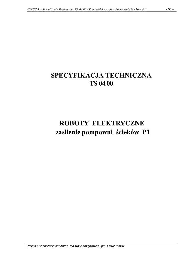 CZĘŚĆ 3 - Specyfikacje Techniczne- TS. 04.00 - Roboty elektryczne - Pompownia ścieków P1 SPECYFIKACJA TECHNICZNA TS 04.00 ROBOTY ELEKTRYCZNE zasilenie pompowni ścieków P1 Projekt : Kanalizacja sanitarna dla wsi Naczęsławice gm. Pawłowiczki - 53 - CZĘŚĆ 3 - Specyfikacje Techniczne- TS. 04.00 - Roboty elektryczne - Pompownia ścieków P1 1. WSTĘP 1.1 Przedmiot specyfikacji technicznej - 54 - Przedmiotem niniejszej specyfikacji technicznej są wymagania dotyczące wykonania i odbioru robót elektrycznych związanych z wykonaniem zasilania elektroenergetycznego przepompowni ścieków sanitarnych PN-1 w Naczęsławicach gm. Pawłowiczki. 1.2 Zakres stosowania specyfikacji technicznej Specyfikacja techniczna stanowi dokument przetargowy i kontraktowy przy zlecaniu i realizacji robót wymienionych w punkcie 1.1. 1.3 Zakres robót objętych specyfikacją techniczną Ustalenia zawarte w niniejszej specyfikacji dotyczą zasad prowadzenia robót związanych z wykonaniem kablowych linii zasilających oraz instalacji elektrycznych niezbędnych dla wykonania w pełni funkcjonalnalnego obiektu. W zakres tych robót wchodzą : linie kablowe niskiego napięcia, linie kablowe sterownicze i sygnalizacyjne, szafka sterownicza przepompowni, instalacje siły i sterowania zasilające napędy technologiczne, 1.4 Określenia podstawowe Elektroenergetyczna linia kablowa - kabel wielożyłowy lub wiązka kabli jednożyłowych w układzie wielofazowym (ewentualnie kilka kabli jedno- lub wielożyłowych połączonych równolegle), wraz z osprzętem, ułożone na trasie od punktu zasilającego do odbiornika służąca do przesyłania energii elektrycznej. Trasa kabla - Pas terenu lub przestrzeni, w którym ułożone są jedna lub więcej linii kablowych. Napięcie znamionowe linii – napięcie międzyprzewodowe w przypadku prądu przemiennego, napięcie międzybiegunowe w przypadku prądu stałego, na które została zbudowana linia kablowa. Osprzęt elektroenergetycznej linii kablowej – zestaw elementów służących do łączenia, zakańczania lub rozgałęziania linii kablowej. Skrzyżowanie – miejsce na trasie linii kablowej, w którym rzut poziomy linii kablowej przecina rzut poziomy innej linii kablowej lub innego urządzenia uzbrojenia terenu (rurociągu, gazociągu, drogi, toru kolejowego itp.). Zbliżenie – miejsce na trasie linii kablowej, w którym linia ta przebiega wzdłuż trasy innego urządzenia uzbrojenia terenu. Nadmierne zbliżenie – miejsce, w którym odległość trasy linii kablowej od przebiegających w pobliżu urządzeń jest mniejsza niż dopuszczalna odnośnymi przepisami. Odległość skrzyżowania - odległość pomiędzy krzyżującymi się urządzeniami mierzona w rzucie pionowym urządzeń od dolnej krawędzi urządzenia położonego wyżej do górnej krawędzi urządzenia położonego niżej. Opaska oznaczeniowa kabla – taśma z tworzywa sztucznego termoutwardzalnego z naniesionymi w sposób trwały (np. wytłoczonymi) danymi identyfikującymi linię kablową: trasa linii kablowej opisana punktem początkowym i końcowym, typ kabla, napięcie znamionowe linii kablowej, właściciel lub jednostka prowadząca eksploatację linii, rok budowy linii kablowej. Oznacznik kablowy – słupek betonowy z wytłoczoną literą „K” (kabel) lub „M” (mufa) służący do oznakowania trasy kabla ułożonego w ziemi i lokalizacji muf kablowych na linii kablowej. Osłona kabla – Konstrukcja przeznaczona do ochrony kabla przed uszkodzeniami mechanicznymi, chemicznymi i działaniem łuku elektrycznego. Przegroda – osłona ułożona wzdłuż kabla w celu oddzielenia go od sąsiedniego kabla lub innego urządzenia. Przepust – budowla na skrzyżowaniu z urządzeniami uzbrojenia terenu służąca do przenoszenia obciążeń zewnętrznych i do zabezpieczania kabli przy przejściach pod przeszkodą terenową. Przecisk (przewiert) - przepust wykonany metodą bezodkrywkową z wykorzystaniem specjalistycznego sprzętu. Projekt : Kanalizacja sanitarna dla wsi Naczęsławice gm. Pawłowiczki CZĘŚĆ 3 - Specyfikacje Techniczne- TS. 04.00 - Roboty elektryczne - Pompownia ścieków P1 - 55 - Szafka sterownicza – część składająca się z urządzeń rozdzielczych i aparatury pomiarowej przystosowanych do tego samego napięcia znamionowego oraz ustawionych w tych samych warunkach pracy, wraz z urządzeniami pomocniczymi. Zabezpieczenie nadmiarowo-prądowe – zabezpieczenie działające pod wpływem prądu przekraczającego określoną wartość przez określony przeciąg czasu. Zabezpieczenie przeciążeniowe – zabezpieczenie nadmiarowo-prądowe , które ma na celu ochronę zabezpieczonego przewodu od przekroczenia dopuszczalnego przyrostu temperatury, wywołanego przepływem prądu. Zabezpieczenie zwarciowe – zabezpieczenie nadmiarowo-prądowe, które ma na celu ochronę zabezpieczanego przewodu od niepożądanych następstw wywołanych przepływem prądu zwarciowego. Obwód odbiorczy – układ elektryczny składający się z zabezpieczenia nadmiarowo-prądowego umieszczonego na początku układu oraz linii i przyłączonego do niej odbiornika wyposażonego lub nie w zabezpieczenie nadmiarowo-pradowe. Uziom – przedmiot lub zespół przedmiotów umieszczonych w gruncie, tworzący elektryczne połączenie przewodzące z gruntem. Przewód ochronny (PE) –przewód lub żyła przewodu wymagany przez określone środki ochrony przeciwporażeniowej przeznaczony do elektrycznego połączenia następujących części: przewodzących dostępnych, przewodzących obcych, głównej szyny uziemiającej, uziomu, uziemionego punktu neutralnego źródła zasilania. Połączenie wyrównawcze – elektryczne połączenie części przewodzących dostępnych lub/i części przewodzących obcych w celu uzyskania wyrównania potencjałów. Obwód – zespół elementów instalacji elektrycznej wspólnie zasilanych i chronionych przed przetężeniami wspólnym zabezpieczeniem. Oprzewodowan