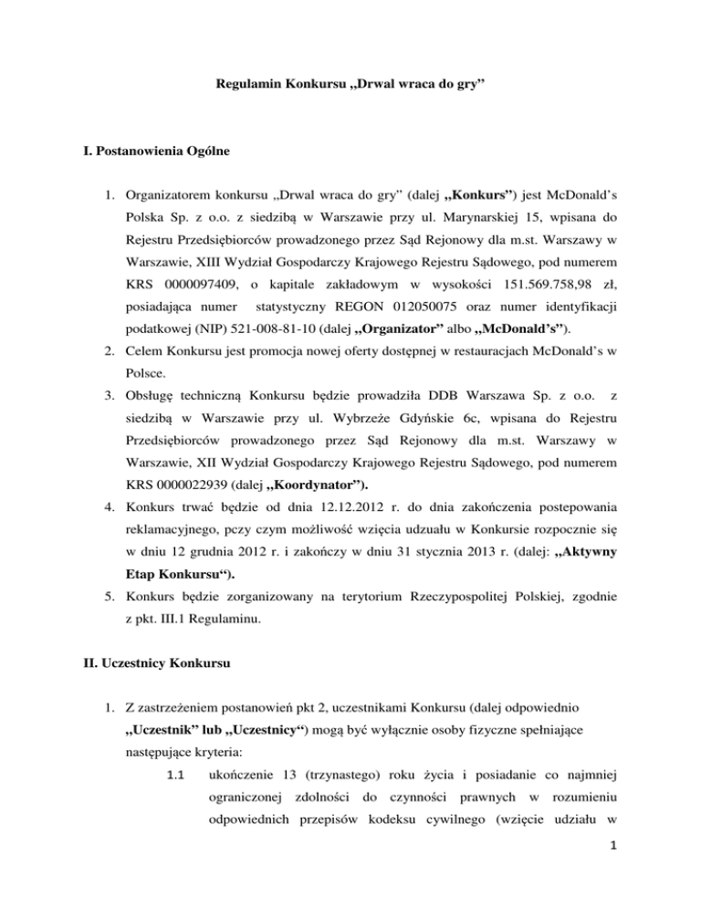 Regulamin Konkursu „Drwal wraca do gry” I. Postanowienia Ogólne 1. Organizatorem konkursu „Drwal wraca do gry” (dalej „Konkurs”) jest McDonald’s Polska Sp. z o.o. z siedzibą w Warszawie przy ul. Marynarskiej 15, wpisana do Rejestru Przedsiębiorców prowadzonego przez Sąd Rejonowy dla m.st. Warszawy w Warszawie, XIII Wydział Gospodarczy Krajowego Rejestru Sądowego, pod numerem KRS 0000097409, o kapitale zakładowym w wysokości 151.569.758,98 zł, posiadająca numer statystyczny REGON 012050075 oraz numer identyfikacji podatkowej (NIP) 521-008-81-10 (dalej „Organizator” albo „McDonald’s”). 2. Celem Konkursu jest promocja nowej oferty dostępnej w restauracjach McDonald’s w Polsce. 3. Obsługę techniczną Konkursu będzie prowadziła DDB Warszawa Sp. z o.o. z siedzibą w Warszawie przy ul. Wybrzeże Gdyńskie 6c, wpisana do Rejestru Przedsiębiorców prowadzonego przez Sąd Rejonowy dla m.st. Warszawy w Warszawie, XII Wydział Gospodarczy Krajowego Rejestru Sądowego, pod numerem KRS 0000022939 (dalej „Koordynator”). 4. Konkurs trwać będzie od dnia 12.12.2012 r. do dnia zakończenia postepowania reklamacyjnego, pczy czym możliwość wzięcia udzuału w Konkursie rozpocznie się w dniu 12 grudnia 2012 r. i zakończy w dniu 31 stycznia 2013 r. (dalej: „Aktywny Etap Konkursu“). 5. Konkurs będzie zorganizowany na terytorium Rzeczypospolitej Polskiej, zgodnie z pkt. III.1 Regulaminu. II. Uczestnicy Konkursu 1. Z zastrzeżeniem postanowień pkt 2, uczestnikami Konkursu (dalej odpowiednio „Uczestnik” lub „Uczestnicy“) mogą być wyłącznie osoby fizyczne spełniające następujące kryteria: 1.1 ukończenie 13 (trzynastego) roku życia i posiadanie co najmniej ograniczonej zdolności do czynności prawnych w rozumieniu odpowiednich przepisów kodeksu cywilnego (wzięcie udziału w 1 Konkursie przez osobę posiadającą ograniczoną zdolność do czynności prawnych wymaga zgody jej przedstawiciela ustawowego), 1.2 działanie w charakterze konsumenta w rozumieniu art. 221 kodeksu cywilnego, 1.3 miejsce zamieszkania na terytorium Rzeczpospolitej Polskiej. 2. W Konkursie nie mogą brać udziału pracownicy i członkowie rodzin pracowników Organizatora i Koordynatora. 3. Przez członków rodziny, o których mowa w pkt. 2 rozumie się: wstępnych, zstępnych, rodzeństwo, małżonków, rodziców małżonków i osoby pozostające w stosunku przysposobienia. III. Zasady Konkursu 1. Konkurs prowadzony będzie za pośrednictwem strony internetowej o adresie www.drwalwracadogry.pl, do której w czasie trwania Konkursu dostęp mieć będą zarówno Uczestnicy, jak i osoby trzecie – Internauci (dalej „Strona Konkursowa”). oraz od dnia 07 stycznia 2013 r., za pośrednictwem mobilnej aplikacji konkursowej do pobrania z Apple AppStore lub Google Play; 2. Warunkiem wzięcia udziału w Konkursie przez każdego Uczestnika jest: 2.1. rejestracja do Konkursu (dalej „Rejestracja”). Rejestracji można będzie dokonać na dwa sposoby: (i) poprzez wypełnienie formularza zgłoszenia, dostępnego na Stronie Konkursowej po kliknięciu w przycisk „Zarejestruj się”, obejmującego następujące dane: (i) nazwę (nick) Uczestnika; 2 (ii) adres poczty elektronicznej (e-mail) służącej do kontaktu z Organizatorem i Koordynatorem; (iii) hasło Uczestnika; oraz (ii) za pośrednictwem portalu Facebook - w przypadku Uczestników posiadających profil na portalu Facebook istnieje możliwość pobrania z portalu danych niezbędnych do Rejestracji, poprzez kliknięcie w umieszczony w formularzu rejestracyjnym przycisk „Pobierz dane z Facebook”. Zakres pobranych danych będzie obejmował: imię i nazwisko, ID Facebook Użytkownika, adres e-mail. (iii) Rejestracja wymaga ponadto odznaczenia odpowiedniego pola formularza rejestracyjnego – potwierdzenie, że biorąc udział w Konkursie Uczestnik zapoznał się z niniejszym regulaminem „Regulamin”) (dalej udostępnionym na Stronie Konkursowej, akceptując wszystkie jego postanowienia oraz potwierdza, że spełnia wszystkie warunki, o których mowa w pkt. II, a w przypadku osób o ograniczonej zdolności do czynności prawnych - uzyskała ona zgodę swojego przedstawiciela ustawowego na wzięcie udziału w Konkursie; 2.2. wykonanie zadania konkursowego polegającego na zdobyciu jak największej ilości punktów w rankingu ogólnym (dalej „Ranking Ogólny”), wybierając jeden spośród udostępnionych zdobywania punktów lub łącząc je dowolnie sposobów (dalej: „Zadanie Konkursowe“). 3. Punkty do Rankigu Ogólnego można zdobywać w nastepujący sposób: 3.1. poprzez zagranie w grę dostępną na Stronie Konkursowej oraz za pośrednictwem mobilnej aplikacji, o której mowa w pkt. III.1 (dalej „Gra”) , akceptując poniższe założenia: 3 3.1.1. Gra polega na tym, aby w jak najkrótszym czasie zbudowacć drogę umożliwiającą animowanej postaci (Drwalowi) dotarcie do kanapki. W tym celu należy wykorzystac dostępne w Grze interaktywne elementy (dalej: „Elementy“) o określonej funkcji, z których każdy sluży do pokonywania przeszkód opisanych w zakladce „Zasady“ dostępnej na Stronie Konkursowej oraz w aplikacji mobilnej, o której mowa w pkt. III.1. 3.1.2. Gra dostępna na Stronie Konkursowej składa się z 51 poziomów a w aplikacji mobilnej z 52 poziomów. Kolejność poziomów jest z góry ustalona i zastrzeżeniem pkt. 3.1.8, Uczestnik nie ma prawa wyboru poziomu Gry, który będzie pokonywał. 3.1.3. Poziom Gry uznaje się za zaliczony, jeśli Uczestnik posługując się prawidłowymi Elementami umożliwił Drwalowi dotarcie do kanapki. Ułożenie błędnego Elemetu oznacza nie zaliczenie poziomu; 3.1.4. Punkty do Rankingu Ogólnego przyznawane są w zależności od czasu w jakim Drwal pokonał drogę do kanapki. W każdym poziomie Uczestnik może zdobyć maksymalnie 10 000 punktów, jednak wraz z upływającym czasem liczba punktów możliwych do zdobycia zmniejsza się, tj. p