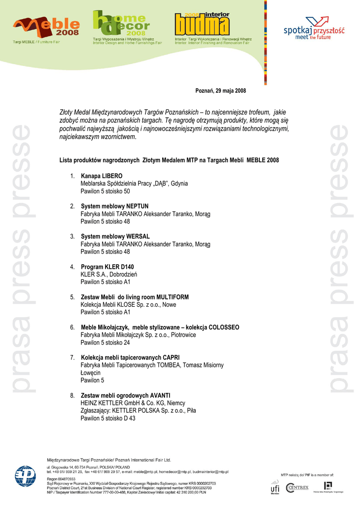 Poznań, 29 maja 2008 Złoty Medal Międzynarodowych Targów Poznańskich – to najcenniejsze trofeum, jakie zdobyć można na poznańskich targach. Tę nagrodę otrzymują produkty, które mogą się pochwalić najwyższą jakością i najnowocześniejszymi rozwiązaniami technologicznymi, najciekawszym wzornictwem. Lista produktów nagrodzonych Złotym Medalem MTP na Targach Mebli MEBLE 2008 1. Kanapa LIBERO Meblarska Spółdzielnia Pracy „DĄB”, Gdynia Pawilon 5 stoisko 50 2. System meblowy NEPTUN Fabryka Mebli TARANKO Aleksander Taranko, Morąg Pawilon 5 stoisko 48 3. System meblowy WERSAL Fabryka Mebli TARANKO Aleksander Taranko, Morąg Pawilon 5 stoisko 48 4. Program KLER D140 KLER S.A., Dobrodzień Pawilon 5 stoisko A1 5. Zestaw Mebli do living room MULTIFORM Kolekcja Mebli KLOSE Sp. z o.o., Nowe Pawilon 5 stoisko A1 6. Meble Mikołajczyk, meble stylizowane – kolekcja COLOSSEO Fabryka Mebli Mikołajczyk Sp. z o.o., Piotrowice Pawilon 5 stoisko 24 7. Kolekcja mebli tapicerowanych CAPRI Fabryka Mebli Tapicerowanych TOMBEA, Tomasz Misiorny Łowęcin Pawilon 5 8. Zestaw mebli ogrodowych AVANTI HEINZ KETTLER GmbH & Co. KG, Niemcy Zgłaszający: KETTLER POLSKA Sp. z o.o., Piła Pawilon 5 stoisko D 43 9. Kolekcja SAWANNA MEBLIK s.c. Stanisław Gierszewski Andrzej Zabłotny, Chojnice Pawilon 9 stoisko 2 10. ARGENTO VERO Sp. z o.o. Lubliniec Pawilon 5 stoisko 39 11. Sypialnia SENSO PROFAP, Kraków Zgłaszający: U-NEX Sp. z o.o., Kraków Pawilon 5 stoisko 14 12. Zestaw mebli wypoczynkowych TUKAN NOTI, Tarnowo Podgórne Pawilon 5 stoisko 18 13. Gabinet Argo Przedsiębiorstwo Produkcji Mebli JAFRA, Karnice Pawilon 5/65 14. Gabinet Karen – B Przedsiębiorstwo Produkcji Mebli JAFRA, Karnice Pawilon 5/65 15. Kolekcja Mar-Jani Przedsiębiorstwo Produkcji Mebli JAFRA, Karnice Pawilon 5/65 16. Hotel Jafra Przedsiębiorstwo Produkcji Mebli JAFRA, Karnice Pawilon 5/65 Lista produktów nagrodzonych Złotym Medalem MTP na Targach Wyposażenia i Wystroju Wnętrz HOME DECOR 2008 1. Srebro użytkowe, kolekcja limitowana AZJATYCKI OOO PUKP AGAT , Ukraina Zgłaszający: WAIR Sp. z o.o., Opalenica Pawilon 3A stoisko 54 2. Dekoracja z tkaniny THOR tkanina o składzie 59% miedź DIAZ N.V. , Belgia Zgłaszający : FLOKATEX Izabela Kaczmarska i Jacek Kaczmarski Sp. j. Łódź Pawilon 3 stoisko 70 Przewodnicząca Sądu Konkursowego Prof.dr hab. Ewa Ratajczak