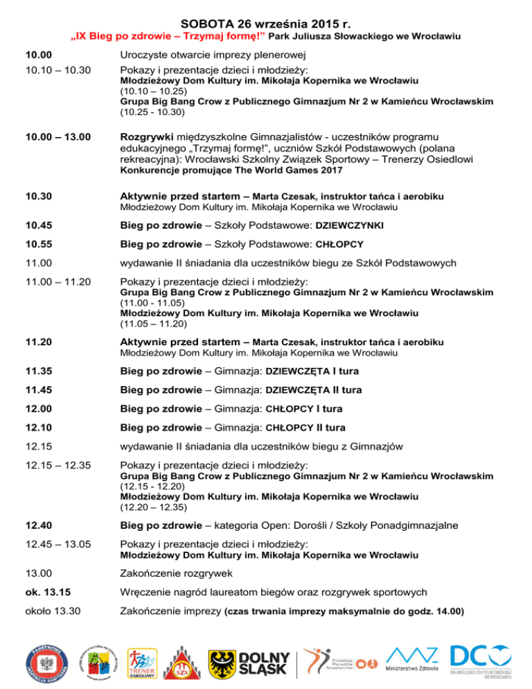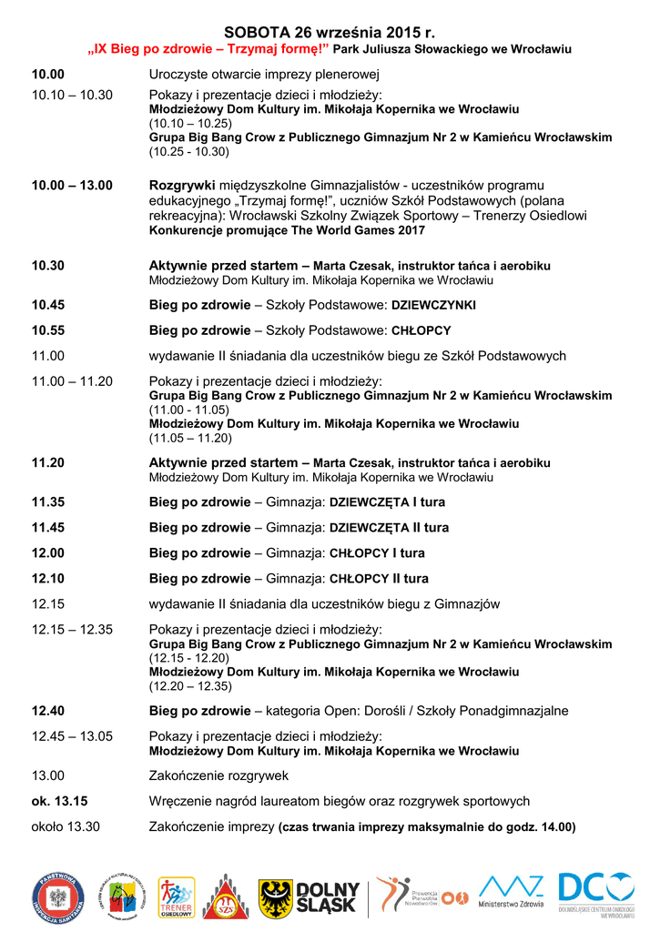 SOBOTA 26 września 2015 r. „IX Bieg po zdrowie – Trzymaj formę!” Park Juliusza Słowackiego we Wrocławiu 10.00 Uroczyste otwarcie imprezy plenerowej 10.10 – 10.30 Pokazy i prezentacje dzieci i młodzieży: Młodzieżowy Dom Kultury im. Mikołaja Kopernika we Wrocławiu (10.10 – 10.25) Grupa Big Bang Crow z Publicznego Gimnazjum Nr 2 w Kamieńcu Wrocławskim (10.25 - 10.30) 10.00 – 13.00 Rozgrywki międzyszkolne Gimnazjalistów - uczestników programu edukacyjnego „Trzymaj formę!”, uczniów Szkół Podstawowych (polana rekreacyjna): Wrocławski Szkolny Związek Sportowy – Trenerzy Osiedlowi Konkurencje promujące The World Games 2017 10.30 Aktywnie przed startem – Marta Czesak, instruktor tańca i aerobiku Młodzieżowy Dom Kultury im. Mikołaja Kopernika we Wrocławiu 10.45 Bieg po zdrowie – Szkoły Podstawowe: DZIEWCZYNKI 10.55 Bieg po zdrowie – Szkoły Podstawowe: CHŁOPCY 11.00 wydawanie II śniadania dla uczestników biegu ze Szkół Podstawowych 11.00 – 11.20 Pokazy i prezentacje dzieci i młodzieży: Grupa Big Bang Crow z Publicznego Gimnazjum Nr 2 w Kamieńcu Wrocławskim (11.00 - 11.05) Młodzieżowy Dom Kultury im. Mikołaja Kopernika we Wrocławiu (11.05 – 11.20) 11.20 Aktywnie przed startem – Marta Czesak, instruktor tańca i aerobiku Młodzieżowy Dom Kultury im. Mikołaja Kopernika we Wrocławiu 11.35 Bieg po zdrowie – Gimnazja: DZIEWCZĘTA I tura 11.45 Bieg po zdrowie – Gimnazja: DZIEWCZĘTA II tura 12.00 Bieg po zdrowie – Gimnazja: CHŁOPCY I tura 12.10 Bieg po zdrowie – Gimnazja: CHŁOPCY II tura 12.15 wydawanie II śniadania dla uczestników biegu z Gimnazjów 12.15 – 12.35 Pokazy i prezentacje dzieci i młodzieży: Grupa Big Bang Crow z Publicznego Gimnazjum Nr 2 w Kamieńcu Wrocławskim (12.15 - 12.20) Młodzieżowy Dom Kultury im. Mikołaja Kopernika we Wrocławiu (12.20 – 12.35) 12.40 Bieg po zdrowie – kategoria Open: Dorośli / Szkoły Ponadgimnazjalne 12.45 – 13.05 Pokazy i prezentacje dzieci i młodzieży: Młodzieżowy Dom Kultury im. Mikołaja Kopernika we Wrocławiu 13.00 Zakończenie rozgrywek ok. 13.15 Wręczenie nagród laureatom biegów oraz rozgrywek sportowych około 13.30 Zakończenie imprezy (czas trwania imprezy maksymalnie do godz. 14.00)