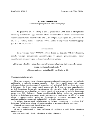 RAN0.6220.12.2013 Bojszowy, dnia 08.04.2013 r. ZAWIADOMIENIE o wszczęciu postępowania administracyjnego. Na podstawie art. 73 ustawy z dnia 3 października 2008 roku o udostępnianiu informacji o środowisku i jego ochronie, udziale społeczeństwa w ochronie środowiska oraz ocenach oddziaływania na środowisko (Dz. U. Nr 199 poz. 1227 z późn. zm.), stosownie do art. 61 § 1 ustawy z dnia 14 czerwca 1960 r. Kodeks Postępowania Administracyjnego (Dz. U. z 2013 r. poz. 267 ) zawiadamiam, że na wniosek Firmy WORKOM Paweł Baron ul. Bociania 7,43-220 Bojszowy, zostało wszczęte postępowanie administracyjne w sprawie przeprowadzenia oceny oddziaływania przedsięwzięcia na środowisko dla inwestycji pn.: „Zbieranie odpadów - skup złomu metali kolorowych, złomu stalowego, żeliwa oraz skupu zużytych akumulatorów ” w Bojszowach przy ul. Jedlińskiej na działce nr 44. Charakterystyka inwestycji: Planowane przedsięwzięcie polega na zorganizowaniu punktu skupu złomu – prowadzenie działalności w zakresie zbierania odpadów ( skup złomu metali kolorowych, złomu stalowego, żeliwa oraz skup zużytych akumulatorów ) w ilościach do 50 ton złomu stalowego i żeliwnego, do 3 ton złomu metali kolorowych, do 2 ton zużytych akumulatorów. (w skali 1 miesiąca). Inwestycja charakteryzuje się niewielką skalą i mało znaczącym oddziaływaniem na środowisko. Inwestycje planuje się usytuować w budynku kompleksu garażowego RSP Bojszowy. Zakres przedsięwzięcia będzie obejmował wyposażenie istniejącego jednokondygnacyjnego obiektu garażowego o powierzchni ok. 420 m2 na skup złomu z pomieszczeniem socjalnym. Przedmiotowa inwestycja planowana jest w miejscowości Bojszowy przy ul. Jedlińskiej 89 , na działce o numerze 44. Na działce inwestycyjnej zlokalizowane są budynki gospodarczo – garażowe RSP Bojszowy. Działki są ogrodzone a dojazdy oraz place są utwardzone kostką betonową. Aktualnie tereny przyległe do działki stanowią: - od strony północnej - działka pola orne - od strony południowej – droga asfaltowa ul. Jedlińska a dalej luźna zabudowa mieszkaniowa - od strony zachodniej - działki mieszkalne w luźnej zabudowie 1 - od strony wschodniej – działki mieszkalne w luźnej zabudowie Właścicielem działki jest Rolnicza Spółdzielnia Produkcyjna w Bojszowach . Informuję więc o uprawnieniach wszystkich stron tego postępowania wynikających z art.10 Kpa do czynnego w nim udziału w każdym jego stadium. Zgodnie z art. 35 § 5 Kodeksu postępowania administracyjnego do terminów załatwienia sprawy nie wlicza się terminów przewidzianych w przepisach prawa dla dokonania określonych czynności, okresów zawieszenia postępowania oraz okresów opóźnień spowodowanych z winy strony albo z przyczyn niezależnych od organu. Zgodnie z art. 41 § 1 Kpa w toku postępowania strony oraz ich przedstawiciele i pełnomocnicy mają obowiązek zawiadomić organ administracji publicznej o każdej zmianie swojego adresu. Zgodnie z § 2 tego przepisu, w razie zaniedbania obowiązku określonego w § 1 doręczenie pisma pod dotychczasowym adresem ma skutek prawny. Ewentualne uwagi mogące mieć wpływ na postępowanie strony mogą składać na piśmie w Urzędzie Gminy Bojszowy ul. Gaikowa 35, 43-220 Bojszowy. Bliższe informacje na temat w/w inwestycji można uzyskać w Referacie Planowania Przestrzennego, Geodezji, Nieruchomości i Rolnictwa Urzędu Gminy Bojszowy pok. nr 6 (I piętro), telefon 032/218-93-66 wew. 109. Otrzymuje: 1. WORKOM Paweł Baron ul. Bociania 7 43-220 Bojszowy 2. Właściciele nieruchomości według akt sprawy 2