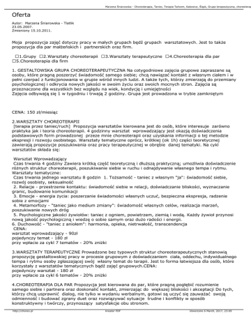 Marzena Śniarowska - Choreoterapia, Taniec, Terapia Tańcem, Katowice, Śląsk, Grupa terapeutyczna, choreoterap Oferta Autor: Marzena Śniarowska - Tlatlik 23.05.2007. Zmieniony 15.10.2011. Moja propozycja zajęć dotyczy pracy w małych grupach będź grupach warsztatowych. Jest to także propozycja dla par małżeńskich i partnerskich oraz firm. 1.Grupy 2.Warsztaty choreoterapii 3.Warsztaty terapeutyczne 4.Choreoterapia dla par 5.Choreoterapia dla firm 1. GESTALTOWSKA GRUPA CHOREOTERAPEUTYCZNA Na cotygodniowe zajęcia grupowe zapraszane są osoby, które pragną poszerzyć świadomość samego siebie; chcą nawiązać kontakt z własnym ciałem i w pełni czerpać z funkcjonowania w grupie wśród innych ludzi. A także tych, którzy zmierzają do przemiany psychologicznej i odkrycia nowych jakości w swoim życiu oraz swoich mocnych stron. Zajęcia są przeznaczone dla wszystkich bez względu na wiek, kondycję i umiejętności Zajęcia odbywają się 1 w tygodniu i trwają 2 godziny. Grupa jest prowadzona w trybie zamkniętym CENA: 150 zł/miesiąc 2.WARSZTATY CHOREOTERAPII [terapia przez taniec/ruch] Propozycja warsztatów kierowana jest do osób, które interesuje zarówno praktyka jak i teoria choreoterapii. 4 godzinny warsztat wprowadzający jest okazją doświadczenia podstawowych form prowadzonej przeze mnie choreoterapii oraz uzyskania informacji o tej metodzie ekspresji i rozwoju osobistego. Warsztaty tematyczne oprócz, krótkiej (ok 1h) części teoretycznej zawierają propozycje poszukiwania oraz pracy terapeutycznej w obrębie danej tematyki. Na cykl warsztatów składa się: Warsztat Wprowadzający Czas trwania 4 godziny Zawiera krótką część teoretyczną i dłuższą praktyczną; umożliwia doświadczenie różnych struktur choreoterapii, poszukiwanie siebie w ruchu i odnajdywanie własnego tempa i rytmu. Warsztaty tematyczne: Czas trwania jednego warsztatu 8 godzin 1. Tożsamość - taniec z własnym "ja": świadomość siebie, rozwój osobisty, seksualność 2. Relacje - przestrzenie kontaktu: świadomość siebie w relacji, doświadczanie bliskości, wyznaczanie granic, budowanie komunikacji 3. Emocje - energia życia: poszerzanie świadomości własnych uczuć, bezpieczna ekspresja, radzenie sobie z emocjami 4. Metamorfozy - "taniec jako medium zmiany": świadomość własnych celów, realizacja marzeń, poszukiwanie nowych dróg 5. Psychologiczne jakości żywiołów: taniec z ogniem, powietrzem, ziemią i wodą. Każdy żywioł przynosi nową jakość psychologiczną i wiedzę o sobie samym oraz dużo radości i energii. 6. Duchowość - "taniec z aniołem": harmonia, opieka, nietrwałość, transcendencja CENA: warsztat wprowadzający - 90zł pojedynczy temat - 180 zł przy wpłacie za cykl 7 tematów - 20% zniżki 3.WARSZTATY TERAPEUTYCZNE Prowadzone bez typowych struktur choreoterapeutycznych stanowią propozycję gestaltowskiej pracy w procesie grupowym z doświadczaniem ciała, oddechu, indywidualnego tempa i rytmu osoby zgłaszającej swój własny temat do terapii. Jest to forma łatwiejsza dla osób, które korzystały z warsztatów tematycznych bądź zajęć grupowych.CENA: pojedynczy warsztat - 180 zł przy wpłacie za cykl 6 tematów - 20% zniżki 4.CHOREOTERAPIA DLA PAR Propozycja jest kierowana do par, które pragną pogłębić rozumienie samego siebie i partnera oraz doskonalić kontakt, zmierzając do większej bliskości i akceptacji Do tych, którzy chcą usprawnić dialog, nie tylko w wydaniu werbalnym, gotowi są uczyć się zauważać swoją odmienność i budować zgrany duet oraz rozwiązywać sytuacje trudne i konflikty w sposób konstruktywny i twórczy, przynoszący satysfakcje obu stronom. http://choreo.pl Kreator PDF Utworzono 6 March, 2017, 23:09 Marzena Śniarowska - Choreoterapia, Taniec, Terapia Tańcem, Katowice, Śląsk, Grupa terapeutyczna, choreoterap 5.CHOREOTERAPIA DLA FIRM Jest to propozycja dla firm, które są zainteresowane treningami zespołów pracowniczych, to m.in.; -treningi integracyjne - treningi uwrażliwiające (pogłębiające rozumienie w grupie) - treningi "dialogu" (wspomagające komunikacje, poszerzając ją o tzw "body language") treningi radzenia sobie z konfliktami w zespole - treningi budowania udanego zespołu (nie przestając być sobą) - trening poszukiwania swoich mocnych stron (zasobów psychologicznych) -trening elastyczności (otwartości, potencjalności, kreatywności) http://choreo.pl Kreator PDF Utworzono 6 March, 2017, 23:09