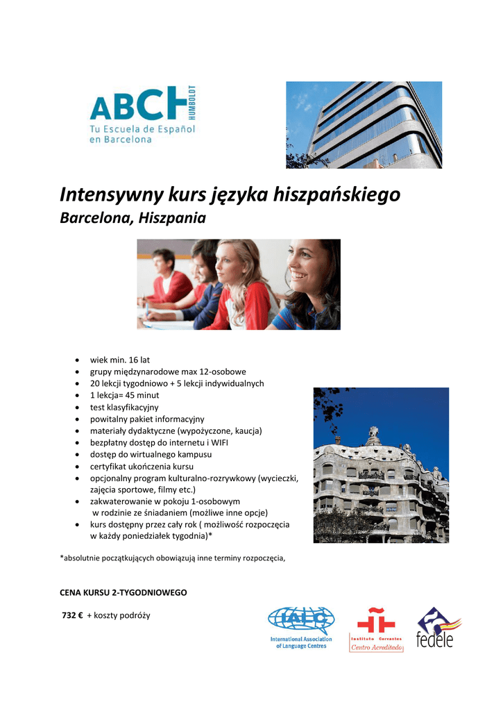 Intensywny kurs języka hiszpańskiego Barcelona, Hiszpania              wiek min. 16 lat grupy międzynarodowe max 12-osobowe 20 lekcji tygodniowo + 5 lekcji indywidualnych 1 lekcja= 45 minut test klasyfikacyjny powitalny pakiet informacyjny materiały dydaktyczne (wypożyczone, kaucja) bezpłatny dostęp do internetu i WIFI dostęp do wirtualnego kampusu certyfikat ukończenia kursu opcjonalny program kulturalno-rozrywkowy (wycieczki, zajęcia sportowe, filmy etc.) zakwaterowanie w pokoju 1-osobowym w rodzinie ze śniadaniem (możliwe inne opcje) kurs dostępny przez cały rok ( możliwość rozpoczęcia w każdy poniedziałek tygodnia)* *absolutnie początkujących obowiązują inne terminy rozpoczęcia, CENA KURSU 2-TYGODNIOWEGO 732 € + koszty podróży