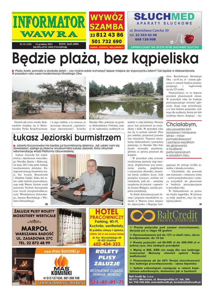 Nr 21 (218) 12 grudnia 2014 ISSN: 1643-2894 BEZPŁATNY DWUTYGODNIK Będzie plaża, bez kąpieliska Plaża, ławki, pomosty a dookoła zieleń – czy można sobie wymarzyć lepsze miejsce do wypoczynku latem? Tak będzie w Aleksandrowie. W przyszłym roku rusza modernizacja Morskiego Oka. stwa. Rewitalizacja Morskiego Oka – za 65 tys. zł – została zgłoszona w ramach budżetu partycypacyjnego i zagłosowały na nią 323 osoby. Najważniejsze, że to dopiero początek planowanych zmian. W przyszłym roku do budżetu partycypacyjnego zostanie zgłoszony drugi etap rewitalizacji, a w nim budowa pomostów. Jednego dla wędkarzy, którzy już dziś zarybiają akwen, drugiego – sięNiemal cały teren osiedla Aleksandrów znajduje się w Mazowieckim Parku Krajobrazowym i w jego otulinie, a to oznacza, że pozostaje obszarem „ograniczonego inwestowania”. Jeziorko Morskie Oko, położone na granicy Aleksandrowa i Falenicy, należy do najbardziej urokliwych za- Łukasz Jeziorski burmistrzem Jolanta Koczorowska nie będzie już burmistrzynią dzielnicy. Jak udało nam się dowiedzieć, zastąpi ją obecny wiceburmistrz Łukasz Jeziorski, który otrzymał rekomendację władz Platformy Obywatelskiej. Łukasz Jeziorski był współtwórcą i dyrektorem wawerskiego Ośrodka Sportu i Rekreacji, od maja 2013 roku pełni funkcję wiceburmistrza dzielnicy. Zastępcami nowego burmistrza mają być Leszek Baraniewski i Zdzisław Gójski. Kilka dni temu radni wybrali przewodniczącego rady Wawra, którym został ponownie Norbert Szczepański oraz trzech wiceprzewodniczących: Włodzimierza Zalewskiego, Janusza Barcińskiego i Wiesława Domańskiego. DG kątków w całej dzielnicy. Niestety przez lata pozostawał on zaniedbany i dziki. W przyszłym roku ma się to jednak zmienić. Plan jest ambitny: przywrócić jeziorku lata świetności. Najstarsi mieszkańcy Aleksandrowa z pewnością pamiętają, że Morskie Oko było kiedyś niezwykle popularne, głównie za sprawą przystani dla kajaków. – W przyszłym roku zostanie zrealizowany pierwszy etap inwestycji. Zaplanowane jest nawiezienie piachu, pogłębienie i oczyszczenie zbiornika, ustawienie ławek, stolików, koszy. Jeśli pieniędzy wystarczy, zrobimy też oświetlenie, jeśli nie – ustawimy urządzenia do ćwiczeń – zapowiada Joanna Waligóra, autorka projektu rewitalizacji. To dzięki determinacji pani Joanny i poparciu mieszkańców zyskamy w Wawrze nowe miejsce do odpoczynku i błogiego leni- Chciałabym, aby powstała tam kawiarnia i miniscena letnia – mówi pomysłodawczyni i zachęca wszystkich do głosowania w budżecie partycypacyjnym w przyszłym roku. gającego do samego środka jeziorka, z altanką na końcu. – Chciałabym, aby powstała tam kawiarnia i miniscena letnia – mówi pomysłodawczyni i zachęca wszystkich do głosowania w budżecie partycypacyjnym w przyszłym roku. W Aleksandrowie na pewno nie będzie kąpieliska. W jeziorze są wody opadowe, więc nie najlepszej jakości. AS Zapraszamy do współpracy mieszkańców. Nie zwracamy materiałów niezamawianych. Zastrzegamy sobie prawo do skracania i adiustowania nadesłanych materiałów oraz opatrywania ich własnym tytułem. Nie odpowiadamy za treść reklam i ogłoszeń. Wydawca: Wydawnictwo Prasowe Ostoja 2012 sp. z o.o. adres redakcji: 03-026 Warszawa, ul. Bohaterów 18a Druk: Edytor Sp. z o.o., Olsztyn telefon dla czytelników: 519 610 433, 22 614 58 28 telefon dla reklamodawców: 508 125 419, 22 614 58 03 e-mail: [email protected] Mój cel: dwie kładki, monitoring i powrót dzieci do wawerskich szkół Cezary Jurkiewicz przez najbliższe cztery lata będzie reprezentował Wawer w radzie Warszawy. Co zamierza tam dla nas wynegocjować? – Przez ostatnie cztery lata był Pan radnym dzielnicy, ostatnie wybory samorządowe przyniosły Panu mandat radnego Warszawy. Jakie korzyści będzie miał Wawer i jego mieszkańcy z Pana pracy? – W radzie Warszawy chcę szukać miejsca w przestrzeni do promowania naszej dzielnicy. Pracować tak, by nie dopuszczać do zatracania tożsamości i wyjątkowego charakteru Wawra. W ubiegłej kadencji nasz głos był w radzie miasta bardzo słabo słyszalny a potrzeby niezauważane. Wystarczy spojrzeć na wielkość kolejnych budżetów inwestycyjnych dzielnicy. Postaram się to zmienić. – Co konkretnie? – Teraz nie jestem już radnym dzielnicowym, tylko radnym miasta i w polu widzenia muszę mieć Warszawę jako całość. Zamierzam tak sprawować mandat, by moje działania służące Wawrowi służyły też całemu miastu. Konkrety? W Wawrze potrzebny jest system monitoringu wizyjnego obejmujący najbardziej problematyczne miejsca w całej dzielnicy. Osiedle Marysin Wawerski jest jednym z najniebezpieczniejszych w Wawrze, a nie ma tam żadnej kamery monitorującej, rzadkie są też patrole policyjne – to trzeba zmienić. Bezpieczeństwo to też bezpieczne drogi, dobrze oznakowane i oświetlone przejścia dla pieszych z sygnalizacją świetlną. Należy odbudować jak najszybciej dwie kładki dla pieszych, nad Bronisława Czecha na wysokości ul. Potockich oraz nad Płowiecką w okolicach Traktu Lubelskiego. Brak bezkolizyjnych przejść w tych miejscach skutkuje spowolnieniem ruchu, tworzeniem się korków na ważnej drodze wyjazdowej z miasta i podniesieniem ryzyka wypadku związanego z potrąceniem pieszego. Ciekawy Wawer Wokół nas jest wiele miejsc, które mijamy i czasami zastanawiamy się, co to za miejsca i jaką kryją tajemnicę. W „Informatorze Wawra” razem z czytelnikami chcemy odkrywać te tajemnice, poznawać ciekawe miejsca. Mieszkańcy Wawra znają bardzo dobrze pomnik, który był przedstawiony w ostatnim odcinku „Ciekawego Wawra” i zagadka nie sprawiła problemów. Pomnik ten znaj- duje się na cmentarzu Ofiar Wojny przy ulicy Kościuszkowców w Marysinie Wawerskim. Monument z wykutą w czerwonym piaskowcu sylwetką człowieka trafionego se- „Informator Wawra” www.gazetaecho.pl red