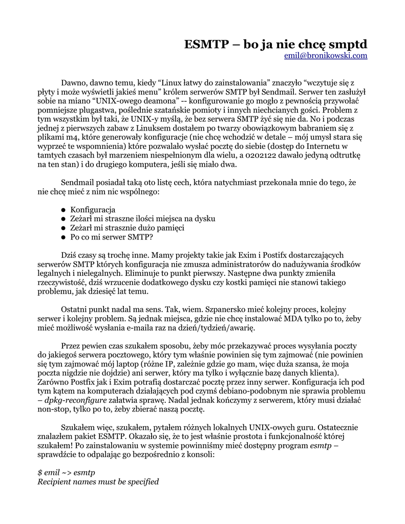 ESMTP – bo ja nie chcę smptd [email protected] Dawno, dawno temu, kiedy “Linux łatwy do zainstalowania” znaczyło “wczytuje się z płyty i może wyświetli jakieś menu” królem serwerów SMTP był Sendmail. Serwer ten zasłużył sobie na miano “UNIX-owego deamona” -- konfigurowanie go mogło z pewnością przywołać pomniejsze plugastwa, poślednie szatańskie pomioty i innych niechcianych gości. Problem z tym wszystkim był taki, że UNIX-y myślą, że bez serwera SMTP żyć się nie da. No i podczas jednej z pierwszych zabaw z Linuksem dostałem po twarzy obowiązkowym babraniem się z plikami m4, które generowały konfiguracje (nie chcę wchodzić w detale – mój umysł stara się wyprzeć te wspomnienia) które pozwalało wysłać pocztę do siebie (dostęp do Internetu w tamtych czasach był marzeniem niespełnionym dla wielu, a 0202122 dawało jedyną odtrutkę na ten stan) i do drugiego komputera, jeśli się miało dwa. Sendmail posiadał taką oto listę cech, która natychmiast przekonała mnie do tego, że nie chcę mieć z nim nic wspólnego: ● ● ● ● Konfiguracja Zeżarł mi straszne ilości miejsca na dysku Zeżarł mi strasznie dużo pamięci Po co mi serwer SMTP? Dziś czasy są trochę inne. Mamy projekty takie jak Exim i Postifx dostarczających serwerów SMTP których konfiguracja nie zmusza administratorów do nadużywania środków legalnych i nielegalnych. Eliminuje to punkt pierwszy. Następne dwa punkty zmieniła rzeczywistość, dziś wrzucenie dodatkowego dysku czy kostki pamięci nie stanowi takiego problemu, jak dziesięć lat temu. Ostatni punkt nadal ma sens. Tak, wiem. Szpanersko mieć kolejny proces, kolejny serwer i kolejny problem. Są jednak miejsca, gdzie nie chcę instalować MDA tylko po to, żeby mieć możliwość wysłania e-maila raz na dzień/tydzień/awarię. Przez pewien czas szukałem sposobu, żeby móc przekazywać proces wysyłania poczty do jakiegoś serwera pocztowego, który tym właśnie powinien się tym zajmować (nie powinien się tym zajmować mój laptop (różne IP, zależnie gdzie go mam, więc duża szansa, że moja poczta nigdzie nie dojdzie) ani serwer, który ma tylko i wyłącznie bazę danych klienta). Zarówno Postfix jak i Exim potrafią dostarczać pocztę przez inny serwer. Konfiguracja ich pod tym kątem na komputerach działających pod czymś debiano-podobnym nie sprawia problemu – dpkg-reconfigure załatwia sprawę. Nadal jednak kończymy z serwerem, który musi działać non-stop, tylko po to, żeby zbierać naszą pocztę. Szukałem więc, szukałem, pytałem różnych lokalnych UNIX-owych guru. Ostatecznie znalazłem pakiet ESMTP. Okazało się, że to jest właśnie prostota i funkcjonalność której szukałem! Po zainstalowaniu w systemie powinniśmy mieć dostępny program esmtp – sprawdźcie to odpalając go bezpośrednio z konsoli: $ emil ~> esmtp Recipient names must be specified Świetnie. Jeśli widzicie coś podobnego, znaczy, że całość powinna działać “z buta”. Wybieramy nasz ulubiony edytor1 i tworzymy plik .esmtprc w którym piszemy: # Serwer hostname=example.com:25 # Użytkownik [email protected] # Hasło password= majsikretpasłord # Autoryzacja z użyciem starttls #starttls=disable Po zapisaniu pliku mamy już wszystko z głowy. ESMTP jest “kompatybilne” z Sendmailem jeżeli chodzi o wywoływanie go jako procesu dostarczającego. Więc jeżeli coś gadało do niego, będzie potrafiło rozmawiać ze swoim dużo mniejszym bratem. Jeżeli np. nasza wersja Mutta nie posiada opcji komunikacji z SMTP (pamięć mnie zawodzi, ale to chyba opcja dostępna tylko w MuttNG) wystarczy dopisać jedną linijkę do konfiguracji: set sendmail="/usr/bin/esmtp -f [email protected]" Od tej pory poczta wychodząca z Mutta zostanie wysłana za pośrednictwem serwera skonfigurowanego w .esmtprc – koniec problemów. Oczywiście ESMTP ma także swoje minusy, ważne jednak, żeby te minusy nie przysłoniły Wam plusów. ESMTP jest proste. Bardzo proste. Nie oczekuj więc zarządzania kolejką. Poczta albo wychodzi, albo program wyrzuca z siebie błąd. Jest to oczywiście “wada” per design. Czy warto jest więc wyrzucić swojego MDA na rzecz takiego programiku? Dla mnie warto. Sprawdza się w produkcji, sprawdza się na moim laptopie. Jedna rzecz z głowy, pozostał miliard siedemset trzydzieści dziewięć tysięcy pięćset dwadzieścia dwa. Na szczęście *NIX przynajmniej pozwala mi zdejmować rzeczy z kupki i nie stara się dokładać kolejnych. 1 Poroponuję VI, Vim lub Elvisa. Może być też VI.