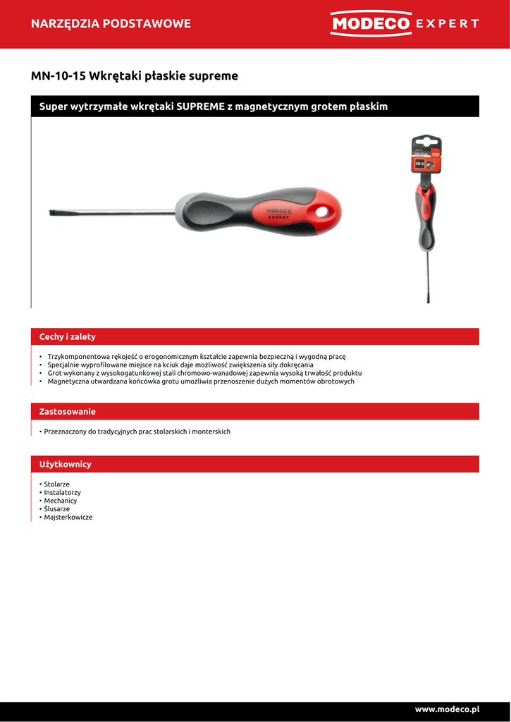NARZĘDZIA PODSTAWOWE MN-10-15 Wkrętaki płaskie supreme Super wytrzymałe wkrętaki SUPREME z magnetycznym grotem płaskim Cechy i zalety • • • • Trzykomponentowa rękojeść o erogonomicznym kształcie zapewnia bezpieczną i wygodną pracę Specjalnie wyprofilowane miejsce na kciuk daje możliwość zwiększenia siły dokręcania Grot wykonany z wysokogatunkowej stali chromowo-wanadowej zapewnia wysoką trwałość produktu Magnetyczna utwardzana końcówka grotu umożliwia przenoszenie dużych momentów obrotowych Zastosowanie • Przeznaczony do tradycyjnych prac stolarskich i monterskich Użytkownicy • Stolarze • Instalatorzy • Mechanicy • Ślusarze • Majsterkowicze www.modeco.pl NARZĘDZIA PODSTAWOWE Dane techniczne Waga opako Waga opako wania jednost wania zbiorcze kowego go Rozmiar grotu płaskiego Długość robo cza wkrętaka Opakowanie jednostkowe Opakowanie zbiorcze [mm] [mm] [szt] [szt] [kg] [kg] MN-10-151 3,0 75 6 120 0.18 3.6 5906757902695 MN-10-152 4,0 75 6 120 0.37 7.5 5906757902701 MN-10-153 5,0 100 6 90 0.46 6.9 5906757902718 MN-10-154 5,0 150 6 120 0.51 10.1 5906757902725 MN-10-155 6,0 25 6 120 0.48 9.6 5906757902732 MN-10-157 6,0 100 6 90 0.58 8.7 5906757902749 MN-10-159 6,0 150 6 90 0.66 10.0 5906757902756 MN-10-160 8,0 150 6 60 1.01 10.1 5906757902763 Indeks EAN Ostrzeżenia • Zawsze używaj ochrony oczu (okulary, gogle lub przyłbice ochronne) • Zawsze używaj ochrony rąk (rękawice) www.modeco.pl