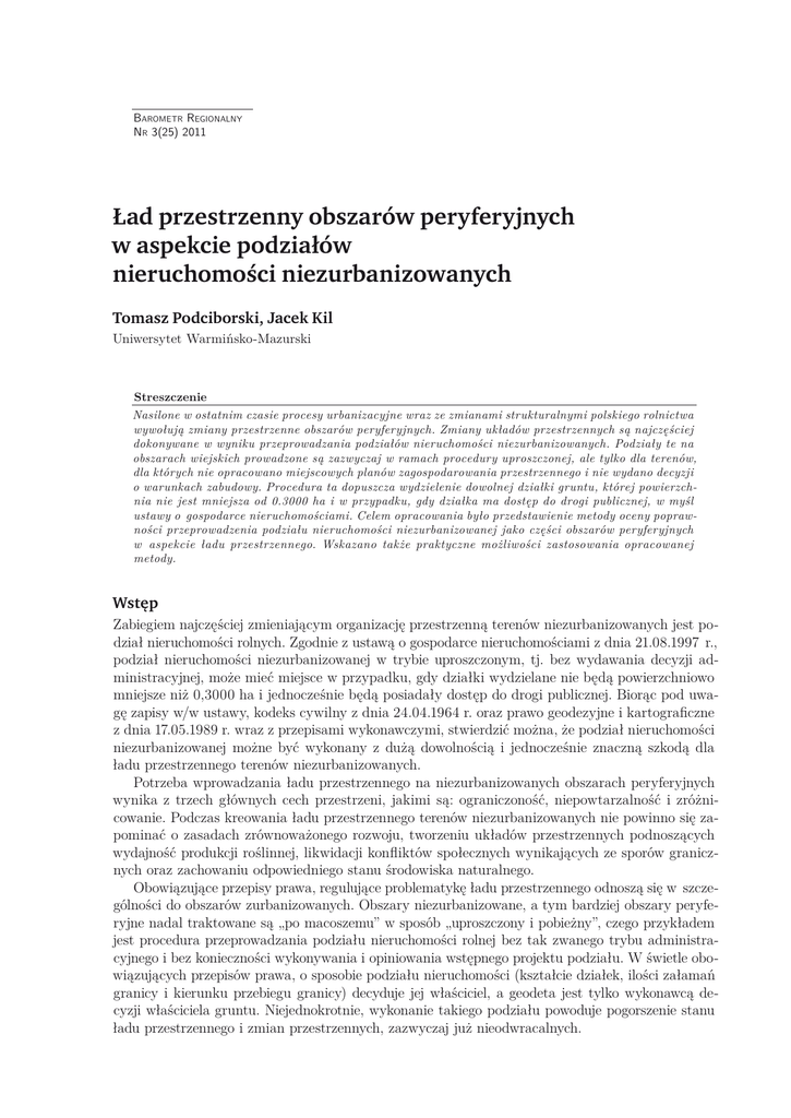 Barometr Regionalny Nr 3(25) 2011 Ład przestrzenny obszarów peryferyjnych w aspekcie podziałów nieruchomości niezurbanizowanych Tomasz Podciborski, Jacek Kil Uniwersytet Warmińsko-Mazurski Streszczenie Nasilone w ostatnim czasie procesy urbanizacyjne wraz ze zmianami strukturalnymi polskiego rolnictwa wywołują zmiany przestrzenne obszarów peryferyjnych. Zmiany układów przestrzennych są najczęściej dokonywane w wyniku przeprowadzania podziałów nieruchomości niezurbanizowanych. Podziały te na obszarach wiejskich prowadzone są zazwyczaj w ramach procedury uproszczonej, ale tylko dla terenów, dla których nie opracowano miejscowych planów zagospodarowania przestrzennego i nie wydano decyzji o warunkach zabudowy. Procedura ta dopuszcza wydzielenie dowolnej działki gruntu, której powierzchnia nie jest mniejsza od 0.3000 ha i w przypadku, gdy działka ma dostęp do drogi publicznej, w myśl ustawy o gospodarce nieruchomościami. Celem opracowania było przedstawienie metody oceny poprawności przeprowadzenia podziału nieruchomości niezurbanizowanej jako części obszarów peryferyjnych w aspekcie ładu przestrzennego. Wskazano także praktyczne możliwości zastosowania opracowanej metody. Wstęp Zabiegiem najczęściej zmieniającym organizację przestrzenną terenów niezurbanizowanych jest podział nieruchomości rolnych. Zgodnie z ustawą o gospodarce nieruchomościami z dnia 21.08.1997 r., podział nieruchomości niezurbanizowanej w trybie uproszczonym, tj. bez wydawania decyzji administracyjnej, może mieć miejsce w przypadku, gdy działki wydzielane nie będą powierzchniowo mniejsze niż 0,3000 ha i jednocześnie będą posiadały dostęp do drogi publicznej. Biorąc pod uwagę zapisy w/w ustawy, kodeks cywilny z dnia 24.04.1964 r. oraz prawo geodezyjne i kartograficzne z dnia 17.05.1989 r. wraz z przepisami wykonawczymi, stwierdzić można, że podział nieruchomości niezurbanizowanej możne być wykonany z dużą dowolnością i jednocześnie znaczną szkodą dla ładu przestrzennego terenów niezurbanizowanych. Potrzeba wprowadzania ładu przestrzennego na niezurbanizowanych obszarach peryferyjnych wynika z trzech głównych cech przestrzeni, jakimi są: ograniczoność, niepowtarzalność i zróżnicowanie. Podczas kreowania ładu przestrzennego terenów niezurbanizowanych nie powinno się zapominać o zasadach zrównoważonego rozwoju, tworzeniu układów przestrzennych podnoszących wydajność produkcji roślinnej, likwidacji konfliktów społecznych wynikających ze sporów granicznych oraz zachowaniu odpowiedniego stanu środowiska naturalnego. Obowiązujące przepisy prawa, regulujące problematykę ładu przestrzennego odnoszą się w szczególności do obszarów zurbanizowanych. Obszary niezurbanizowane, a tym bardziej obszary peryferyjne nadal traktowane są „po macoszemu” w sposób „uproszczony i pobieżny”, czego przykładem jest procedura przeprowadzania podziału nieruchomości rolnej bez tak zwanego trybu administracyjnego i bez konieczności wykonywania i opiniowania wstępnego projektu podziału. W świetle obowiązujących przepisów prawa, o sposobie podziału nieruchomości (kształcie działek, ilości załamań granicy i kierunku przebiegu granicy) decyduje jej właściciel, a geodeta jest tylko wykonawcą decyzji właściciela gruntu. Niejednokrotnie, wykonanie takiego podziału powoduje pogorszenie stanu ładu przestrzennego i zmian przestrzennych, zazwyczaj już nieodwracalnych. 80 Tomasz Podciborski, Jacek Kil Z uwagi na powyższe, należy stwierdzić, że peryferyjne obszary niezurbanizowane, wymagają szczególnych ustaleń podczas wykonywania podziałów nieruchomości i spojrzenia planistycznego, które pozwoliłoby na poprawę stanu ładu przestrzennego tejże cennej przestrzeni. W niniejszym opracowaniu podjęto próbę opracowania metody oceny poprawności przeprowadzenia podziału nieruchomości niezurbanizowanej w aspekcie ładu przestrzennego. Cel główny zrealizowano poprzez realizację celów szczegółowych: • wskazanie elementów przestrzeni, które są zmieniane podczas podziałów nieruchomości oraz określenia siły ich wpływu na stan ładu przestrzennego, • opracowanie wskaźników oceny stanu ładu przestrzennego, • opracowanie mierników dla wcześniej opracowanych wskaźników służących do oceny stanu ładu przestrzennego obszarów niezurbanizowanych, • opracowanie zasady oceny (procedury postępowania) podczas oceny stanu ładu przestrzennego obszarów niezurbanizowanych, • wskazanie możliwości zastosowania opracowanej metody. 1. Identyfikacja wskaźników oceny ładu przestrzennego peryferyjnych obszarów niezurbanizowanych Przy poszukiwaniu elementów kształtujących ład przestrzenny peryferyjnych obszarów niezurbanizowanych, starano się wyodrębnić wskaźniki agregujące poszczególne elementy przestrzeni kreujące stan ładu przestrzennego przestrzeni niezurbanizowanej. Takie podejście do zagadnienia pozwoliło uwzględnić nie tylko poszczególne elementy przestrzeni, ale także ich wzajemne relacje przestrzenne. Lista wskaźników oceny stanu ładu przestrzennego obszarów peryferyjnych w aspekcie podziałów nieruchomości niezurbanizowanych została ustalona na podstawie analizy literatury, badań eksperckich oraz własnych rozważań. Poprawność przeprowadzonego wyboru została potwierdzona wynikami badań ankietowych oraz wykonanymi analizami statystycznymi. Za główne wskaźniki oceny ładu przestrzennego uznano: rodzaj dostępu do drogi publicznej, dostępność komunikacyjną przestrzeni, wpasowanie granic władania w niezmienniki przestrzenne, harmonijność przestrzenną użytkowania, harmonijność przestrzenną władania, prostoliniowość linii granicznych — ilość punktów granicznych, rodzaj granic, określający przestrzenny zasięg prawa własności, kształt poziomy figur geometrycznych tworzonych przez granice działek i rodzaj stabilizacji punktów