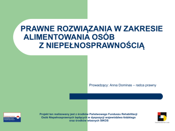 PRAWNE ROZWIĄZANIA W ZAKRESIE ALIMENTOWANIA OSÓB Z NIEPEŁNOSPRAWNOŚCIĄ Prowadzący: Anna Dominas – radca prawny Projekt ten realizowany jest z środków Państwowego Funduszu Rehabilitacji Osób Niepełnosprawnych będących w dyspozycji województwa łódzkiego oraz środków własnych SIKOS PRAWNE ROZWIĄZANIA W ZAKRESIE ALIMENTOWANIA OSÓB Z NEPEŁNOSPRAWNOŚCIĄ Niepełnosprawność intelektualna (obniżenie poziomu rozwoju intelektualnego) zaburzenie rozwojowe polegające na znacznym obniżeniu ogólnego poziomu funkcjonowania intelektualnego, któremu towarzyszy deficyt w zakresie zachowań adaptacyjnych (w szczególności niezależności i odpowiedzialności). - według definicji World Health Organization PRAWNE ROZWIĄZANIA W ZAKRESIE ALIMENTOWANIA OSÓB Z NEPEŁNOSPRAWNOŚCIĄ Alimentacja w świetle przepisów kodeksu rodzinnego i opiekuńczego (KRiO) Przez obowiązek alimentacyjny należy rozumieć obowiązek dostarczania środków utrzymania a w miarę potrzeby także środków wychowania osobie uprawnionej do alimentacji. Obowiązek alimentacyjny zgodnie z art. 128 KRiO obciążą krewnych w linii prostej oraz rodzeństwo. PRAWNE ROZWIĄZANIA W ZAKRESIE ALIMENTOWANIA OSÓB Z NEPEŁNOSPRAWNOŚCIĄ Alimentacja w świetle przepisów kodeksu rodzinnego i opiekuńczego (KRiO) Kolejność obowiązku alimentacyjnego: – – – zstępni – tj dzieci, wnukowie itd; wstępni – tj. rodzice, dziadkowie itd.; rodzeństwo. Jeżeli jest kilku zstępnych lub wstępnych, obowiązek alimentacyjny obciąża bliższych stopniem przed dalszymi (dzieci przed wnukami). PRAWNE ROZWIĄZANIA W ZAKRESIE ALIMENTOWANIA OSÓB Z NEPEŁNOSPRAWNOŚCIĄ Alimentacja w świetle przepisów kodeksu rodzinnego i opiekuńczego (KRiO) Zakres świadczeń alimentacyjnych: Zgodnie z treścią art. 135 KRiO zakres świadczeń alimentacyjnych zależy od usprawiedliwionych potrzeb uprawnionego oraz od zarobkowych i majątkowych możliwości zobowiązanego. Wykonanie obowiązku alimentacyjnego względem osoby niepełnosprawnej może polegać w całości lub w części na osobistych staraniach o utrzymanie lub wychowanie uprawnionego. PRAWNE ROZWIĄZANIA W ZAKRESIE ALIMENTOWANIA OSÓB Z NEPEŁNOSPRAWNOŚCIĄ Obowiązek alimentacyjny wobec osoby umieszczonej w domu pomocy społecznej (DPS) Obowiązek ten określa ustawa z dnia 12 marca 2004r. o pomocy społecznej. – koszt pobytu w DPS określa organ samorządu terytorialnego, prowadzący dany DPS; – koszt pobytu w DPS ogłaszany jest w wojewódzkim dzienniku urzędowym. PRAWNE ROZWIĄZANIA W ZAKRESIE ALIMENTOWANIA OSÓB Z NEPEŁNOSPRAWNOŚCIĄ Obowiązek alimentacyjny wobec osoby umieszczonej w domu pomocy społecznej (DPS) Kolejność ponoszenia odpłatności za pobyt w DPS: – mieszkaniec DPS; – małżonek; – zstępni; – wstępni; – gmina. PRAWNE ROZWIĄZANIA W ZAKRESIE ALIMENTOWANIA OSÓB Z NEPEŁNOSPRAWNOŚCIĄ Obowiązek alimentacyjny wobec osoby umieszczonej w domu pomocy społecznej (DPS) warunki finansowe uzasadniające odpadnięcie obowiązku ponoszenia odpłatności a pobyt osoby w DPS, wskazane w art. 61 ustawy o pomocy społecznej; okoliczności uzasadniające wnioskowanie o zwolnienie z obowiązku ponoszenia odpłatności za pobyt w DPS, wskazane w art. 64 ustawy o pomocy społecznej; PRAWNE ROZWIĄZANIA W ZAKRESIE ALIMENTOWANIA OSÓB Z NEPEŁNOSPRAWNOŚCIĄ Pełna zdolność do czynności prawnych pełną zdolność do czynności prawnych nabywa się z chwilą uzyskania pełnoletności; utrata pełnej zdolności do czynności prawnych następuje skutkiem orzeczenia o ubezwłasnowolnieniu całkowitym osoby pełnoletniej, bądź orzeczenia o ubezwłasnowolnieniu częściowym – wówczas osoba taka posiada jedynie ograniczoną zdolność do czynności prawnych; odzyskanie pełnej zdolności do czynności prawnych następuje skutkiem uchylenia ubezwłasnowolnienia wobec osoby; PRAWNE ROZWIĄZANIA W ZAKRESIE ALIMENTOWANIA OSÓB Z NEPEŁNOSPRAWNOŚCIĄ Ograniczona zdolność do czynności prawnych nabycie ograniczonej zdolności do czynności prawnych następuje z chwilą ukończenia lat 13; „nabycie” ograniczonej zdolności do czynności prawnych następuje skutkiem orzeczenia o ubezwłasnowolnieniu częściowym osoby pełnoletniej (ograniczenie zdolności); utrata ograniczonej zdolności do czynności prawnych następuje z chwilą orzeczenia o ubezwłasnowolnieniu całkowitym. PRAWNE ROZWIĄZANIA W ZAKRESIE ALIMENTOWANIA OSÓB Z NEPEŁNOSPRAWNOŚCIĄ Ubezwłasnowolnienie całkowite Osoba, która ukończyła lat 13, może być ubezwłasnowolniona całkowicie, jeżeli wskutek choroby psychicznej, niedorozwoju umysłowego albo innego rodzaju zaburzeń psychicznych, nie jest w stanie kierować swym postępowaniem – zgodnie z treścią art. 13 Kodeksu cywilnego. Dla ubezwłasnowolnionego całkowicie ustanawia się opiekę, chyba że pozostaje on jeszcze pod władzą rodzicielską. PRAWNE ROZWIĄZANIA W ZAKRESIE ALIMENTOWANIA OSÓB Z NEPEŁNOSPRAWNOŚCIĄ Ubezwłasnowolnienie częściowe Osoba pełnoletnia może być ubezwłasnowolniona częściowo w powodu choroby psychicznej, niedorozwoju umysłowego albo innego rodzaju zaburzeń psychicznych, jeżeli stan tej osoby nie uzasadnia ubezwłasnowolnienia całkowitego, lecz jest potrzebna pomoc do prowadzenia jej spraw – zgodnie z treścią art. 16 Kodeksu cywilnego. Dla osoby ubezwłasnowolnionej częściowo ustanawia się kuratelę. PRAWNE ROZWIĄZANIA W ZAKRESIE ALIMENTOWANIA OSÓB Z NEPEŁNOSPRAWNOŚCIĄ Podejmowanie czynności prawnych przez osoby ubezwłasnowolnione całkowicie: brak możliwości podjęcia pracy; brak możliwości zawarcia związku małżeńskiego; brak możliwości zawierania jednostronnych czynności prawnych; brak możliwości samodzielnego zawierania umów z wyjątkiem umów zawieranych w drobnych bieżących sprawach życia codziennego, pod warunkiem, że nie są krzywdzące dla ubezwłasnowolnionego. PRAWNE ROZWIĄZANIA W ZAKRESIE ALIMENTOWANIA OSÓB Z NEPEŁNOS