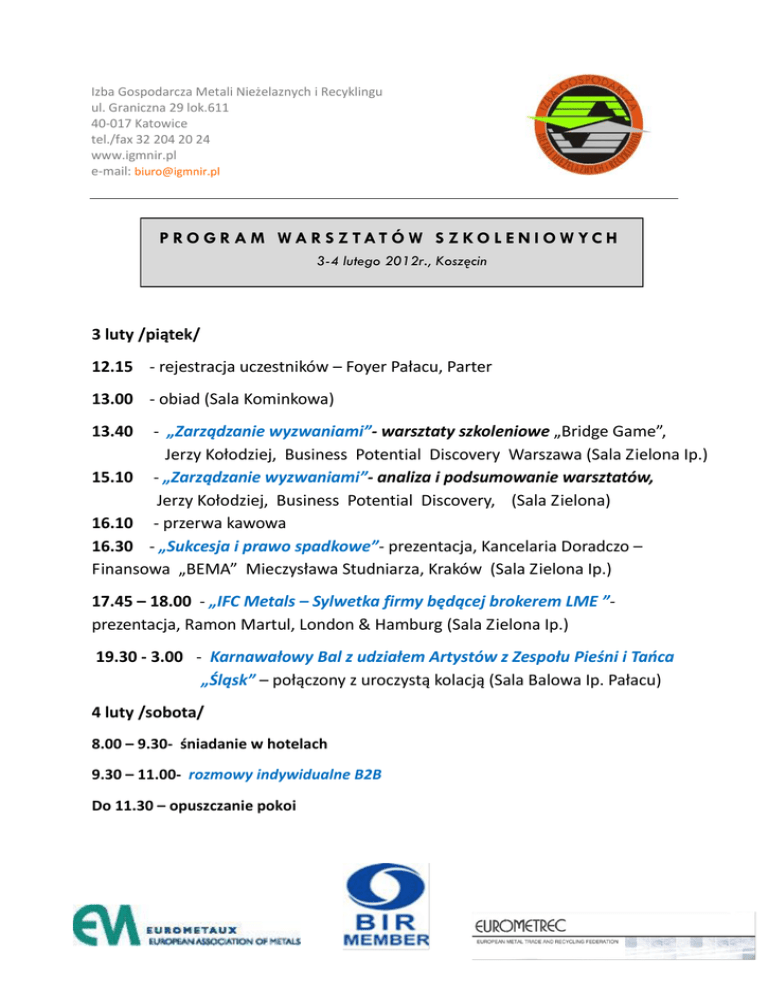 Izba Gospodarcza Metali Nieżelaznych i Recyklingu ul. Graniczna 29 lok.611 40-017 Katowice tel./fax 32 204 20 24 www.igmnir.pl e-mail: [email protected] P RO G R A M WA R S Z TAT Ó W S Z KO L E N I O W YC H 3-4 lutego 2012r., Koszęcin 3 luty /piątek/ 12.15 - rejestracja uczestników – Foyer Pałacu, Parter 13.00 - obiad (Sala Kominkowa) 13.40 - „Zarządzanie wyzwaniami”- warsztaty szkoleniowe „Bridge Game”, Jerzy Kołodziej, Business Potential Discovery Warszawa (Sala Zielona Ip.) 15.10 - „Zarządzanie wyzwaniami”- analiza i podsumowanie warsztatów, Jerzy Kołodziej, Business Potential Discovery, (Sala Zielona) 16.10 - przerwa kawowa 16.30 - „Sukcesja i prawo spadkowe”- prezentacja, Kancelaria Doradczo – Finansowa „BEMA” Mieczysława Studniarza, Kraków (Sala Zielona Ip.) 17.45 – 18.00 - „IFC Metals – Sylwetka firmy będącej brokerem LME ”prezentacja, Ramon Martul, London & Hamburg (Sala Zielona Ip.) 19.30 - 3.00 - Karnawałowy Bal z udziałem Artystów z Zespołu Pieśni i Tańca „Śląsk” – połączony z uroczystą kolacją (Sala Balowa Ip. Pałacu) 4 luty /sobota/ 8.00 – 9.30- śniadanie w hotelach 9.30 – 11.00- rozmowy indywidualne B2B Do 11.30 – opuszczanie pokoi