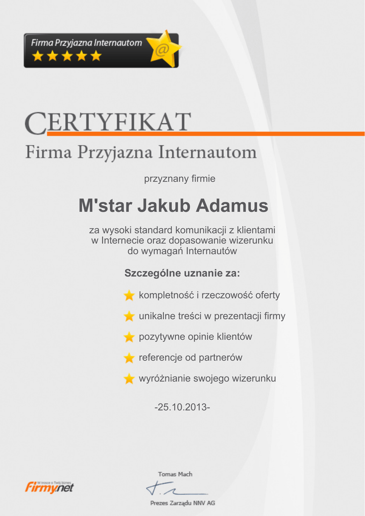 przyznany firmie M'star Jakub Adamus za wysoki standard komunikacji z klientami w Internecie oraz dopasowanie wizerunku do wymagań Internautów Szczególne uznanie za: kompletność i rzeczowość oferty unikalne treści w prezentacji firmy pozytywne opinie klientów referencje od partnerów wyróżnianie swojego wizerunku -25.10.2013-