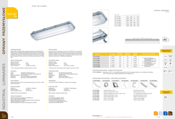 OPRAWA PRZEMYSŁOWA-źródła świetlówkowe DUSTPROOF AND WOTERTIGHT LUMINAIRE WYMIARY | DIMENSIONS [ mm ] TLP 47 Typ | Type T8 TLP 47-1180 L1 B H 450 111 105 105 TLP 47-1360 1283 660 111 TLP 47-1580 1583 900 111 105 TLP 47-2180 673 450 168 109 TLP 47-2360 1283 660 168 109 TLP 47-2580 1583 900 168 109 B L1 L PRZEZNACZENIE APPLICATION Pyłoszczelna i wodoszczelna oprawa przemysłowa do świetlówek T8. Przeznaczona do oświetlania obiektów przemysłowych, sportowych, magazynowych. Oprawa standardowo wyposażona jest w aluminiowy paraboliczny odbłyśnik. Może być stosowana na terenach otwartych oraz wewnątrz pomieszczeń jako alternatywa dla opraw typu "High Bay". Dus tproof an d water tight luminaire for T8 fluores cent lamps. Designed to light industrial facilities and utility rooms, warehouses, production and sport spaces. The luminaire equipped with aluminium parabolic reflector as a standard. Suitable for open areas and indoor spaces as alternative for “High Bay” type lighting. DANE TECHNICZNE INDUSTRIAL LUMINAIRES L 673 H OPRAWY PRZEMYSŁOWE IP 67; T8; CLASS I Klasa ochronności: Stopień ochrony: Współczynnik mocy: Temp. otoczenia: TECHNICAL DATA I IP 67 ≥ 0,95 od -20⁰C do +45⁰C* Protection class: Protection degree: Power factor: Ambient temperature: I IP 67 ≥ 0,95 from -20⁰C to +45⁰C* *Temp. otoczenia dla opraw z baterią od 0⁰C do +45⁰C *Ambient temp. for luminaires with a battery from 0⁰C to +45⁰C BUDOWA CONSTRUCTION Korpus: Klosz: Klamry zamykające: Odbłyśnik: Statecznik: poliwęglan stabilizowany UV przezroczysty poliwęglan stabilizowany UV stal nierdzewna aluminiowy odbłyśnik paraboliczny elektroniczny 220V-240V AC/DC Housing: Diffuser: Closing clips: Reflector: Ballast: UV stabilized polycarbonate transparent UV stabilized polycarbonate stainless steel aluminium parabolic 220V-240V AC/DC electronic MOUNTING Oprawa przeznaczona do mocowania bezpośrednio na suficie, ścianie lub do zawieszenia. Luminaire for direct installation on ceiling, wall or hanging. PRZYŁĄCZENIE ELECTRIC UNIT 2 x M20, 1 x zaślepka ø 6-12 mm 2x/3x4 mm²/ Cable gland: Cable diameter: Terminal block: Oprawka | Lamp base Typ lampy | Light Source Masa | Weight TLP 47-1180 1 x 18 W G 13 T8 1,4 KG TLP 47-1360 1 x 36 W G 13 T8 2,4 KG TLP 47-1580 1 x 58 W G 13 T8 3,4 KG TLP 47-2180 2 x 18 W G 13 T8 1,5 KG TLP 47-2360 2 x 36 W G 13 T8 2,9 KG TLP 47-2580 2 x 58 W G 13 T8 3,8 KG Inne wykonania | Options IP 67 M - statecznik magnetyczny /tylko wersja 1x18W/36W/58W | magnetic ballast (only 1x18W/36W/58W version) A3 - zasilanie awaryjne 3 godzinny | 3h emergency unit 3F - zasilanie przelotowe 3 fazowe I 3-phase through wiring PM - klosz z polimetakrylanu | PMMA diffuser 2 x M20, 1 x blanking plug ø 6-12 mm 2x/3x4 mm²/ Mains supply: ending or through wiring. INNE WYKONANIA OPTIONS Oprawa wyposażona w statecznik magnetyczny /tylko wersje 1x18W/36W/58W/. Oprawa wyposażona w układ awaryjnego zasilania 3 godzinny. Zasilanie przelotowe 3 fazowe. Oprawa wyposażona w klosz z polimetakrylanu PMMA. Luminaire with magnetic ballast (only 1x18W/36W/58W version). Luminaire with 3h emergency unit. Luminaire with 3-phase through wiring. Luminaire with PMMA diffuser. 220-240V AC/DC G 13 POZIOM LEVEL N IK 09 -20°C TLP 47-2360/A3 - Oprawa typ TLP 47 o mocy 2x36W wyposażona w układ awaryjnego zasilania o czasie działania 3 godziny. | TLP 47 luminaire type, 2x36W wattage with 3h emergency unit. +45°C DODATKOWE WYPOSAŻENIE | ADDITIONAL EQUIPMENT 31-144-9002 Zasilanie końcowe lub przelotowe. 2.19 Moc | Wattage Typ | Type PRZYKŁAD OZNACZENIA | ORDER SPECIFICATION MOCOWANIE Dławnica: Średnica kabla: Zaciski przyłączeniowe: DANE TECHNICZNE TECHNICAL DATA 31-144-8999 31-144-8997 31-153-2001 31-153-2000 31-145-2379 31-145-2589 31-144-9002 - wspornik W (kpl. 2 szt.) | W bracket (set 2 pcs) 31-144-8999 - zawiesie oczkowe (kpl. 2 szt.) | eyelet sling (set 2 pcs) 31-144-8997 - obejma nierdzewna na słup ³/2'' (kpl. 2 szt.) | ³/2'' stainless pole bracket (set 2 pcs) 31-153-2001 - wspornik ukośny (kpl. 2 szt.) | slanting bracket (set 2 pcs) 31-153-2000 - wspornik kątowy (kpl. 2 szt.) | angular bracket (set 2 pcs) 31-145-2379 - osłona z drutu 36W | steel wire guard 36W 31-145-2589 - osłona z drutu 58W | steel wire guard 58W www.polam-rem.com.pl, [email protected] DOPUSZCZENIA APPROVALS 2.20
