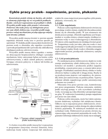 Cykle pracy pralek– napełnianie, pranie, płukanie Poziom wody Wa³ napêdowy Mieszad³o Wa³ obrotowy jest po³¹czony z bêbnem Pas napêdowy Wa³ mieszad³a Sprzêg³o Przek³adnia Pas napêdowy Pompa Silnik ki ni ro LE kt E le -e is er w w .s w w I w końcu wszystkie pralki muszą być wyposażone w programator (nazywany również timerem), który nadzoruje kiedy należy rozpocząć lub zakończyć, K T R Rys. 1 Typowy układ napędowy pralki automatycznej. N Klin O Zbiornik Bêben 1.2. Cykl prania/płukania Po zamknięciu przez elektrozawory dopływu wody zostaje uruchomiony silnik elektryczny, który (w zależności od modelu i producenta pralki) napędza przekładnię, czasem przez pasy, a czasem także przez sprzęgło. Przekładnia zamienia obroty silnika w ruchy obrotowe bębna w jedną lub w drugą stronę. Ruchy te są przekazywane poprzez wał napędowy do mieszadła, które jest zamocowany za pomocą klina. Typowy schemat układu napędowego pralki automatycznej pokazano na rysunku 1. Mieszanie trwa przez pewien czas, kontrolowany jest przez programator. Podczas mieszania, niektóre pralki używają pompy w celu wywołania cyrkulacji wody, wysysając ją z dna zbiornika i przepompowując na górę. W większości konstrukcji pompa napędzana jest przez ten sam silnik. Podczas cyklu mieszania, może być także automatycznie dodawany wybielacz lub zmiękczacz tkanin. Odbywa się to najczęściej przez elektrozawór, otwierający przepływającej wodzie dostęp do odpowiedniej komory pojemnika. W niektórych modelach nie ma cyrkulacji wody. Elektrozawór po prostu otwiera się, wpuszczając całą zawartość pojemnika do wody. Programator informuje elektrozawór, kiedy ma to nastąpić. om IK .p I l Wszystkie pralki muszą również w pewien sposób napełniać zbiornik wodą oraz w pewien sposób go opróżniać. W dodatku pralki muszą także kontrolować poziom wody w zbiorniku, aby zapobiec wyciekowi z powodu przepełnienia lub z powodu siły odśrodkowej działającej podczas odwirowywania. Wszystkie pralki muszą także (zgodnie z normami dotyczącymi bezpieczeństwa obsługi) ) posiadać mechanizm, który zatrzymuje bęben na koniec cyklu odwirowywania, a także zamek pokrywy uniemożliwiający otwarcie pokrywy w trakcie lub krótko po odwirowaniu. a także ile czasu mają trwać poszczególne cykle prania, płukania, wirowania, itd. 1. Cykle 1.1. Cykle napełniania Podczas cyklu napełniania elektrozawór otwiera się pozwalając wodzie zimnej, ciepłej lub obu jednocześnie dostać się do zbiornika pralki. W tym momencie nie działa jeszcze pompa. Zbiornik napełniany jest bezpośrednio w wyniku różnicy ciśnień między źródłem (ciśnieniem wody w sieci wodociągowej) a zbiornikiem. W trakcie cyklu napełniania nie działają również grzałki. Temperatura wody jest taka, jaką ma woda w sieci wodociągowej lub jaka powstanie w wyniku zmieszania wody zimnej i cieplej. Kiedy woda w zbiorniku osiągnie odpowiedni poziom, przełącznik ciśnieniowy zamyka elektrozawory. .c Konstrukcje pralek różnią się bardzo, ale niektóre elementy pojawiają się we wszystkich pralkach. Każda z nich jest wyposażona na przykład w silnik. Wszystkie pralki mają cykle prania i wirowania. Ponieważ oba tryby pracy są obsługiwane przez ten sam silnik elektryczny, wszystkie pralki mają pewien rodzaj mechanizmu przełączającego między tymi dwoma cyklami.