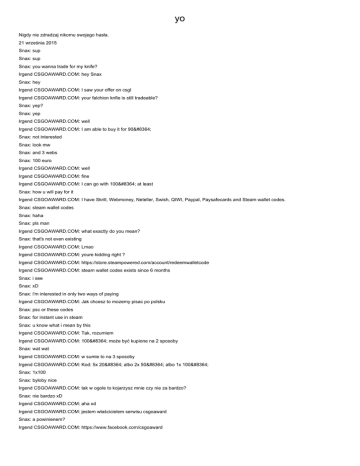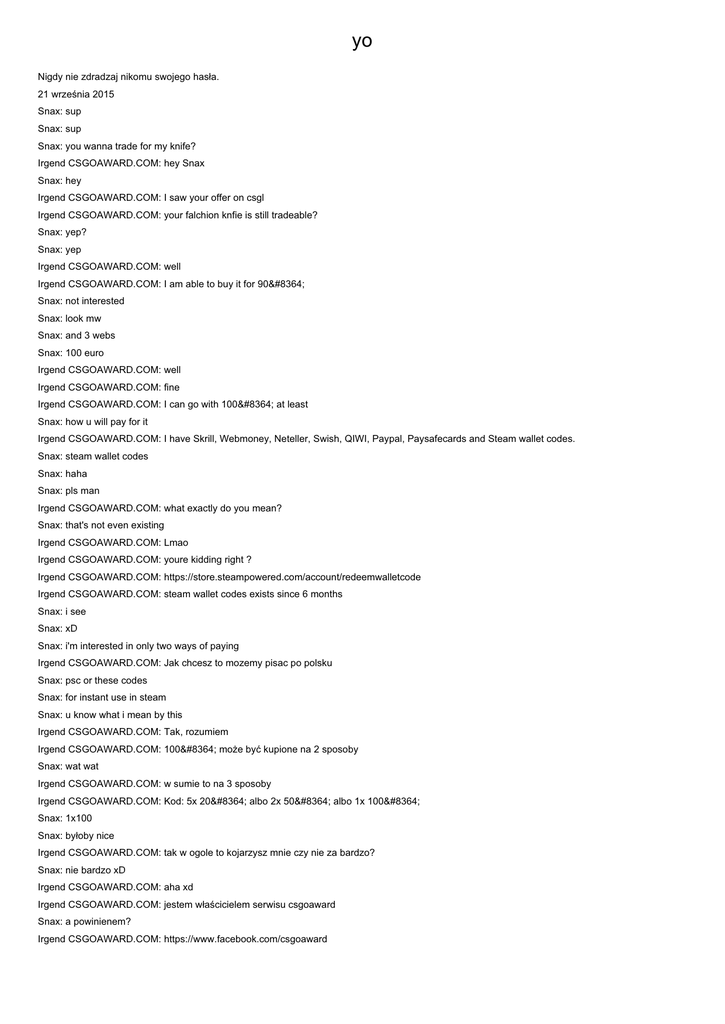 yo Nigdy nie zdradzaj nikomu swojego hasła. 21 września 2015 Snax: sup Snax: sup Snax: you wanna trade for my knife? Irgend CSGOAWARD.COM: hey Snax Snax: hey Irgend CSGOAWARD.COM: I saw your offer on csgl Irgend CSGOAWARD.COM: your falchion knfie is still tradeable? Snax: yep? Snax: yep Irgend CSGOAWARD.COM: well Irgend CSGOAWARD.COM: I am able to buy it for 90€ Snax: not interested Snax: look mw Snax: and 3 webs Snax: 100 euro Irgend CSGOAWARD.COM: well Irgend CSGOAWARD.COM: fine Irgend CSGOAWARD.COM: I can go with 100€ at least Snax: how u will pay for it Irgend CSGOAWARD.COM: I have Skrill, Webmoney, Neteller, Swish, QIWI, Paypal, Paysafecards and Steam wallet codes. Snax: steam wallet codes Snax: haha Snax: pls man Irgend CSGOAWARD.COM: what exactly do you mean? Snax: that's not even existing Irgend CSGOAWARD.COM: Lmao Irgend CSGOAWARD.COM: youre kidding right ? Irgend CSGOAWARD.COM: https://store.steampowered.com/account/redeemwalletcode Irgend CSGOAWARD.COM: steam wallet codes exists since 6 months Snax: i see Snax: xD Snax: i'm interested in only two ways of paying Irgend CSGOAWARD.COM: Jak chcesz to mozemy pisac po polsku Snax: psc or these codes Snax: for instant use in steam Snax: u know what i mean by this Irgend CSGOAWARD.COM: Tak, rozumiem Irgend CSGOAWARD.COM: 100€ może być kupione na 2 sposoby Snax: wat wat Irgend CSGOAWARD.COM: w sumie to na 3 sposoby Irgend CSGOAWARD.COM: Kod: 5x 20€ albo 2x 50€ albo 1x 100€ Snax: 1x100 Snax: byłoby nice Irgend CSGOAWARD.COM: tak w ogole to kojarzysz mnie czy nie za bardzo? Snax: nie bardzo xD Irgend CSGOAWARD.COM: aha xd Irgend CSGOAWARD.COM: jestem właścicielem serwisu csgoaward Snax: a powinienem? Irgend CSGOAWARD.COM: https://www.facebook.com/csgoaward Irgend CSGOAWARD.COM: i kupuje roznego rodzaju noże / skiny na giveawaye które organizuje co 2-3 dni Snax: wow Snax: to nice Snax: xD Irgend CSGOAWARD.COM: jak masz facebooka to mozesz napisac do mnie prywatna wiadomosc i Ci to udowodnie Irgend CSGOAWARD.COM: Emotikon tongue Snax: a dla pewności moge sprawdzić, nie że ci nie ufam Snax: xD Irgend CSGOAWARD.COM: Marcin Gołda? Snax: ta Snax: xD Snax: to jak z tym koed Snax: kodem Irgend CSGOAWARD.COM: no wlasnie patrze jakie są Irgend CSGOAWARD.COM: to chcesz paysafecard czy steam wallet code ? Snax: psc zbiera swój vat wiec wole kod Irgend CSGOAWARD.COM: psc zabiera vat kupującemu Irgend CSGOAWARD.COM: a nie temu, który go używa Irgend CSGOAWARD.COM: np zeby kupic paysafecard za 100€ muszę zapłacic 103.4 € Snax: no Snax: tak Snax: o to mi chodziło Snax: xD Irgend CSGOAWARD.COM: no ale steam tez to zabiera Irgend CSGOAWARD.COM: wiec to bez znaczenia Irgend CSGOAWARD.COM: paysafecardy mozesz uzyc praktycznie wszedzie, nawet zeby doladowac portfel steam Irgend CSGOAWARD.COM: a steam wallet cody tylko na platformie steam Snax: ale to na steama wole Irgend CSGOAWARD.COM: jak jestes pewny ze na 100% chcesz doladowac sobie portfel Snax: bo kupie klucze Irgend CSGOAWARD.COM: to nie ma problemu Snax: i wymienie na lepsza kose, nie? Emotikon grin Snax: bo czekaj jak doładuje te 100 euro na steam Snax: to tyle bede mial w portfelu? Snax: i tym moge normalnie operowac? Irgend CSGOAWARD.COM: jak doładujesz 100€ do portfelu steam Irgend CSGOAWARD.COM: to normalnie masz 100€ Irgend CSGOAWARD.COM: a ja zapłacę 101 albo 102€ za to Irgend CSGOAWARD.COM: i mozesz robic z tymi pieniedzmi wszystko Irgend CSGOAWARD.COM: kupować gry, kupic coś na rynku steam itp Snax: no dobra Irgend CSGOAWARD.COM: sory jak źle się wyrażam ale ostatni raz w Polsce byłem 4 lata temu Irgend CSGOAWARD.COM: xD Snax: tylko jak to sie zatwierdza te kody Snax: jest dobrze xD Irgend CSGOAWARD.COM: klikasz w ten link co co wyslalem Irgend CSGOAWARD.COM: https://store.steampowered.com/account/redeemwalletcode Irgend CSGOAWARD.COM: i masz tam "Kod portfela steam" Irgend CSGOAWARD.COM: wpisujesz go, klikasz kontynuuj i to wszystko Snax: wow Snax: ok Snax: a jak mi chcesz dac ten kod Snax: po wymianie? Irgend CSGOAWARD.COM: no wlasnie, ty chcesz 100€ czy 2x 50€ czy jak ? Snax: 100 euro dzialajace Snax: xD Snax: bo i tak bedzie 100 Snax: nie? Irgend CSGOAWARD.COM: czyli 1 kod o wartosci 100€ Irgend CSGOAWARD.COM: no tak, jak go użyjesz to w portfelu bedzie 100€ Irgend CSGOAWARD.COM: a nie jakieś 98.9€ Irgend CSGOAWARD.COM: xd Irgend CSGOAWARD.COM: wiesz o co chodzi z tym vatem co nie ? Snax: nie do konca Irgend CSGOAWARD.COM: no chodzi o to, że po prostu jak użyjesz doładowania steam za 100€ to dostajesz do portfela 100€ Irgend CSGOAWARD.COM: a ja żeby kupić tą karte musze zaplacic 101.9 € Irgend CSGOAWARD.COM: Emotikon tongue Snax: a Snax: to chujowo Snax: xD Irgend CSGOAWARD.COM: nie no spoko Irgend CSGOAWARD.COM: mam pytanie Irgend CSGOAWARD.COM: chcesz zebym wrzucil na tweetera Irgend CSGOAWARD.COM: informacje o naszej wymianie Irgend CSGOAWARD.COM: tzn ogloszenie Irgend CSGOAWARD.COM: z twoim profilem steam itp ? Irgend CSGOAWARD.COM: ludzie dadzą Ci dużo +repów za to z mojej społeczności Irgend CSGOAWARD.COM: https://twitter.com/CSGOAward Irgend CSGOAWARD.COM: tutaj jest tweeter Snax: dla mnie nie ma problemu, a nawet może ci bardziej zaufają, ja dostane repów troche Snax: Emotikon grin Irgend CSGOAWARD.COM: okej Snax: nie mam nic przeciwko Irgend CSGOAWARD.COM: to moment Irgend CSGOAWARD.COM: poszło Irgend CSGOAWARD.COM: https://twitter.com/CSGOAward Snax: widze Emotikon tongue Irgend CSGOAWARD.COM: dobra Irgend CSGOAWARD.COM: mam ci wysłać ten kod steam tutaj (w czacie steam) czy na jakis twoj adres email ? Irgend CSGOAWARD.COM: czy na facebooku Irgend CSGOAWARD.COM: ? Snax: tu albo face Snax: obojetnie Irgend CSGOAWARD.COM: Okej Snax: A zanim skończy się rozmowa, mam pytanko jeżeli moge. Sa jakies zarobki z prowadzenia fanpage? Irgend CSGOAWARD.COM: no tak Irgend CSGOAWARD.COM: zbierasz społeczność np, w moim wypadku juz jest 14.000 osob Irgend CSGOAWARD.COM: i pozniej mozesz reklamowac in