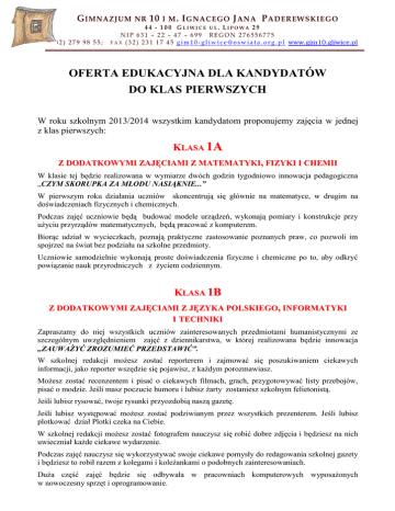 G IMNAZJUM TEL (32) 279 98 55; NR 10 I M . I GNACEGO J ANA P ADEREWSKIEGO 44 - 100 GLIWICE UL. LIPOWA 29 NIP 631 – 22 – 47 – 699 REGON 276556775 F A X ( 3 2 ) 2 3 1 1 7 4 5 g i m 1 0 - g l i w i c e @ o s w i a t a . o r g . p l www.gim10.gliwice.pl OFERTA EDUKACYJNA DLA KANDYDATÓW DO KLAS PIERWSZYCH W roku szkolnym 2013/2014 wszystkim kandydatom proponujemy zajęcia w jednej z klas pierwszych: KLASA 1A Z DODATKOWYMI ZAJĘCIAMI Z MATEMATYKI, FIZYKI I CHEMII W klasie tej będzie realizowana w wymiarze dwóch godzin tygodniowo innowacja pedagogiczna „CZYM SKORUPKA ZA MŁODU NASIĄKNIE...” W pierwszym roku działania uczniów skoncentrują się głównie na matematyce, w drugim na doświadczeniach fizycznych i chemicznych. Podczas zajęć uczniowie będą budować modele urządzeń, wykonają pomiary i konstrukcje przy użyciu przyrządów matematycznych, będą pracować z komputerem. Biorąc udział w wycieczkach, poznają praktyczne zastosowanie poznanych praw, co pozwoli im spojrzeć na świat bez podziału na szkolne przedmioty. Uczniowie samodzielnie wykonają proste doświadczenia fizyczne i chemiczne po to, aby odkryć powiązanie nauk przyrodniczych z życiem codziennym. KLASA 1B Z DODATKOWYMI ZAJĘCIAMI Z JĘZYKA POLSKIEGO, INFORMATYKI I TECHNIKI Zapraszamy do niej wszystkich uczniów zainteresowanych przedmiotami humanistycznymi ze szczególnym uwzględnieniem zajęć z dziennikarstwa, w której realizowana będzie innowacja „ZAUWAŻYĆ ZROZUMIEĆ PRZEDSTAWIĆ”. W szkolnej redakcji możesz zostać reporterem i zajmować się poszukiwaniem ciekawych informacji, jako reporter wszędzie się pojawisz, z każdym porozmawiasz. Możesz zostać recenzentem i pisać o ciekawych filmach, grach, przygotowywać listy przebojów, pisać o modzie. Jeśli masz poczucie humoru i lubisz żarty zostaniesz szkolnym felietonistą. Jeśli lubisz rysować, twoje rysunki przyozdobią naszą gazetę. Jeśli lubisz występować możesz zostać podziwianym przez wszystkich prezenterem. Jeśli lubisz plotkować dział Plotki czeka na Ciebie. W szkolnej redakcji możesz zostać fotografem nauczysz się robić dobre zdjęcia i będziesz na nich uwieczniał każde ciekawe wydarzenie. Podczas zajęć nauczysz się wykorzystywać swoje ciekawe pomysły do redagowania szkolnej gazety i będziesz to robił razem z kolegami i koleżankami o podobnych zainteresowaniach. Duża część zajęć będzie się odbywała w pracowniach komputerowych wyposażonych w nowoczesny sprzęt i oprogramowanie. KLASA 1C Z DODATKOWYMI ZAJĘCIAMI Z JĘZYKA POLSKIEGO I ZAJĘĆ ARTYSTYCZNYCH Do klasy, w której realizowana będzie innowacja „LUBIĘ TEATR” zapraszamy uczniów o zainteresowaniach humanistycznych, lubiących czytać, tych, którzy mieli już do czynienia ze szkolnym teatrem amatorskim, ale i tych, którzy chcieliby po raz pierwszy spróbować wcielić się w różne role. Na zajęciach będą mogli rozwijać swoje pasje i twórczo się realizować. Oczywiście, chętni uczniowie muszą zdawać sobie sprawę, że są to dodatkowe godziny spędzone w szkole. Argumentem za jest to, że zajęcia teatralne to przede wszystkim zabawa. Dzięki nim młodzież staje się bardziej otwarta i samodzielna, a równocześnie uczy się odpowiedzialności za siebie i grupę. Taka postawa pomaga w całym procesie edukacyjnym. KLASA 1D Z DODATKOWYMI ZAJĘCIAMI Z JĘZYKA POLSKIEGO W klasie realizowana będzie innowacja „ODBIERAM FILMOWA W GIMNAZJUM”. I TWORZĘ, CZYLI EDUKACJA Podczas zajęć będziesz oglądać filmy, a potem będziesz o nich dyskutować, nauczysz się też tworzyć własne filmy. Począwszy od pierwszego dnia zajęć, w trakcie cotygodniowych dwugodzinnych warsztatów poznasz czym jest scenariusz, scenopis, recenzja. Oprócz tego dowiesz się, jaką rolę odgrywa przy produkcji filmu reżyser, producent, scenarzysta. Nabierzesz umiejętności z zakresu dziennikarstwa prasowego związanego bezpośrednio z filmem. Będziesz również wychodzić do kina Amok, aby oglądać nowości filmowe, ale także klasykę filmu. Wspólne wyjścia na seanse będziemy omawiać w formie projektu lub warsztatów na zajęciach w szkole. Jeśli będziesz chciał, weźmiesz udział w konkursach związanych z X Muzą. Będziemy stale pod czujnym okiem fachowców z różnych dziedzin, związanych z produkcją filmu. Uczniowie staną się uczestnikami programu FILMOTEKA SZKOLNA. AKCJA. INNOWACYJNA TECHNIKA Dla wszystkich uczniów klas „INNOWACYJNA TECHNIKA”. pierwszych mamy propozycję udziału w programie Nasza szkoła przystąpiła do projektu finansowanego w całości ze środków budżetu państwa i Unii Europejskiej w ramach Europejskiego Funduszu Społecznego, koordynowanego przez Naczelną Organizację Techniczną z siedzibą w Warszawie. Podczas zajęć, do których zapewniamy wszystkie niezbędne materiały i zestawy ćwiczeń, uczniowie zapoznają się z technicznym zagadnieniem przepływu informacji. Będą uczyć się przesyłać dane, zapoznają się z budową sieci, nauczą się, jak korzystać z informacji w sieci. Poznają podstawy fotografii i filmu. Wyzwolą w sobie niebywałą kreatywność, projektując i budując własne urządzenia. Do tego projektu zostały zaproszone tylko cztery gimnazja z województwa śląskiego, w tym nasze. COMENIUS. PARTNERSKIE PROJEKTY SZKÓŁ We wrześniu 2013 r. nasza szkoła po raz kolejny przystąpiła do dwuletniego programu Comenius. Partnerskie projekty szkół, realizując projekt „EUROPEAN TECHNOLOGY AND VOCATION IN PAST AND PRESENT”. Naszymi partnerami są szkoły gimnazjalne w Niemczech, Wielkiej Brytanii i Hiszpanii. Projekt obejmuje zagadnienia z dziedziny historii, informatyki i techniki. Pozwoli on na pogłębienie znajomości języka angielskiego. Uczniowie uczą się poprzez zabawę, wyjazdy i spotkania warsztatowe – „hands on experience”. W ramach programu uczestnicy poznają kolegów i koleżanki z partnerskich szkół, będą wspólnie pracowa