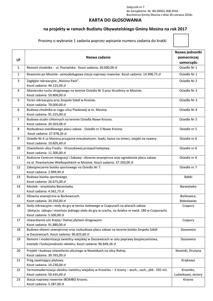 Załącznik nr 7 do Zarządzenia Nr BG.00501.308.2016 Burmistrza Gminy Mosina z dnia 30 czerwca 2016r. KARTA DO GŁOSOWANIA na projekty w ramach Budżetu Obywatelskiego Gminy Mosina na rok 2017 Prosimy o wybranie 1 zadania poprzez wpisanie numeru zadania do kratki LP Nazwa zadania Nazwa jednostki pomocniczej samorządu 1 Remont chodnika - ul. Poznańska. Koszt zadania: 30.000,00 zł Osiedle Nr 1 2 Rowerem po Mosinie- samoobsługowa stacja naprawy rowerów. Koszt zadania: 14.998,75 zł Osiedle Nr 1 3 Zagłębie rekreacyjne „Nizinna Park”. Koszt zadania: 44.125,00 zł Miasteczko ruchu drogowego na terenie Osiedla Nr 3 przy Strzelnicy w Mosinie. Koszt zadania: 50.800,00 zł Teren rekreacyjny przy Zespole Szkół w Krośnie. Koszt zadania: 70.000,00 zł Budowa chodnika w ciągu ulicy Piaskowej w m. Mosina. Koszt zadania: 91.225,00 zł Budowa studni chłonnych na terenie Osiedla Nowe Krosno. Koszt zadania: 20.503,08 zł Rozbudowa osiedlowego placu zabaw - Osiedle nr 5 Nowe Krosno. Koszt zadania: 27.978,20 zł Osiedle Nr 6 za Moreną przyjazne mieszkańcom- ławki, kosze na śmieci, stojaki na rowery. Koszt zadania: 10.605,60 zł Oświetlenie ulicy Fredry - Orzeszkowej przejazd kolejowy. Koszt zadania: 11.300,00 zł Rodzinne Centrum Integracji i Zabawy- siłownia zewnętrzna oraz ogrodzenie placu zabaw na ul. Powstańców Wielkopolskich w Mosinie. Koszt zadania: 37.350,00 zł Zabezpieczenie boiska sportowego na Osiedlu Nr 7. Koszt zadania: 2.999,99 zł Budowa boiska sportowego. Koszt zadania: 26.675,00 zł Mostek - wizytówka Baranówka. Koszt zadania: 4.561,73 zł Siłownia zewnętrzna w Borkowicach. Koszt zadania: 20.350,00 zł Stoły rekreacyjne i stoły do gry w tenisa stołowego w Czapurach na placach zabaw (dotyczy zakupu i montażu jednego stołu do gry w szachy, na działce nr ewid. 180 w Czapurach). Koszt zadania: 5.500,00 zł Utwardzenie ulic Krętej i Dolnej płytami drogowymi. Koszt zadania: 91.880,00 zł Budowa siłowni zewnętrznej oraz rozbudowa placu zabaw na terenie boiska Zespołu Szkół w Daszewicach. Koszt zadania: 96.825,60 zł Remont i modernizacja świetlicy wiejskiej w Daszewicach w celu poprawy bezpieczeństwa, estetyki i funkcjonalności obiektu. Koszt zadania: 96.849,26 zł Osiedle Nr 2 Projekt i budowa oświetlenia ulicznego w Nowinkach na ulicy Rolnej. Koszt zadania: 39.765,00 zł Próg zwalniający płytowy. Koszt zadania: 10.230,00 zł Termomodernizacja obiektu świetlicy wiejskiej w Krosinku – 3 ściany – wsch., zach., płd.- 335 m2. Koszt zadania: 50.435,00 zł Stacja naprawy rowerów IBOMBO Krosno. Koszt zadania: 5.287,00 zł Nowinki, Drużyna 4 5 6 7 8 9 10 11 12 13 14 15 16 17 18 19 20 21 22 23 Osiedle Nr 3 Osiedle Nr 3 Osiedle Nr 4 Osiedle Nr 5 Osiedle nr 5 Osiedle nr 6 Osiedle nr 6 Osiedle nr 6 Osiedle nr 7 Babki Baranówko Borkowice, Bolesławiec Czapury Czapury Daszewice Daszewice Krajkowo Krosinko, Ludwikowo, Jeziory Krosno 24 25 26 27 28 29 30 31 32 33 34 35 36 37 38 39 Utwardzenie terenu przy świetlicy wiejskiej w Krośnie Koszt zadania: 100.000,00 zł Zakup i montaż 4 stojaków dla rowerów przed placem zabaw przy ulicy Nadleśna/Jasna. Koszt zadania: 3.328,00 zł Boisko wielofunkcyjne w Mieczewie. Koszt zadania: 30.965,00 zł Dziecięcy ogródek zdrowia. Koszt zadania 10.447,00 zł Remont częściowy elewacji budynku wielofunkcyjnego w Pecnej. Koszt zadania: 43.050,00 zł Utwardzenie terenu przy przychodni w Pecnej. Koszt zadania: 44. 895,00 zł Utwardzenie wyjazdów na drogę powiatową w Radzewicach. Koszt zadania: 21.752,53 zł Remont części drogi gminnej (dz. Nr 58/1) ul. Poznańska w Rogalinie wraz z chodnikiem i pętlą autobusu szkolnego. Koszt zadania: 41.632,83 zł Utwardzenie powierzchni jezdni kostką brukową w Rogalinku ul. Kostrzewskiego (przy szkole). Koszt zadania: 65.313,03 zł Wiejska OAZA w Rogalinku. Koszt zadania: 87.175,00 zł Siłownia zewnętrzna przy placu zabaw w Sasinowie. Koszt zadania: 8.745,00 zł Utwardzenie wjazdu w ul. Podróżników w Sasinowie. Koszt zadania: 8.100,00 zł Remont świetlicy wiejskiej w Świątnikach. Koszt zadania: 17.160 00 zł Siłownia zewnętrzna. Koszt zadania: 31.051,35 zł Remont świetlicy wiejskiej w Żabinku. Koszt zadania: 16.815,60 zł Zagospodarowanie terenu przed świetlicą „teren w zieleni”. Koszt zadania: 1.100,00 zł Krosno Krosno Mieczewo Pecna Pecna Pecna Radzewice Rogalin Rogalinek Rogalinek Sasinowo Sasinowo Świątniki Wiórek Żabinko Żabinko UWAGA: NALEŻY WYPEŁNIĆ Imię i nazwisko osoby głosującej ………………………………………………………………………………… Adres zameldowania …………………………………………………………………………………………………… Nr PESEL osoby głosującej Jednocześnie składając niniejszą kartę oświadczam, że zgodnie z ustawą z dnia 29 sierpnia 1997 r. o ochronie danych osobowych (Dz. U. z 2015 r., poz. 2135), wyrażam zgodę na przetwarzanie moich danych osobowych dla potrzeb niezbędnych do przeprowadzenia konsultacji w ramach Budżetu Obywatelskiego Gminy Mosina. KAŻDY MIESZKANIEC MOŻE ZAGŁOSOWAĆ TYLKO RAZ, GŁOSOWAĆ MOŻE MIESZKANIEC, KTÓRY UKOŃCZYŁ 16 LAT I POSIADA STAŁE ZAMELDOWANIE NA TERENIE GMINY MOSINA Głos uznaje się za ważny, jeżeli jednocześnie: wpisano tylko zadanie, wpisano czytelnie imię i nazwisko, adres oraz nr PESEL osoby głosującej. Głos uznaje się za nieważny, jeśli zachodzi co najmniej jedna z poniższych okoliczności: na karcie wybrano więcej niż 1 zadanie, wpisane na karcie imię i nazwisko lub nr PESEL są nieczytelne, numer PESEL jest niepoprawny (błędna cyfra kontrolna)