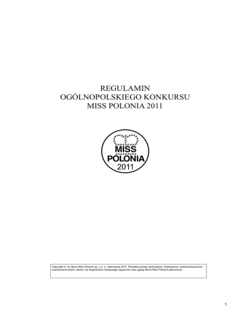 REGULAMIN OGÓLNOPOLSKIEGO KONKURSU MISS POLONIA 2011 Copyright © by Biuro Miss Polonia sp. z o. o., Warszawa 2011. Wszelkie prawa zastrzeżone. Kopiowanie, przedrukowywanie i rozpowszechnianie całości lub fragmentów niniejszego regulaminu bez zgody Biura Miss Polonia zabronione. 1 §1 Postanowienia ogólne 1. Regulamin Ogólnopolskiego Konkursu Miss Polonia 2011 określa sposób i warunki przeprowadzenia Ogólnopolskiego Konkursu Miss Polonia 2011 i może być integralną częścią każdej umowy zawartej pomiędzy Biurem Miss Polonia Spółka z ograniczoną odpowiedzialnością z siedzibą w Warszawie przy ul. Kierbedzia 4, 00-728 Warszawa oraz: Uczestniczką Ogólnopolskiego Konkursu Miss Polonia 2011, zgodnie z § 2 pkt 21 niniejszego Regulaminu, Współorganizatorem, zgodnie z § 2 pkt 20. Regulaminu, Telewizją współorganizującą Ogólnopolski Konkurs Miss Polonia 2011. 2. Każda czynność sprzeczna z Regulaminem jest nieważna. W przypadku zaistnienia sprzeczności pomiędzy postanowieniami umów, o których mowa powyżej, a Regulaminem, odpowiednie postanowienia danej umowy tracą moc, a w ich miejsce obowiązują postanowienia niniejszego Regulaminu. Wszelkie zmiany w Regulaminie wymagają formy pisemnej i uchwały Zarządu Spółki Biuro Miss Polonia. §2 Definicje Użyte w niniejszym Regulaminie określenia mają następujące znaczenie: 1. Organizator Biuro Miss Polonia Spółka z ograniczoną odpowiedzialnością, z siedzibą w Warszawie, kod pocztowy 00 – 728, ul. Kierbedzia 4, organizator i wyłączny właściciel Ogólnopolskiego Konkursu Miss Polonia, wpisana do Rejestru Przedsiębiorców prowadzonego przez Sąd Rejonowy XIII Wydział Gospodarczy Krajowego Rejestru Sądowego w Warszawie pod numerem KRS 0000064578, kapitał zakładowy 51 000, 00 PLN, legitymująca się NIP 522-000-12-34 Dane korespondencyjne: Biuro Miss Polonia Sp. z o.o. Ul. Kierbedzia 4 00 - 728 Warszawa tel. (+48 22) 851 – 84 – 71 , 851 – 84 – 70, Fax. (+48 22) 851 – 42 – 49 e-mail: [email protected] www: www.misspolonia.com.pl. 2. Ankieta Uczestniczki Kwestionariusz określony w załączniku nr 1 do Regulaminu składany przez Uczestniczkę u odpowiedniego Organizatora Regionalnego. 3. Członek Rodziny Uczestniczki Rodzice, rodzeństwo i jego małżonkowie, ojczym, macocha, zstępni rodzeństwa, rodzeństwo rodziców Uczestniczki, 4. Ćwierćfinalistka Uczestniczka Wyborów Ćwierćfinałowych, 5. Dzika Karta Udzielona wyłącznie przez przedstawiciela Organizatora, obecnego w Jury Wyborów Regionalnych lub Wojewódzkich, uprawnia Uczestniczki do udziału w kolejnej eliminacji konkursu, 6. Finalistka Uczestniczka Finału Konkursu, 7. Finał Konkursu Etap Konkursu, w którym, decyzją Jury, wybierana jest jego Zwyciężczyni oraz zdobywczynie drugiego i trzeciego miejsca w Konkursie. 8. Jury Konkursu Osoby powoływane decyzją Organizatora lub Współorganizatorów do 2 dokonania wyboru Laureatek Konkursu na poszczególnych jego Etapach w składach: Jury Wyborów Regionalnych, Jury Wyborów Ćwierćfinałowych, Jury Wyborów Półfinałowych, Jury Finału Konkursu. 9. Kadencja Laureatki Konkursu Okres od daty wyboru Laureatki danego Etapu Konkursu do dnia wyboru jej bezpośredniej następczyni. 10. Konkurs Ogólnopolski Konkurs Miss Polonia 2011, 11. Laureatka Konkursu Zdobywczyni przynajmniej jednego z tytułów wymienionych w § 6 i Załączniku Nr 2 do Regulaminu. 12 Miss Polonia 2011 Zwyciężczyni Konkursu. 13. Miss Polonia Regionu 2011 Zwyciężczyni odpowiednich Wyborów Regionalnych, zgodnie Z załącznikiem nr 2 do Regulaminu. 14. Miss Polonia Województwa 2011 15. Organizator Regionalny Zwyciężczyni odpowiednich Wyborów Wojewódzkich, zgodnie Z załącznikiem nr 2 do Regulaminu Każda osoba fizyczna, osoba prawna, jednostka organizacyjna nieposiadająca osobowości prawnej, z którą Organizator zawarł stosowną umowę o organizację Wyborów Regionalnych i udzielił na piśmie licencji na wykorzystanie Znaków Towarowych. Ilekroć mowa o Współorganizatorze Konkursu należy przez to rozumieć również Organizatora Regionalnego. Organizatorem Regionalnym Wyborów Miss Polonia Warszawy 2011 i/lub Miss Polonia Mazowsza 2011 jest Organizator. 16. Oświadczenie Uczestniczki Oświadczenie o zapoznaniu się przez Uczestniczkę z Regulaminem Konkursu i zobowiązanie do jego przestrzegania, składane odpowiedniemu Organizatorowi Regionalnemu, 17. Półfinalistka Uczestniczka Wyborów Półfinałowych, 18. Regulamin Niniejszy Regulamin Konkursu, 19. Siła wyższa Zdarzenie o charakterze nadzwyczajnym niemożliwe do przewidzenia i zapobieżenia, a w szczególności: działanie sił przyrody, wojna, strajki, lokauty, awarie w dostawie energii, akty władzy państwowej, samorządowej 20. Telewizja Stacja telewizyjna, z którą Organizator zawarł Umowę o Współpracy dotyczącą organizacji Finału Konkursu oraz udzielił stosownych licencji i pozwoleń, 21. Umowa Impresaryjna Umowa zawarta pomiędzy Uczestniczką a Organizatorem, określająca zasady współpracy impresaryjnej na zasadach wyłączności pomiędzy Organizatorem, a Uczestniczką z tytułu udziału Uczestniczki w Konkursie, stanowiąca załącznik nr 5+ do Regulaminu 22. Umowa o Współpracy Umowa zawarta w formie pisemnej pod rygorem nieważności pomiędzy Organizatorem a Współorganizatorem Konkursu dla realizacji uzgodnionego Etapu Konkursu, 23. Uczestniczka Każda dziewczyna biorąca udział, w co najmniej jednym z Etapów Konkursu, spełniająca warunki określone w Regulaminie. Ilekroć mowa o Uczestniczce Konkursu rozumie się przez to również Miss Polonia 2011, I Wicemiss Polonia 2011, II Wicemiss Polonia 2011. Każda osoba fizyczna, osoba prawna, jednostka organizacyjna nieposiadająca osobowości prawnej, z którą Organizator zawarł stosowną 24. Współorganizator Konkursu 3 25. Wybory Ćwierćfinałowe Umowę o Współpracy i udzielił na piśmie licencji na wykorzystanie Znaków Towarowych, Et