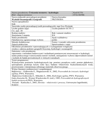 Nazwa przedmiotu: Ćwiczenia terenowe - hydrologia Blok